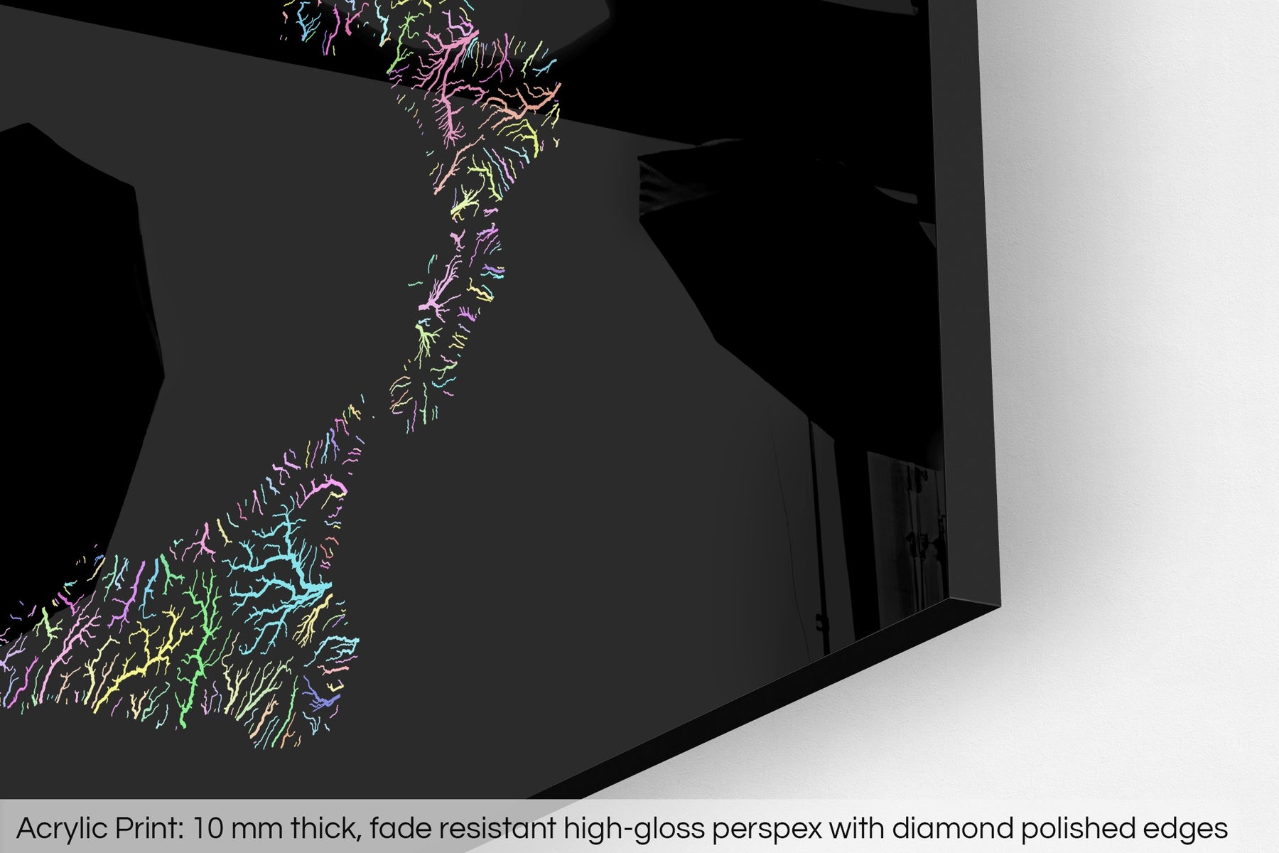 This high-resolution river basin map shows each catchment area in a different colour. Its vibrant colour scheme makes this map a lively addition to any space.