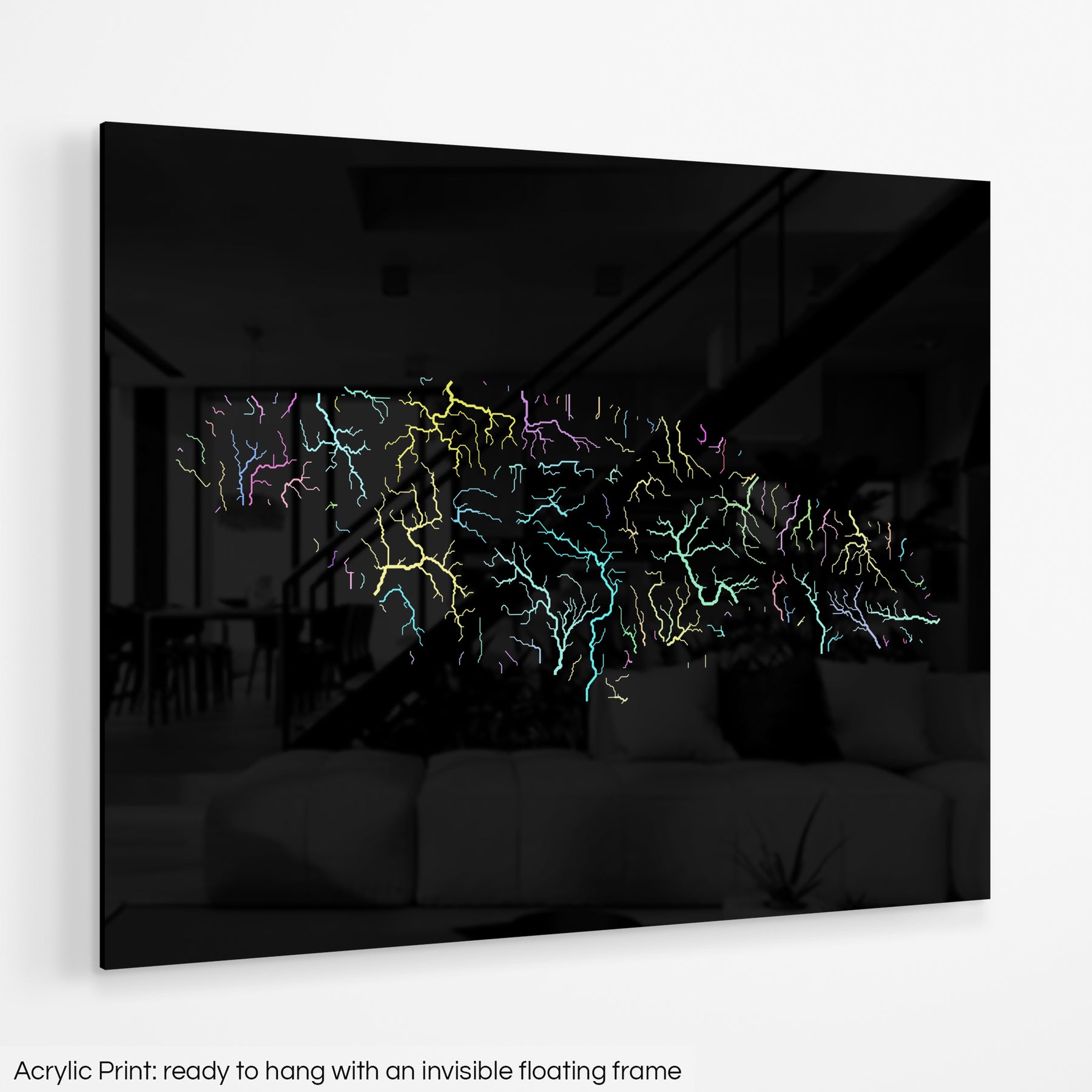 High resolution river basin map, showing each catchment area in a different colour. Thanks to its soft pastel tones the map fits well into most interiors.
