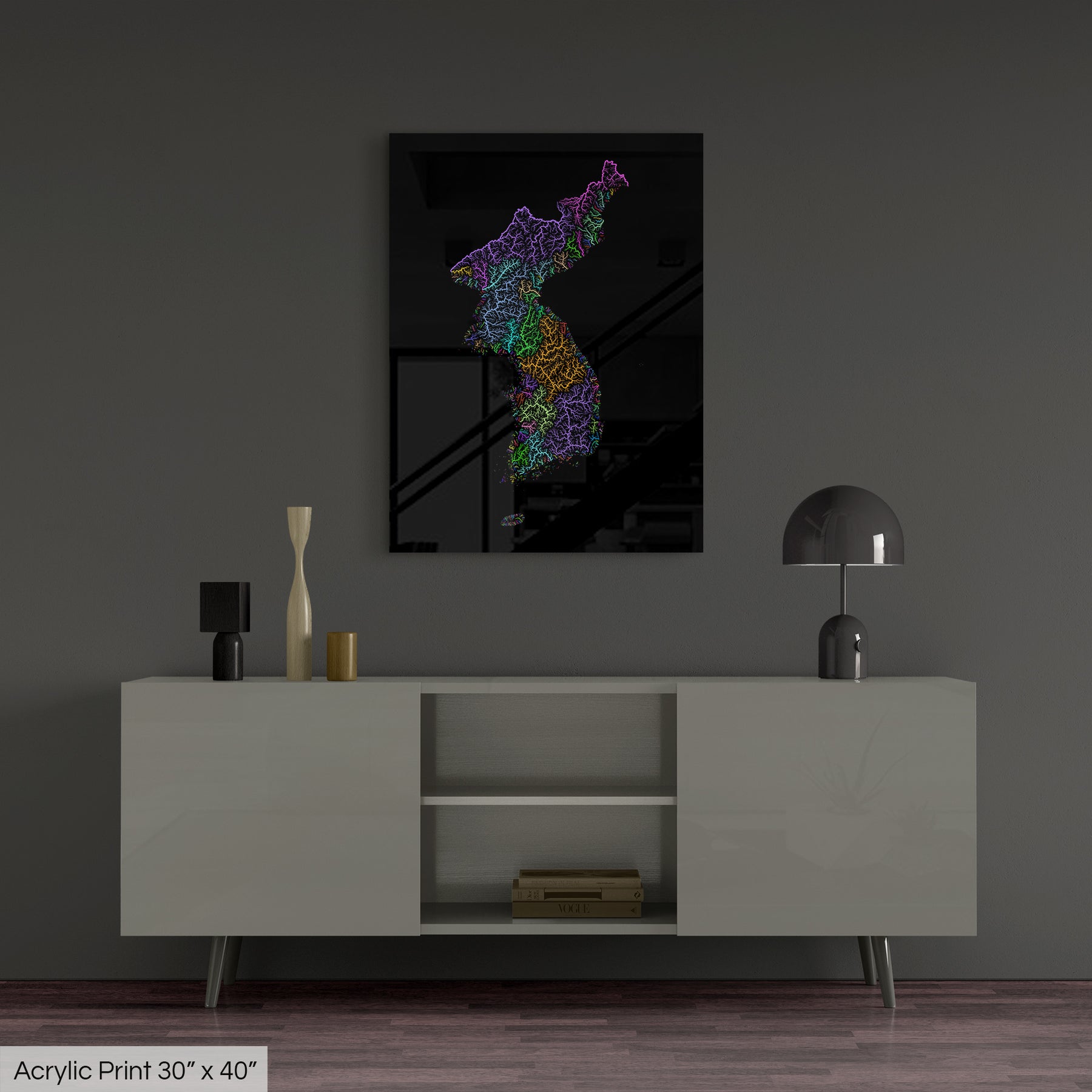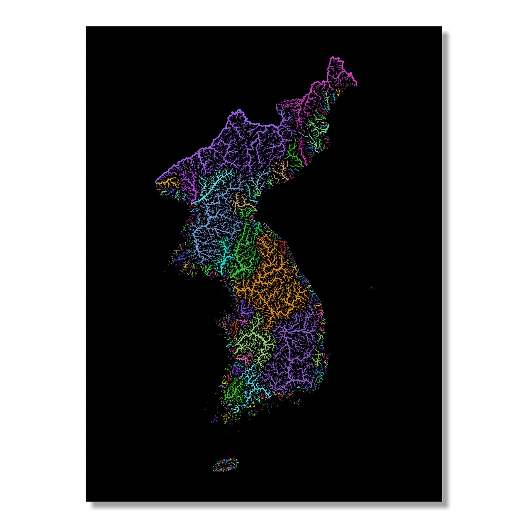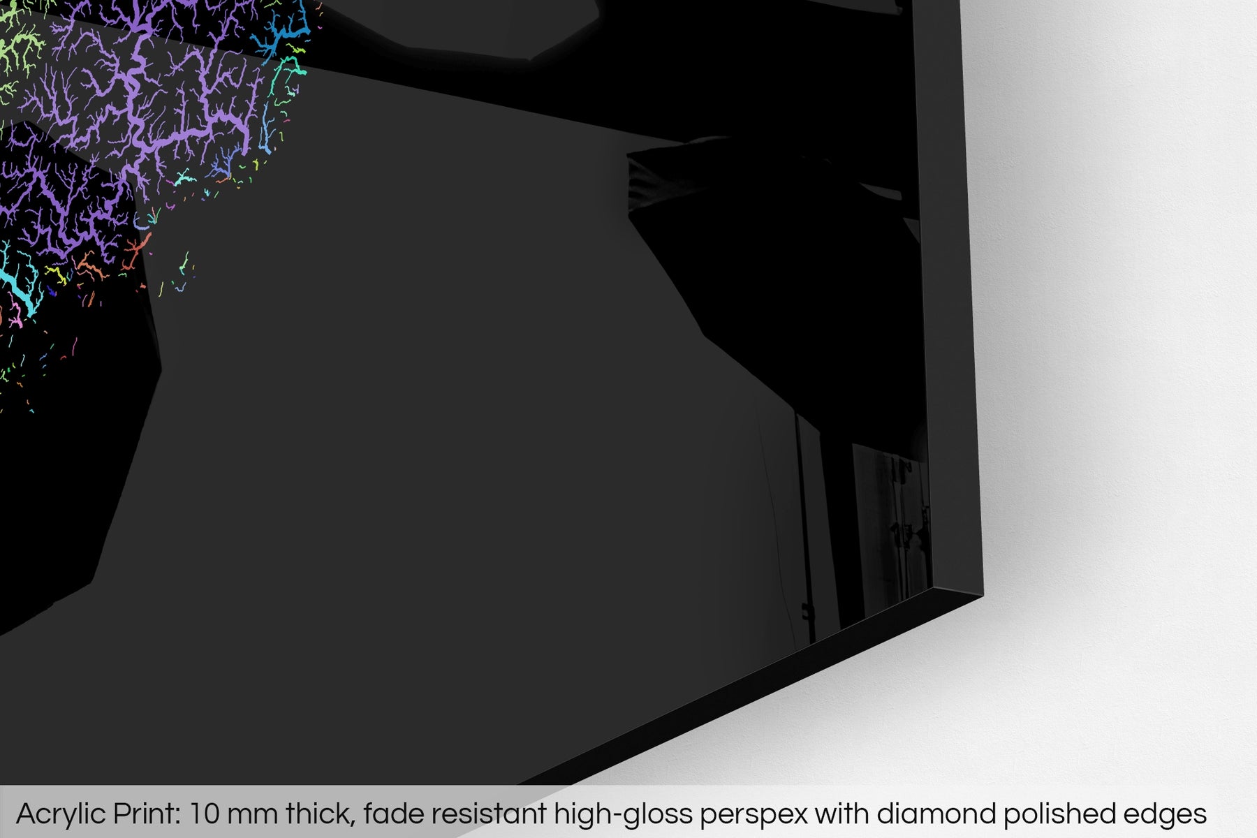 This high-resolution river basin map shows each catchment area in a different colour. Its vibrant colour scheme makes this map a lively addition to any space.