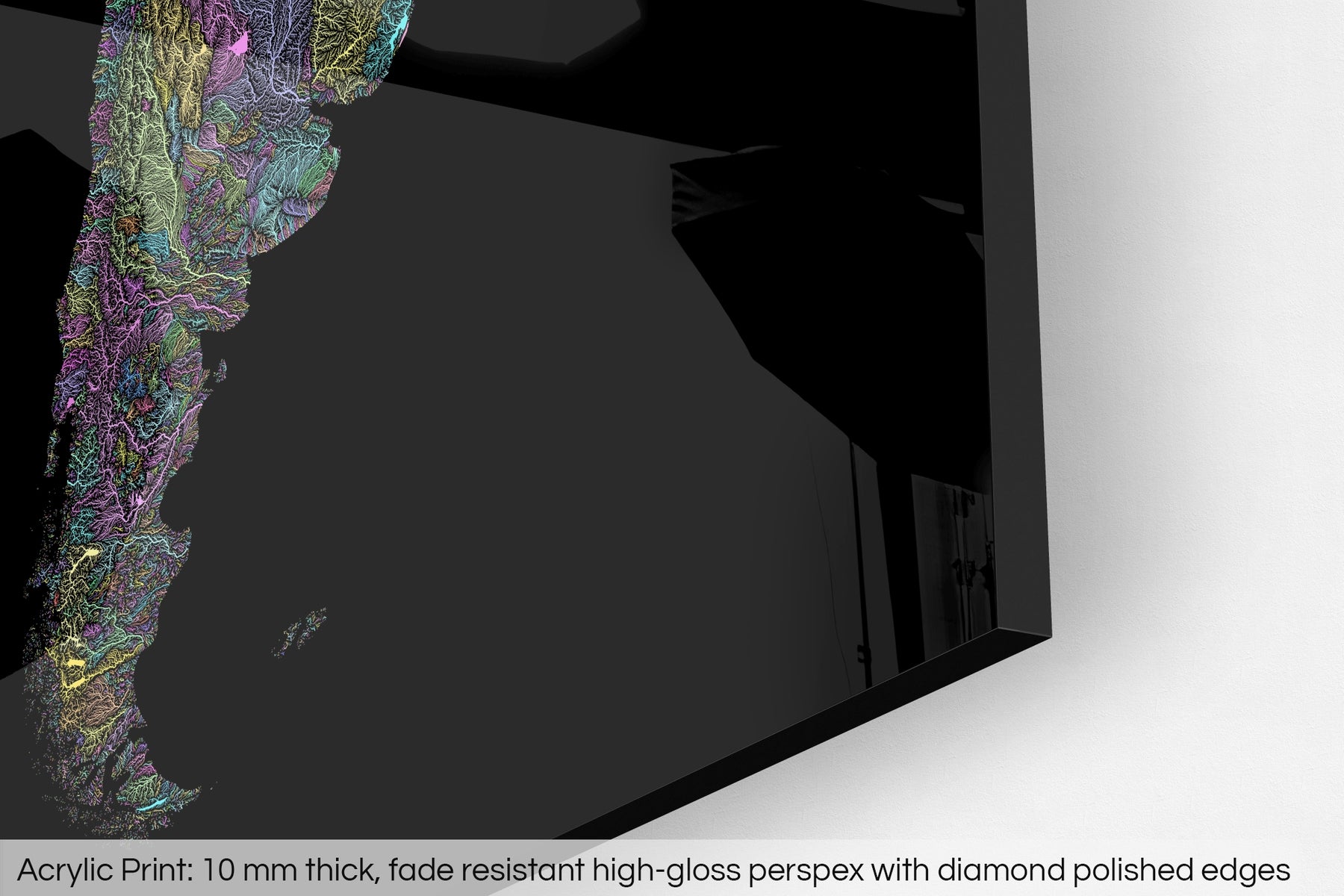 This high-resolution river basin map shows each catchment area in a different colour. Its vibrant colour scheme makes this map a lively addition to any space.
