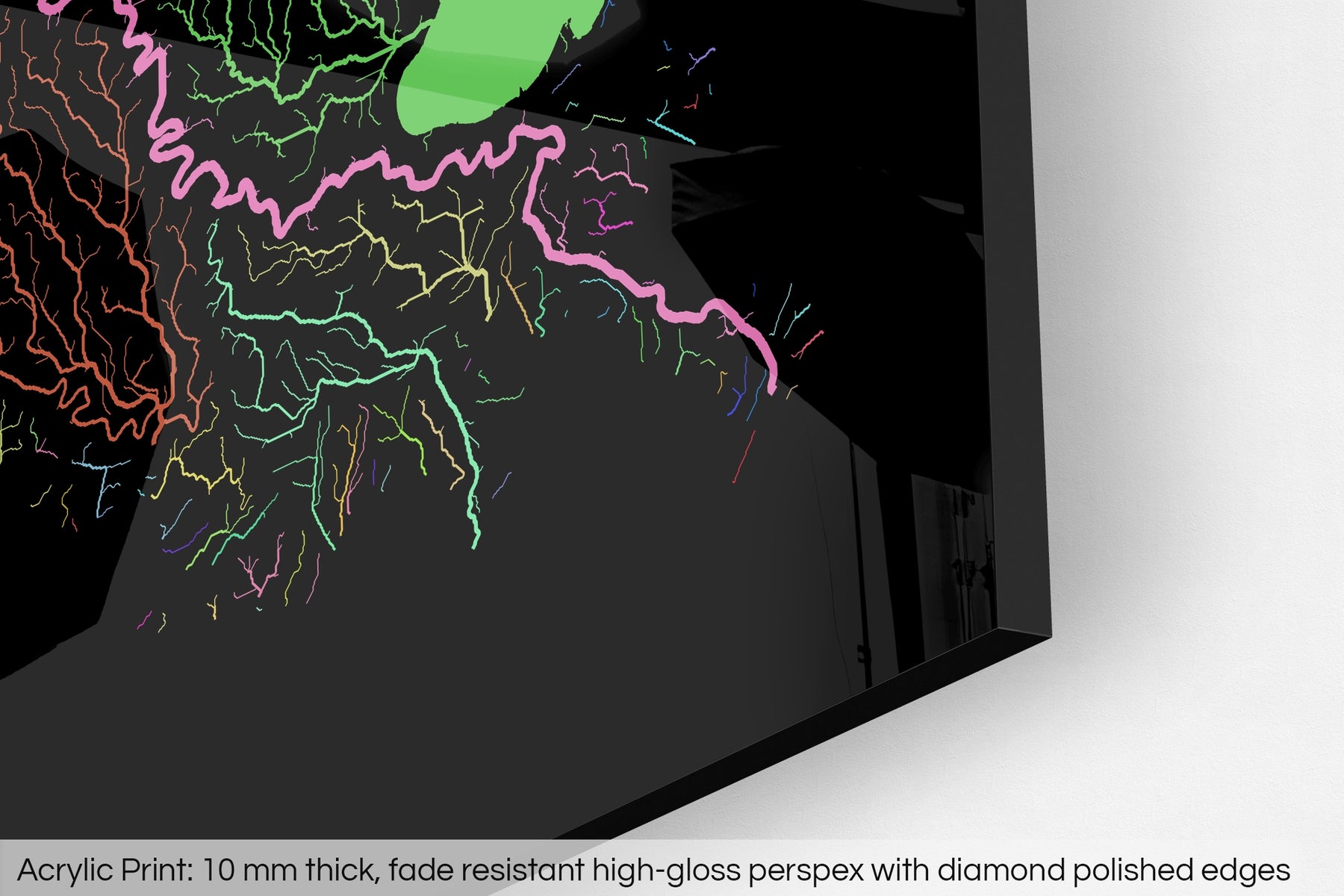 This high-resolution river basin map shows each catchment area in a different colour. Its vibrant colour scheme makes this map a lively addition to any space.