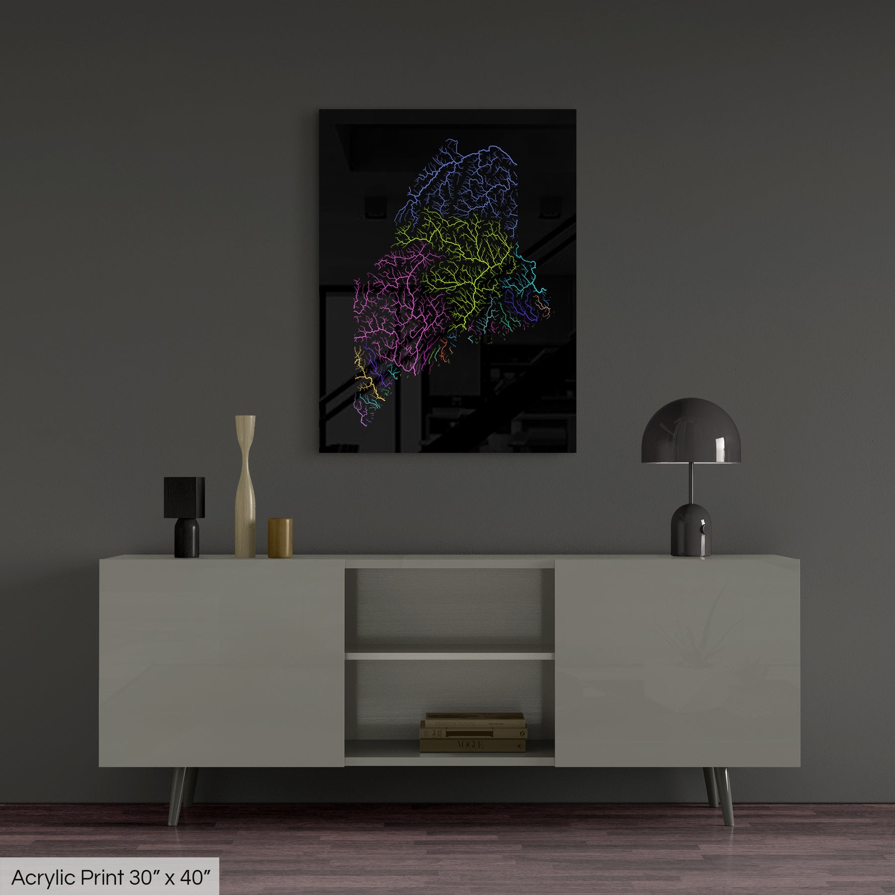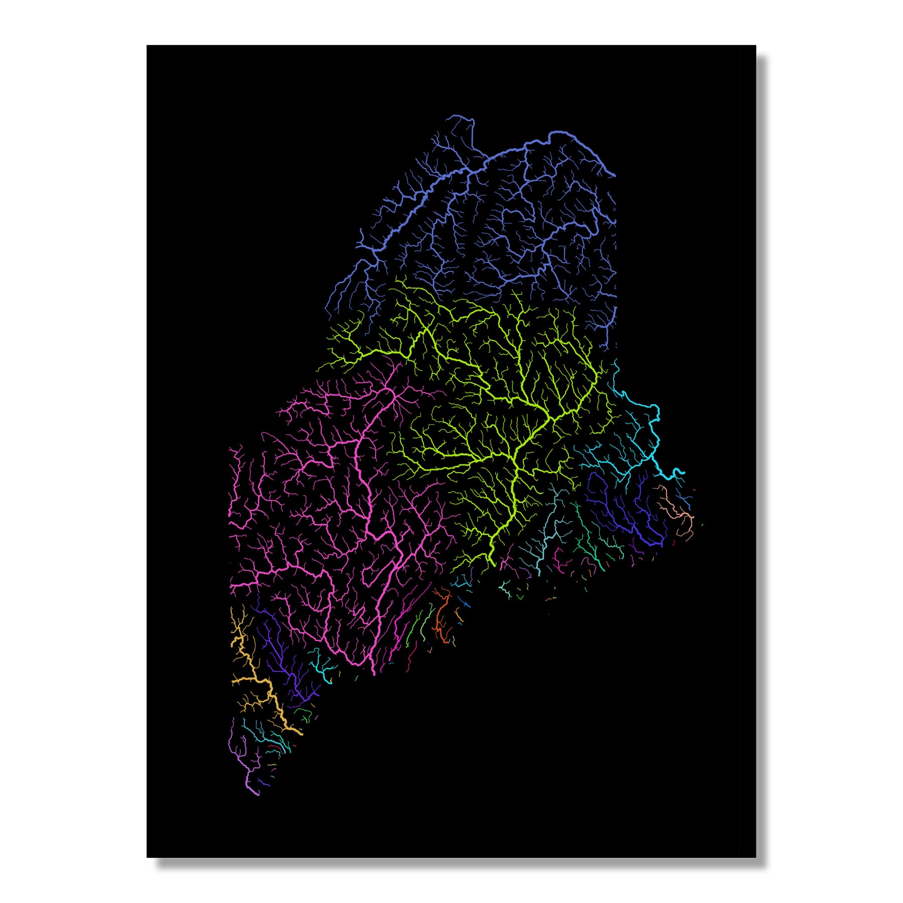 This high-resolution river basin map shows each catchment area in a different colour. Its vibrant colour scheme makes this map a lively addition to any space.