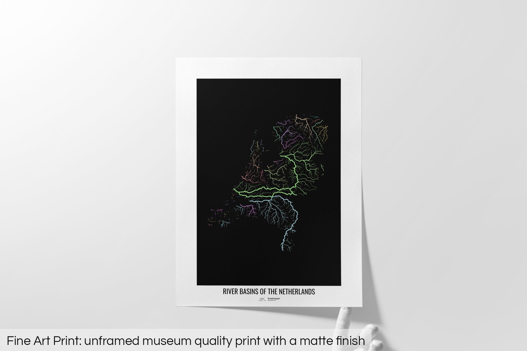 High resolution river basin map, showing each catchment area in a different colour. Thanks to its soft pastel tones the map fits well into most interiors.