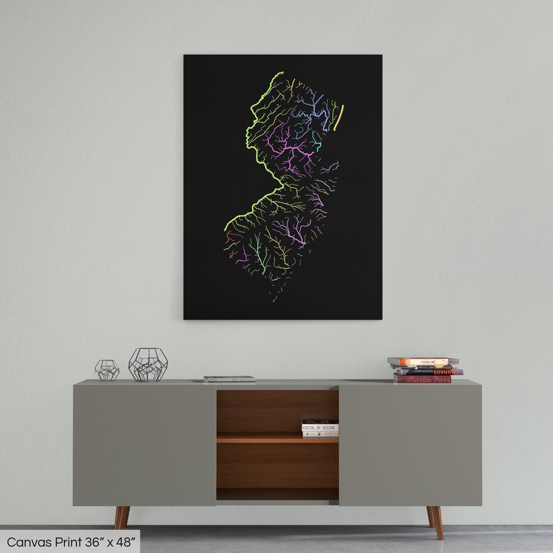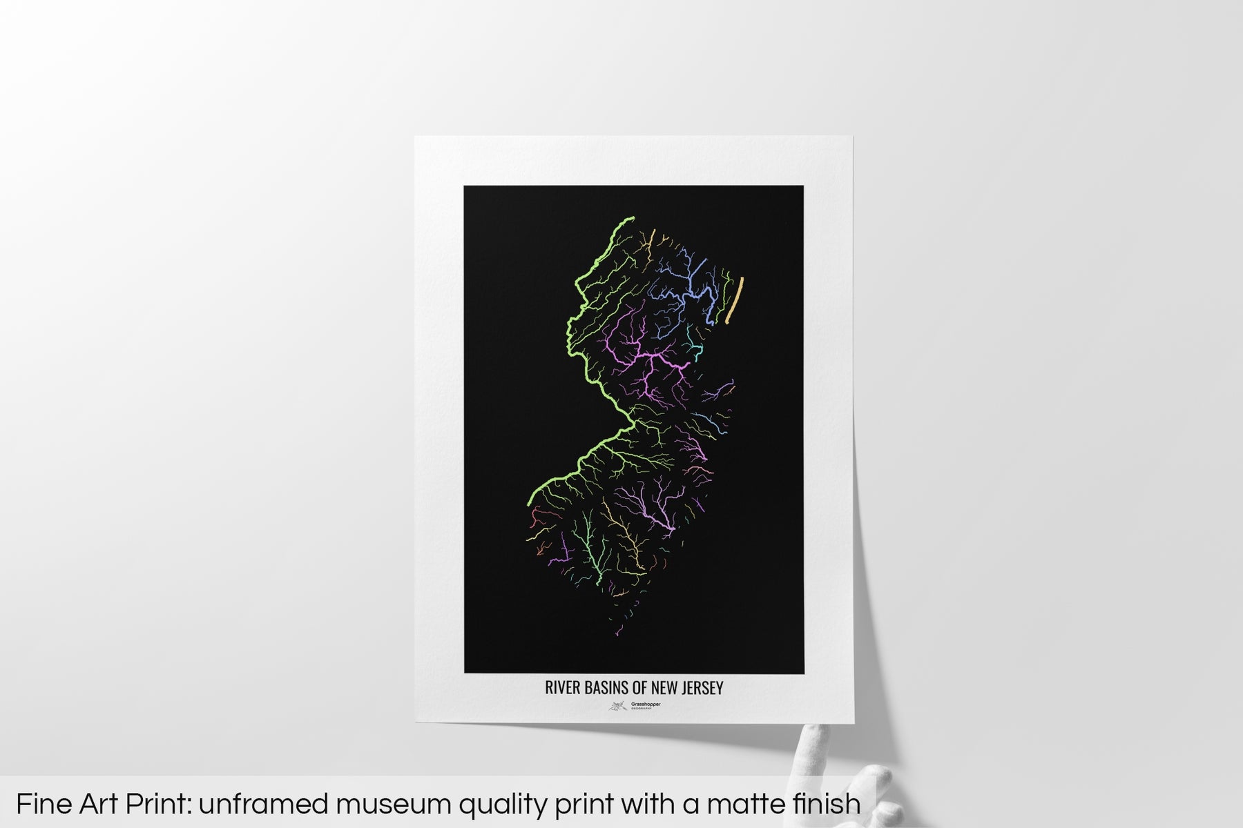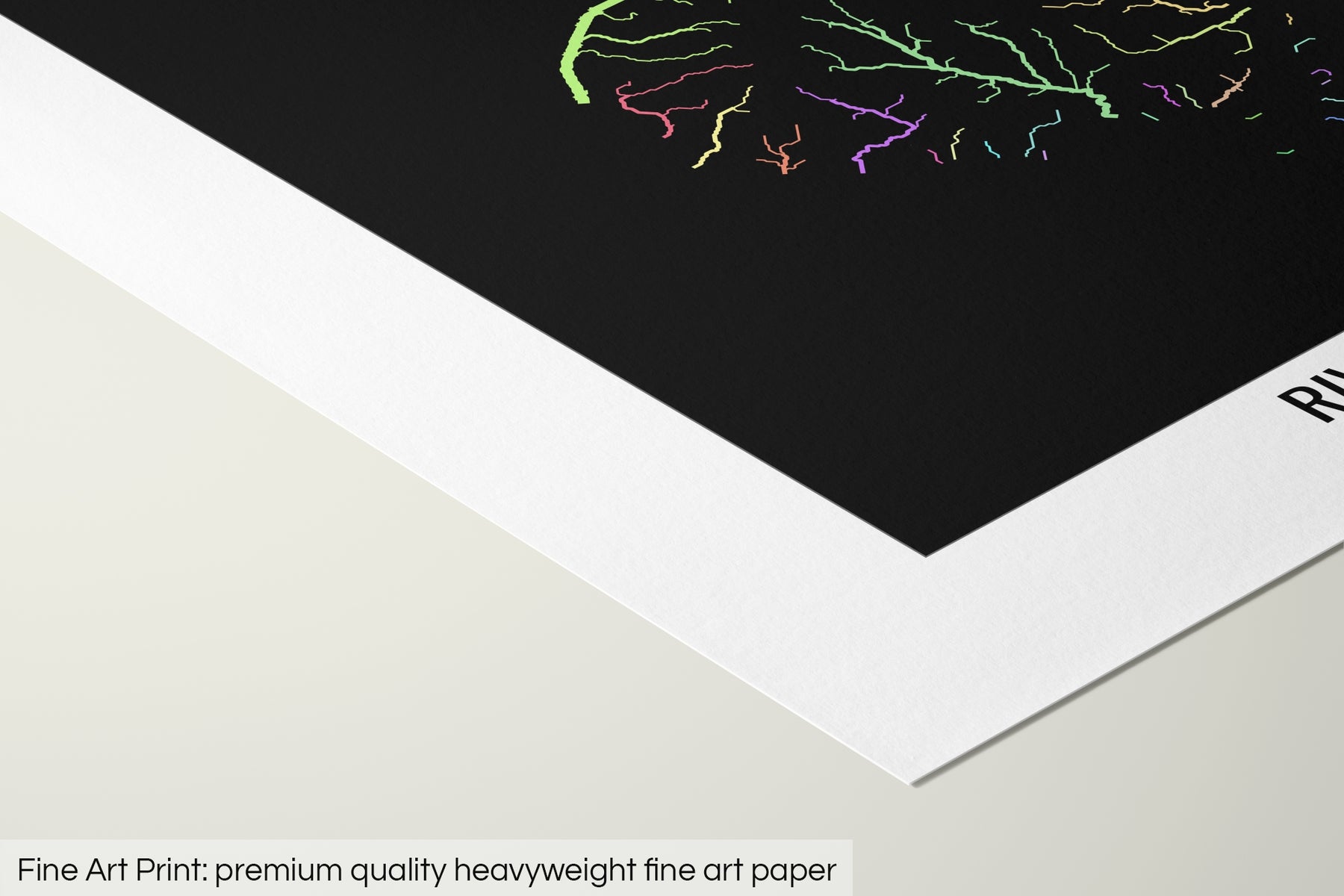 High resolution river basin map, showing each catchment area in a different colour. Thanks to its soft pastel tones the map fits well into most interiors.