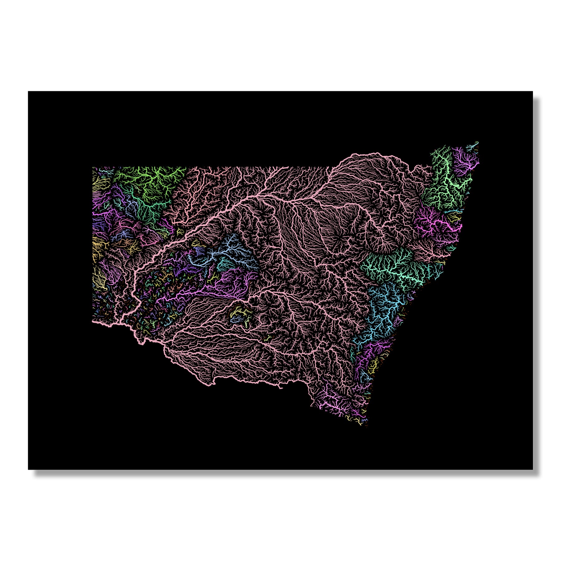 High resolution river basin map, showing each catchment area in a different colour. Thanks to its soft pastel tones the map fits well into most interiors.