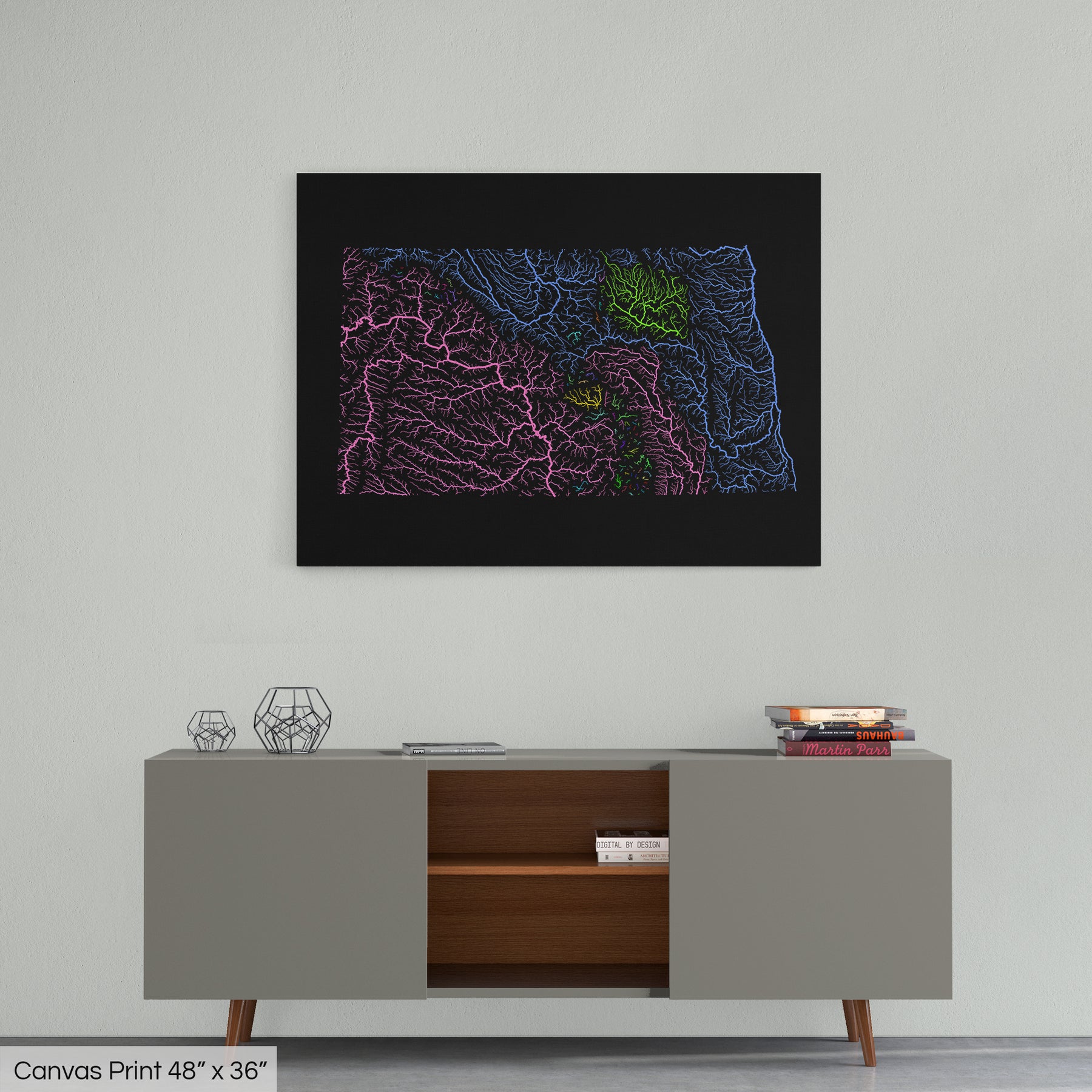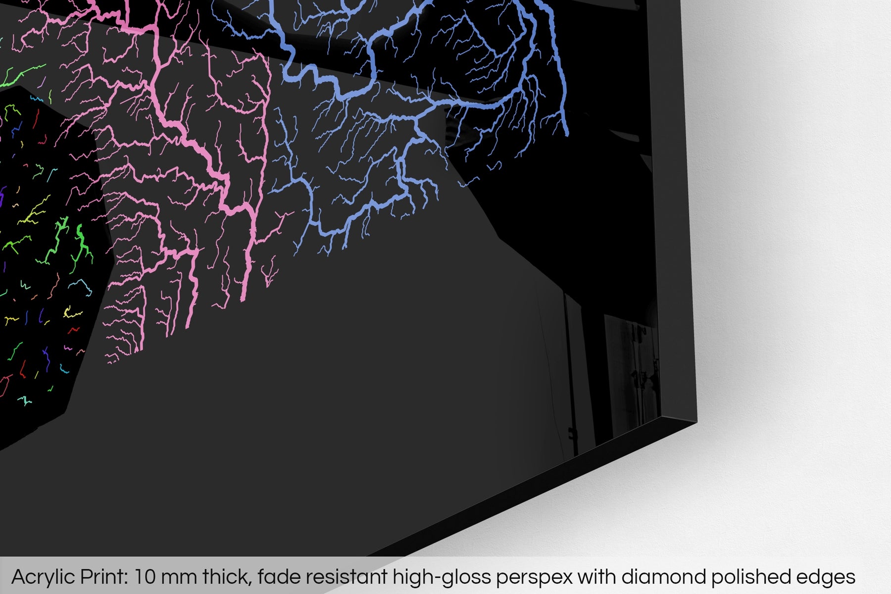 This high-resolution river basin map shows each catchment area in a different colour. Its vibrant colour scheme makes this map a lively addition to any space.