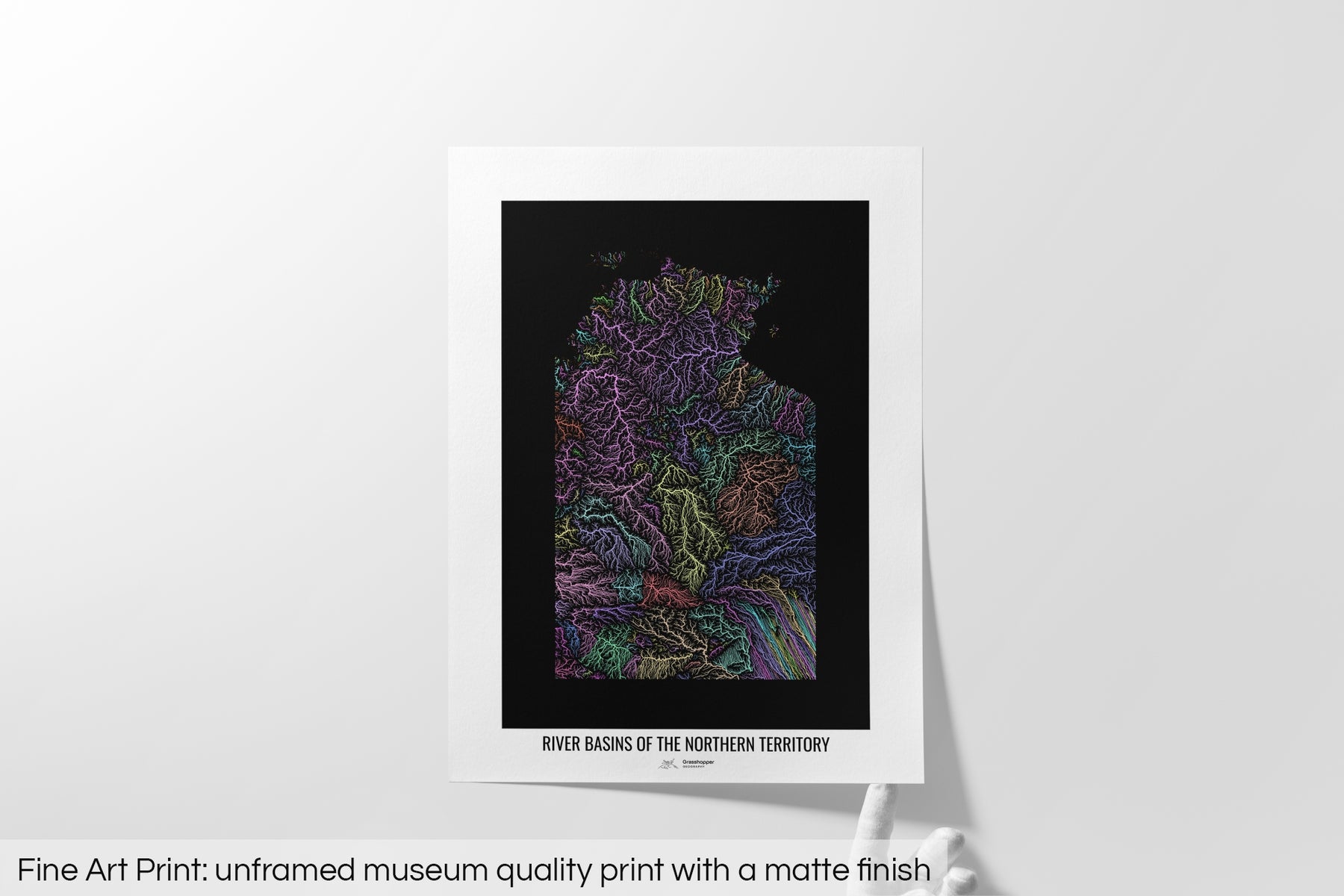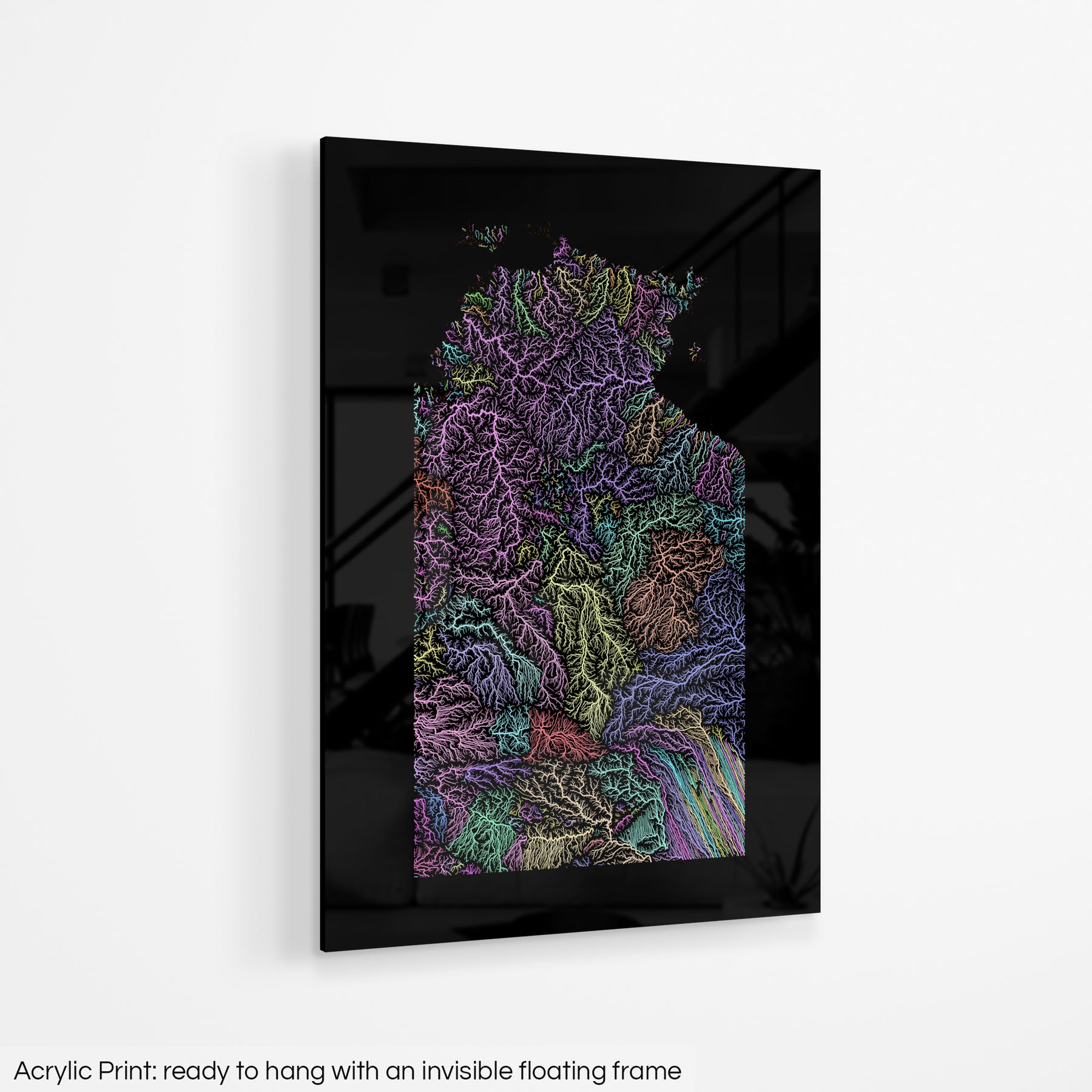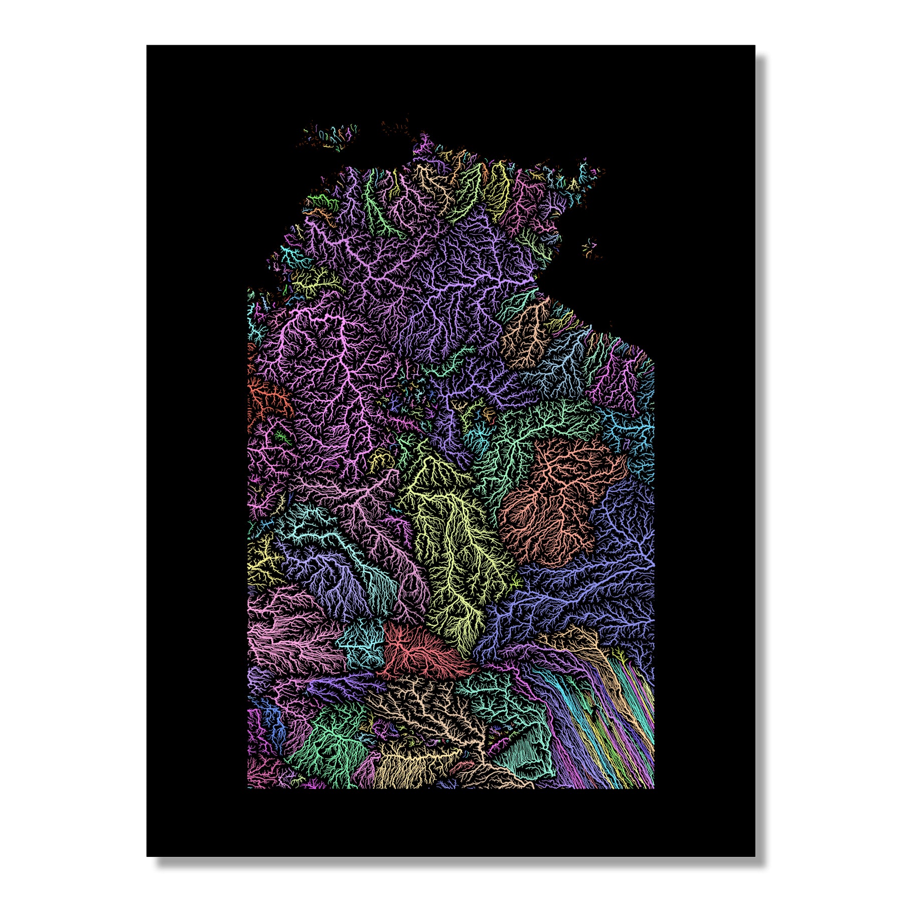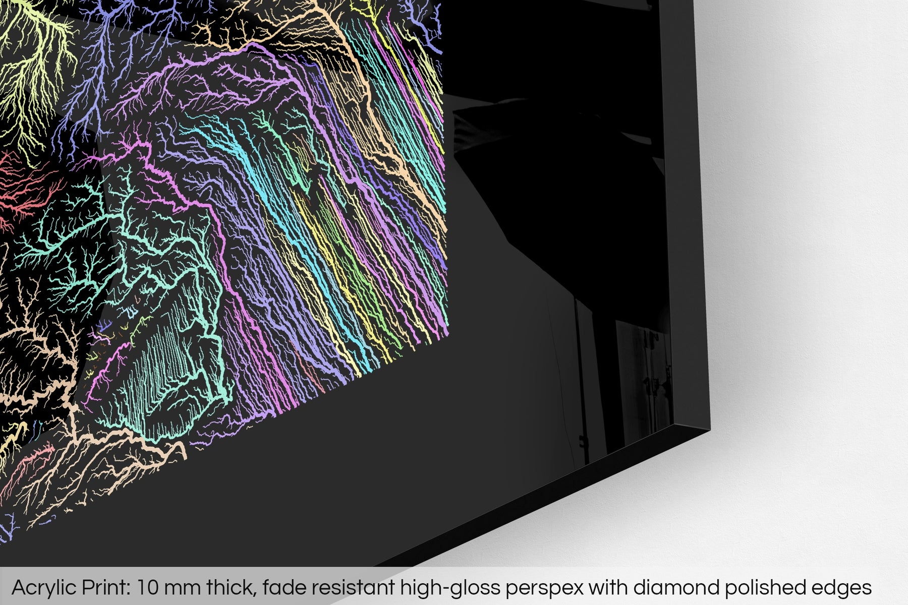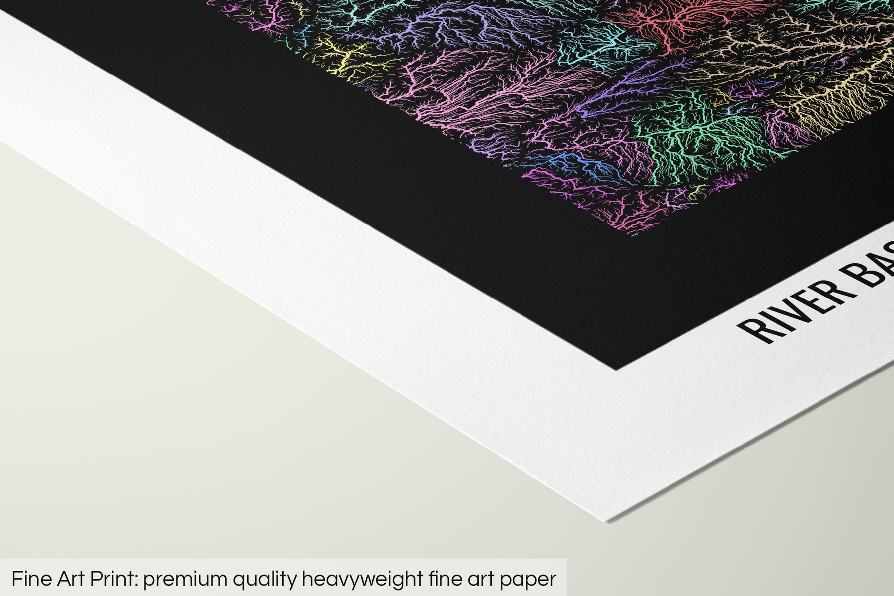 High resolution river basin map, showing each catchment area in a different colour. Thanks to its soft pastel tones the map fits well into most interiors.
