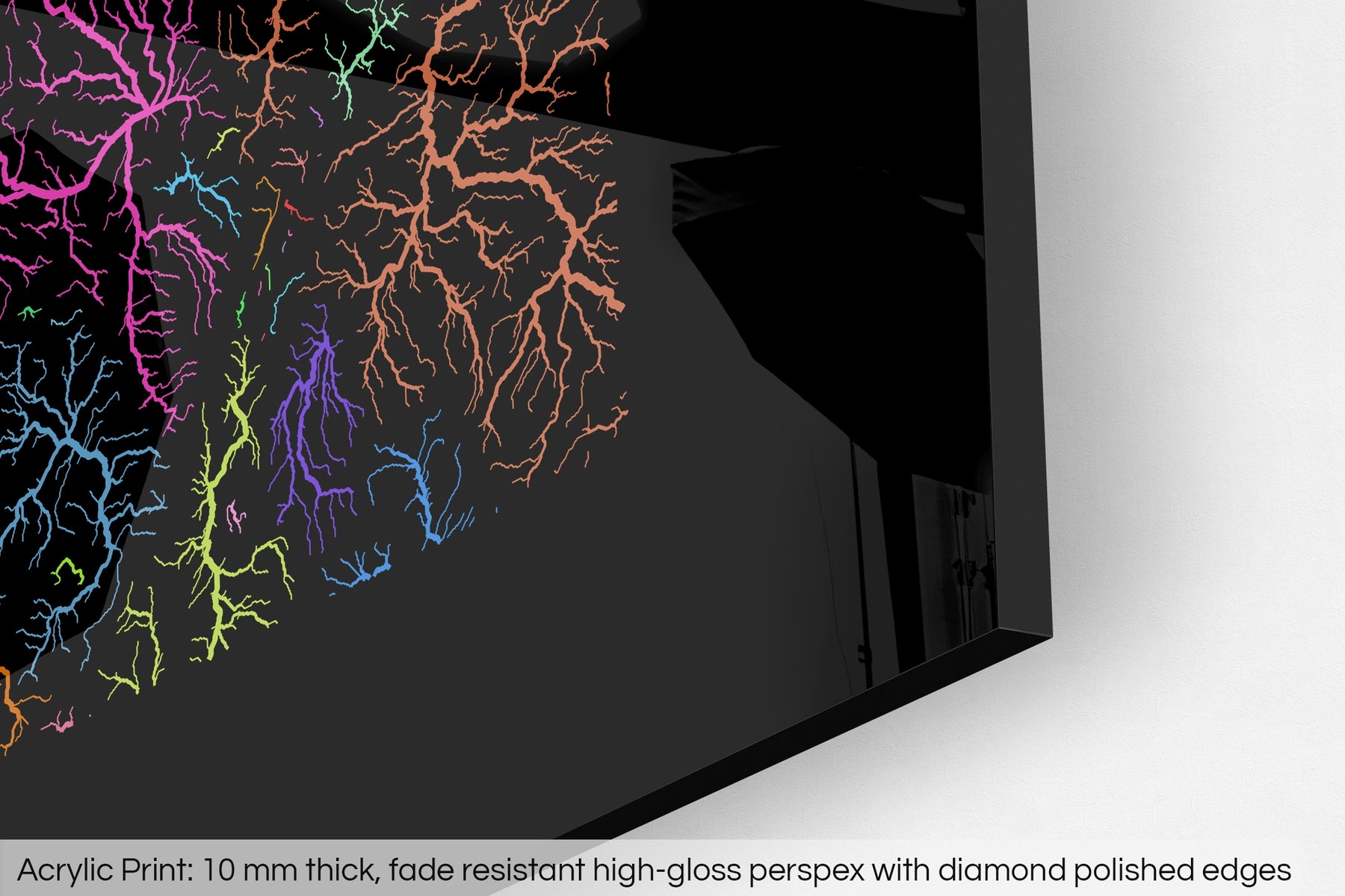 The fine art Giclée print is hand mounted onto a 10mm thick, premium polished, high-gloss acrylic glass that results in a vibrant finish. The transparency of the acrylic enhances the colours and details of the artwork, creating a stunning visual effect that will make a bold statement in any space.