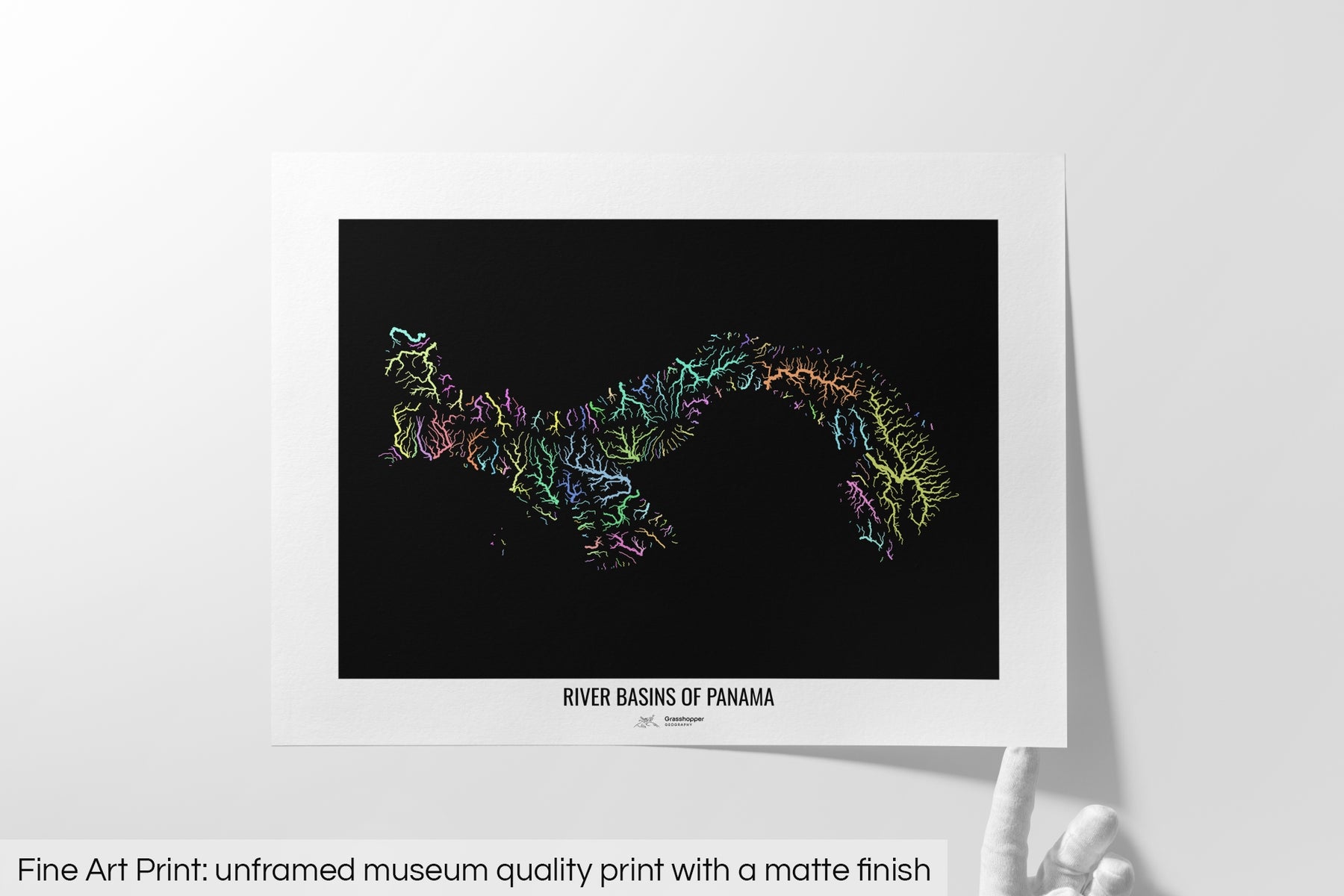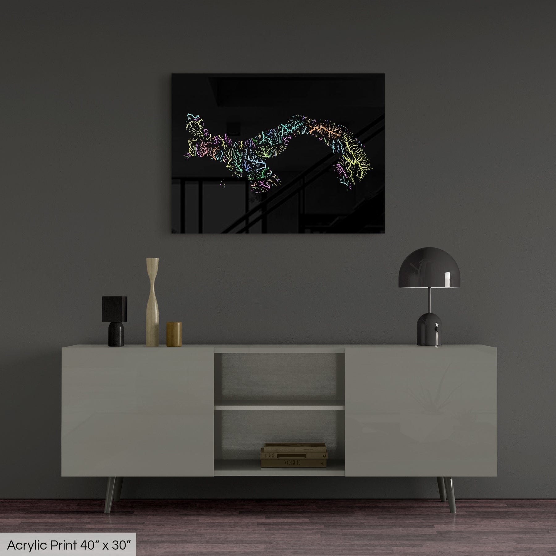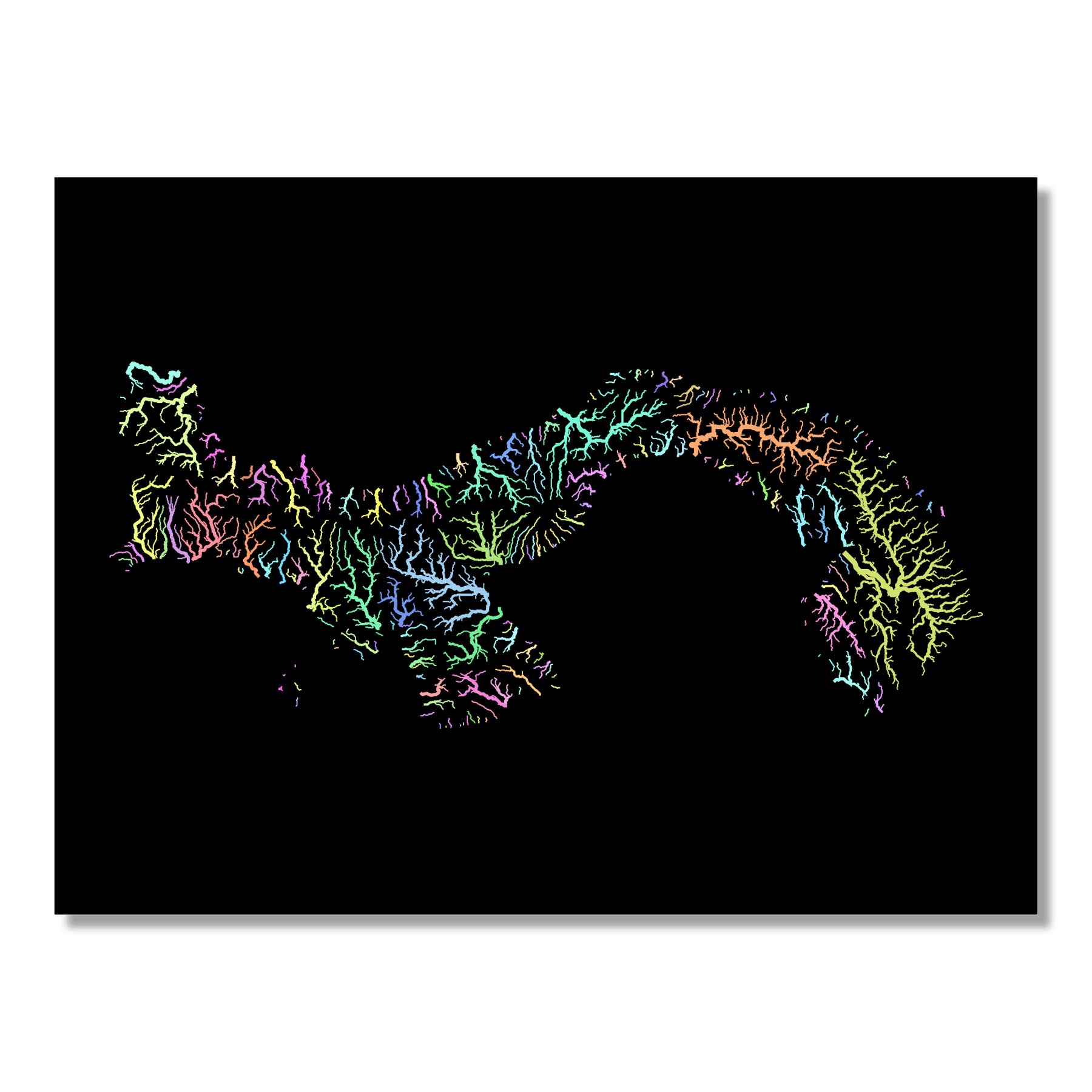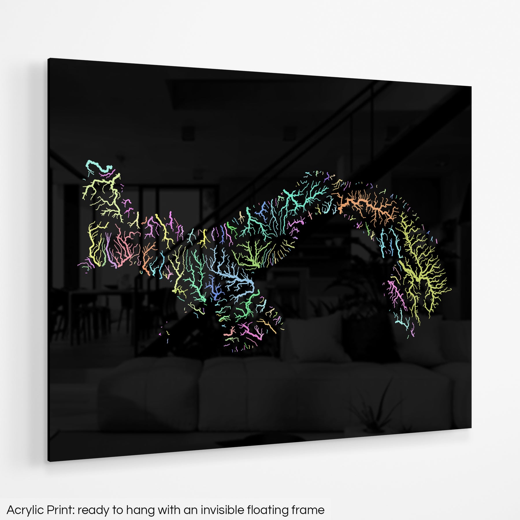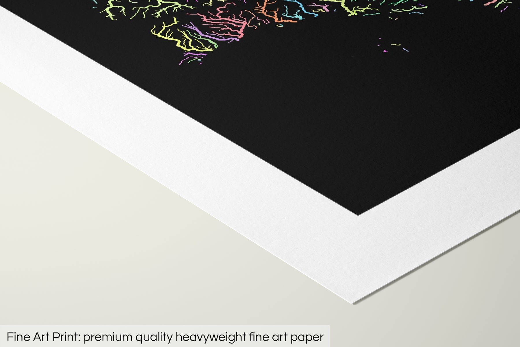 High resolution river basin map, showing each catchment area in a different colour. Thanks to its soft pastel tones the map fits well into most interiors.