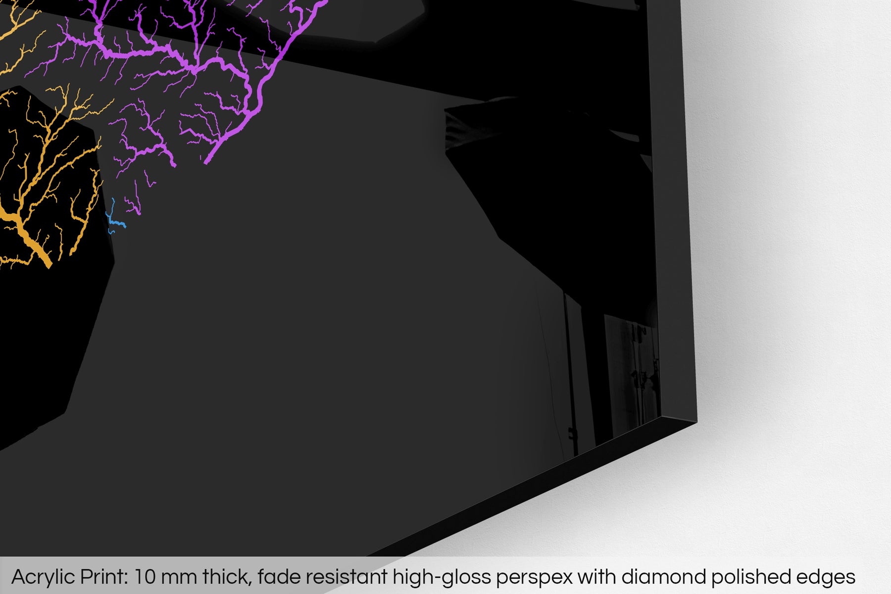 The fine art Giclée print is hand mounted onto a 10mm thick, premium polished, high-gloss acrylic glass that results in a vibrant finish. The transparency of the acrylic enhances the colours and details of the artwork, creating a stunning visual effect that will make a bold statement in any space.