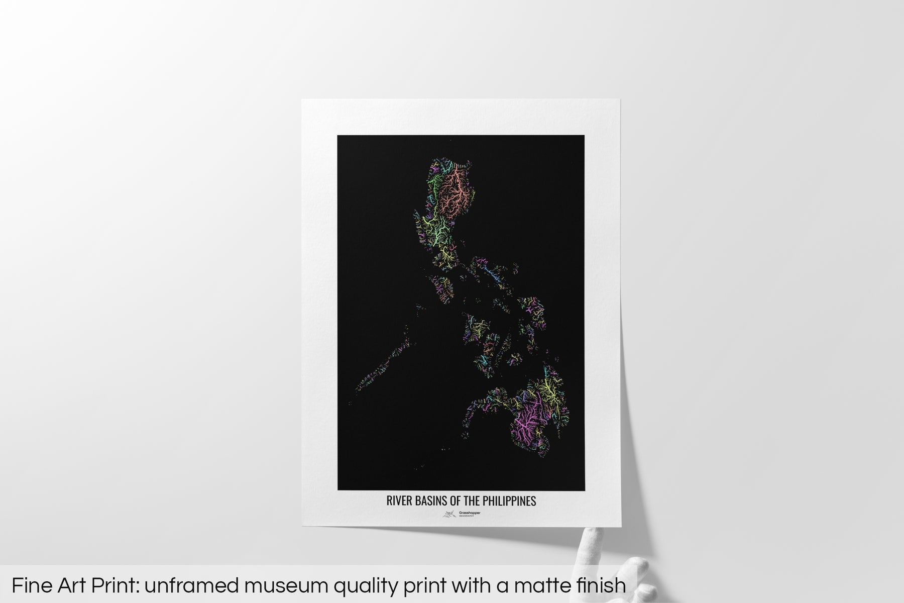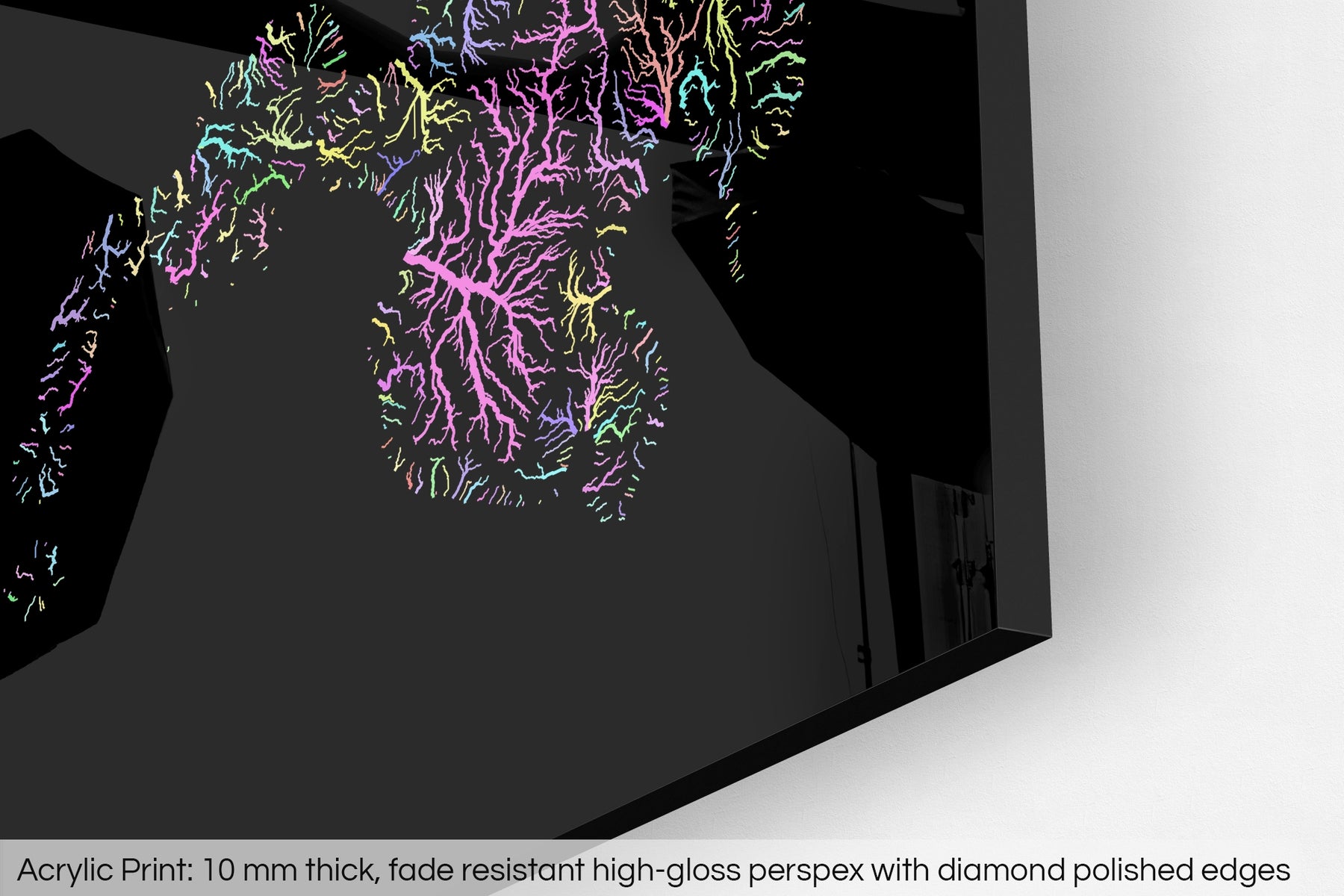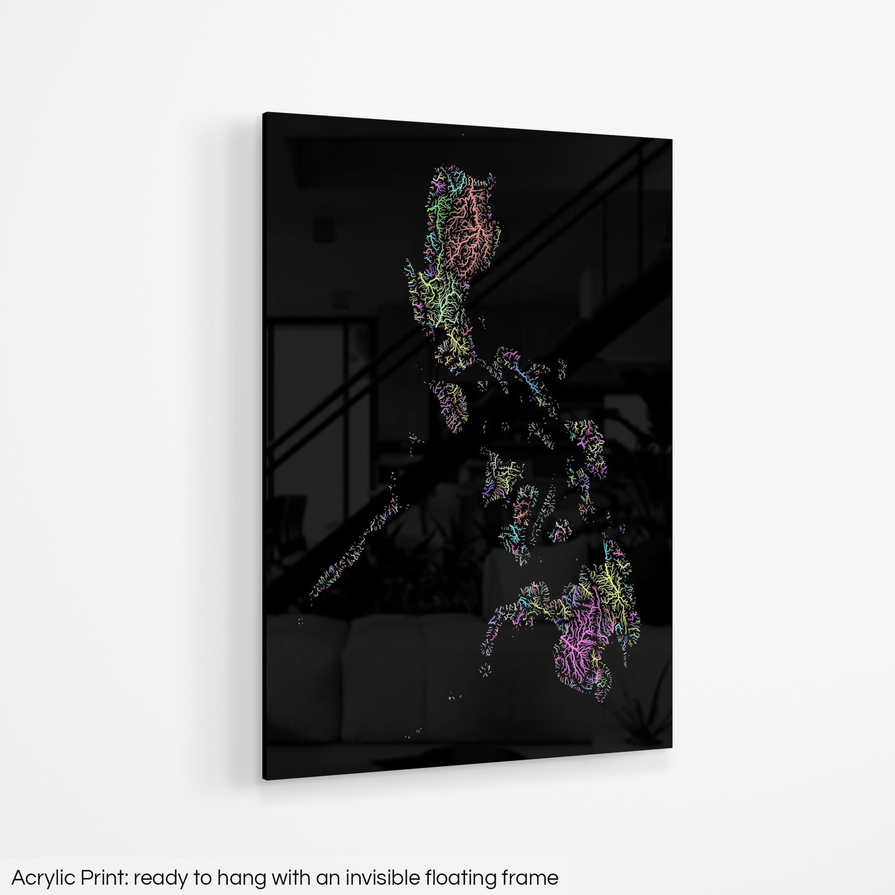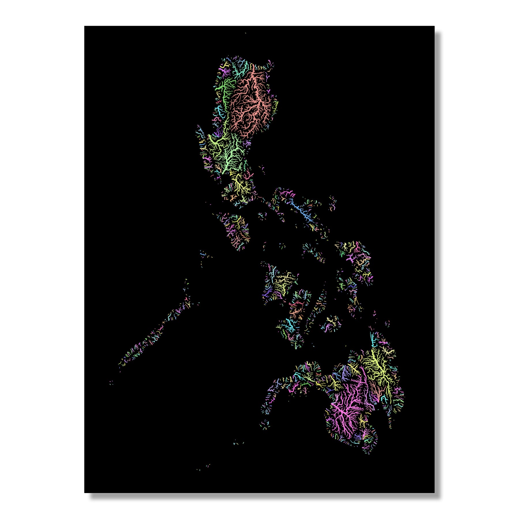High resolution river basin map, showing each catchment area in a different colour. Thanks to its soft pastel tones the map fits well into most interiors.
