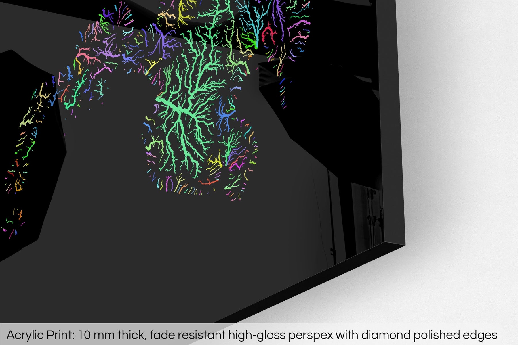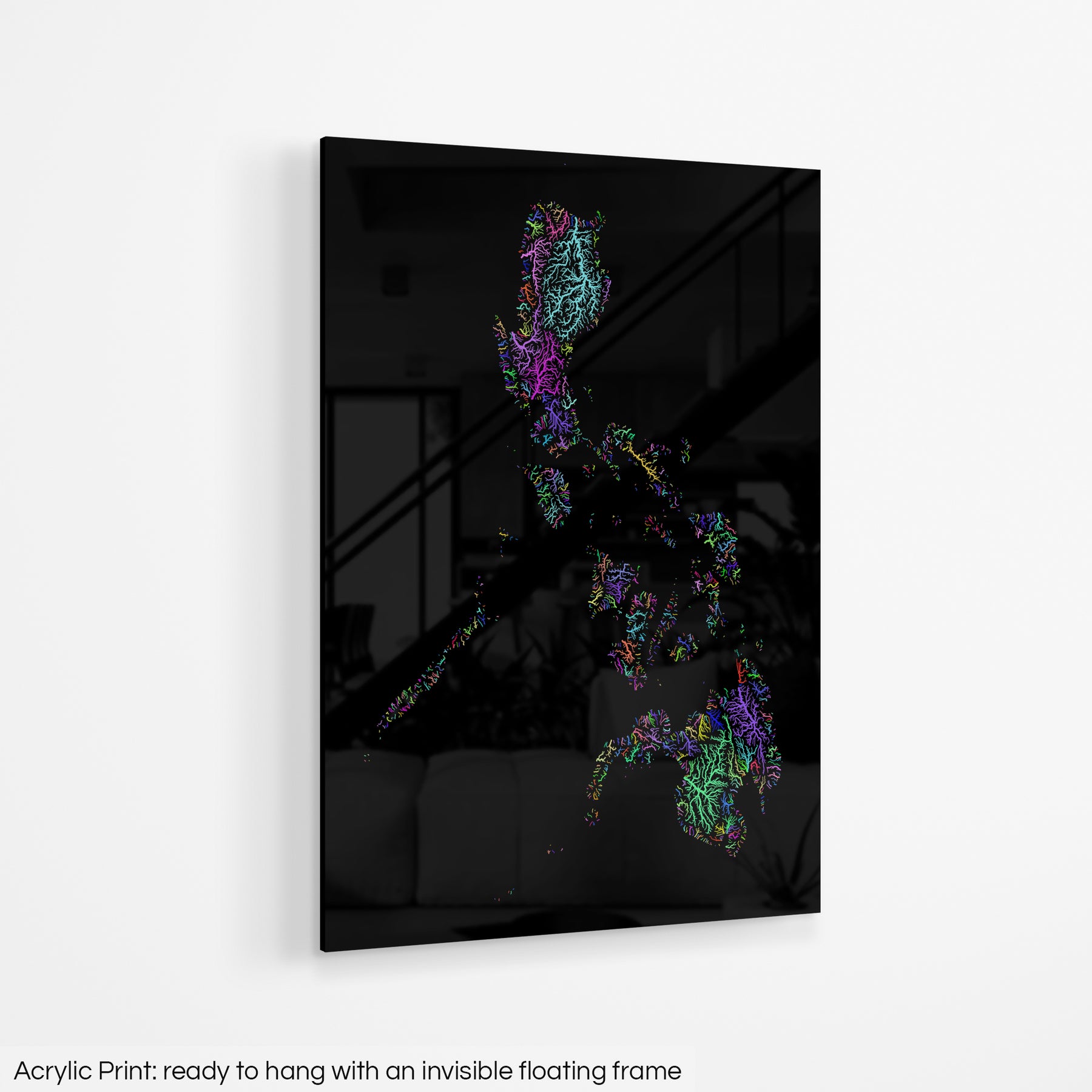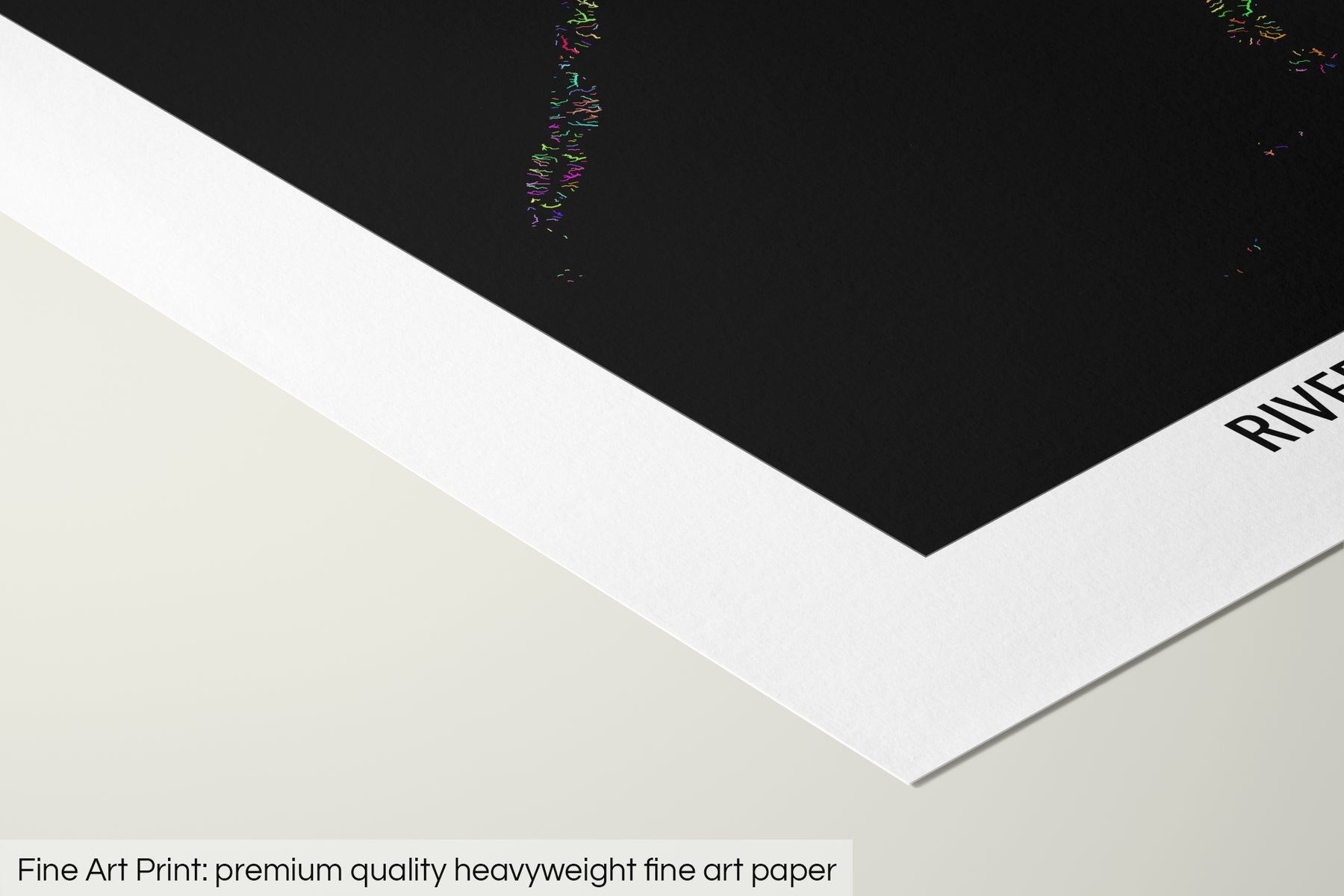 This high-resolution river basin map shows each catchment area in a different colour. Its vibrant colour scheme makes this map a lively addition to any space.