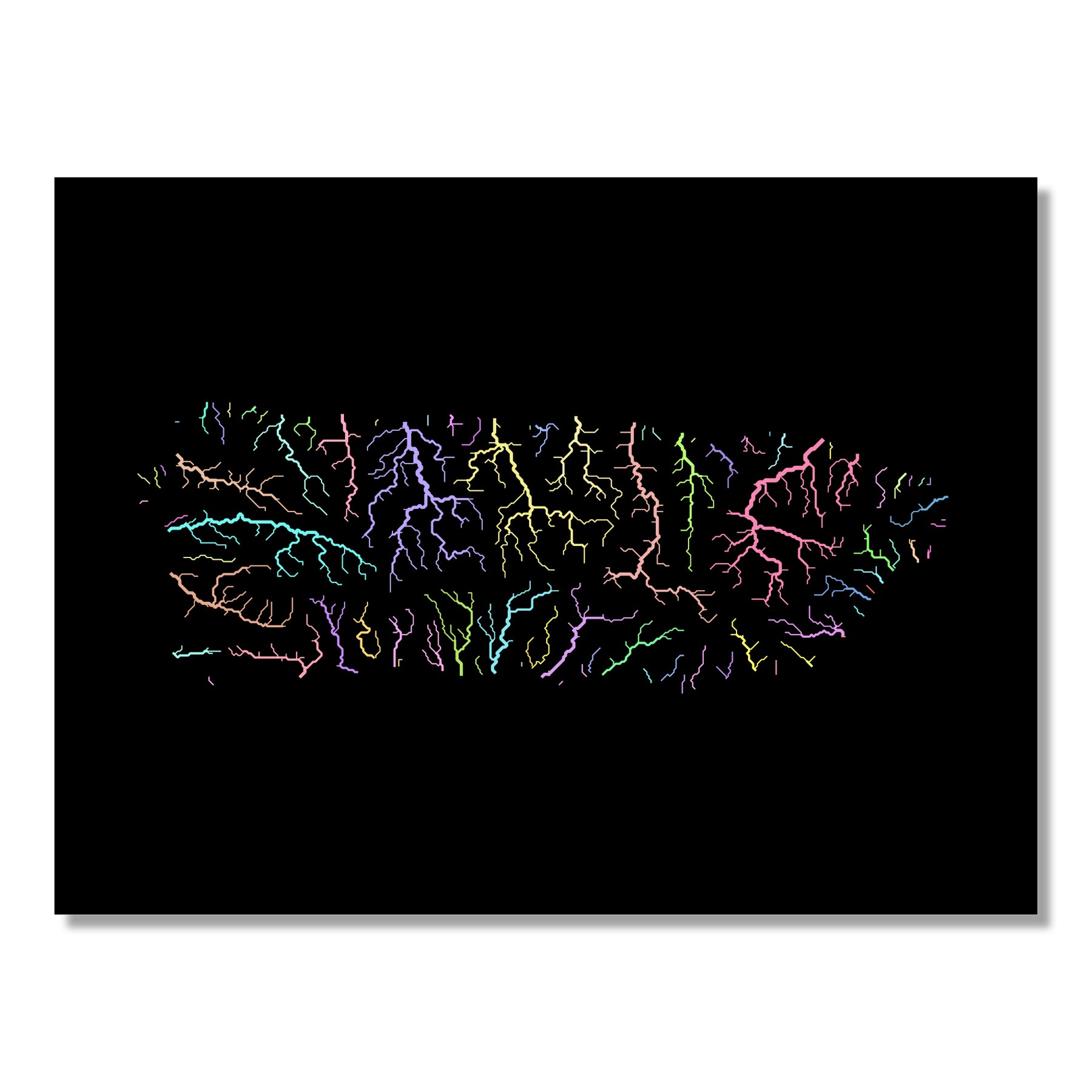 High resolution river basin map, showing each catchment area in a different colour. Thanks to its soft pastel tones the map fits well into most interiors.
