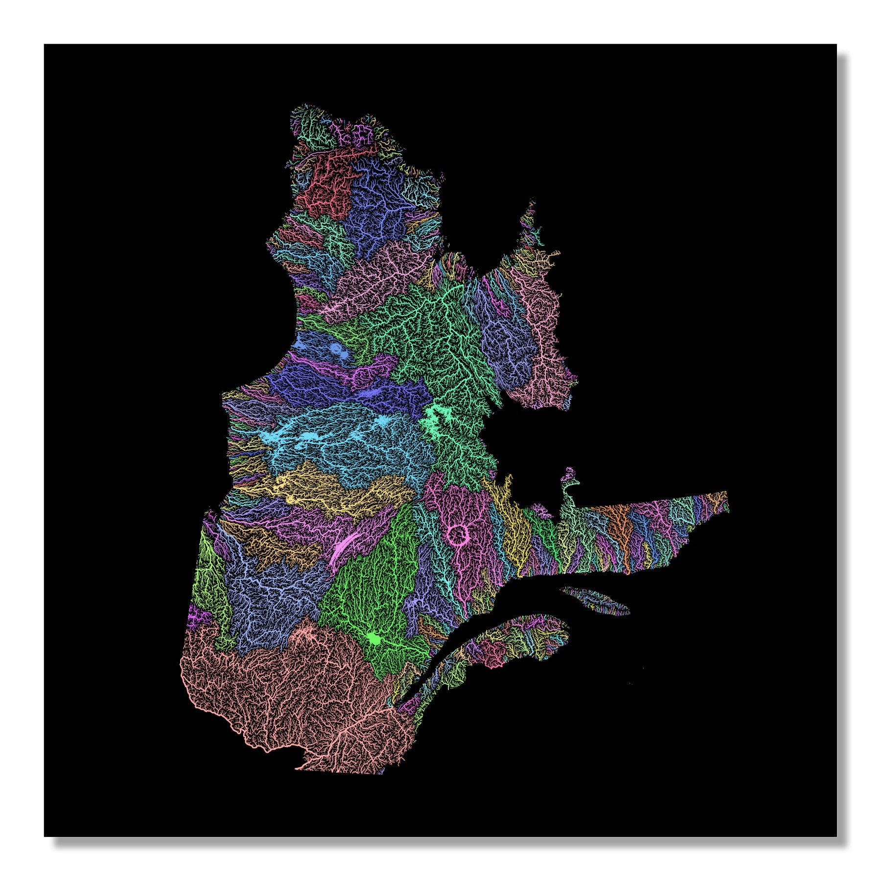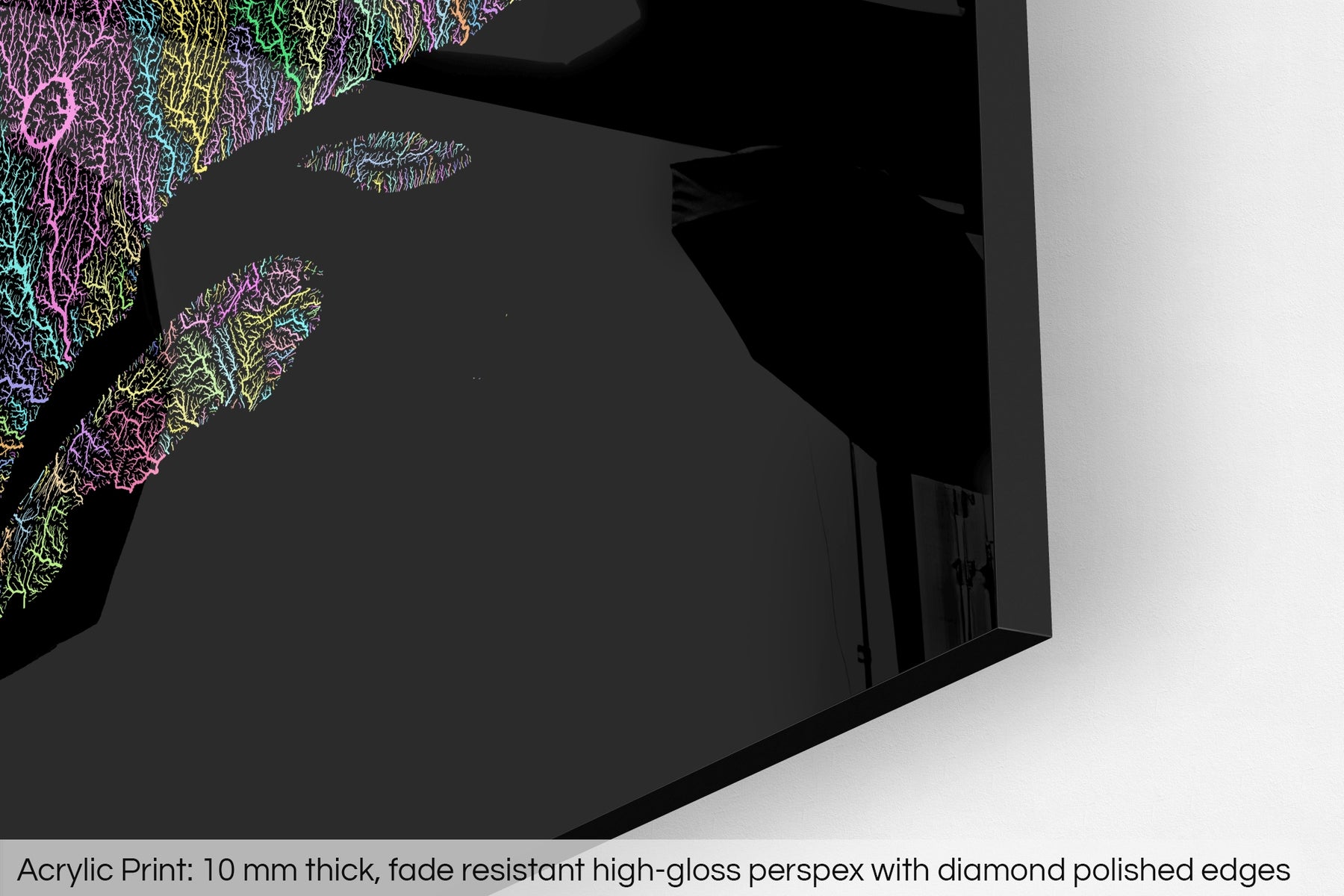 This high-resolution river basin map shows each catchment area in a different colour. Its vibrant colour scheme makes this map a lively addition to any space.