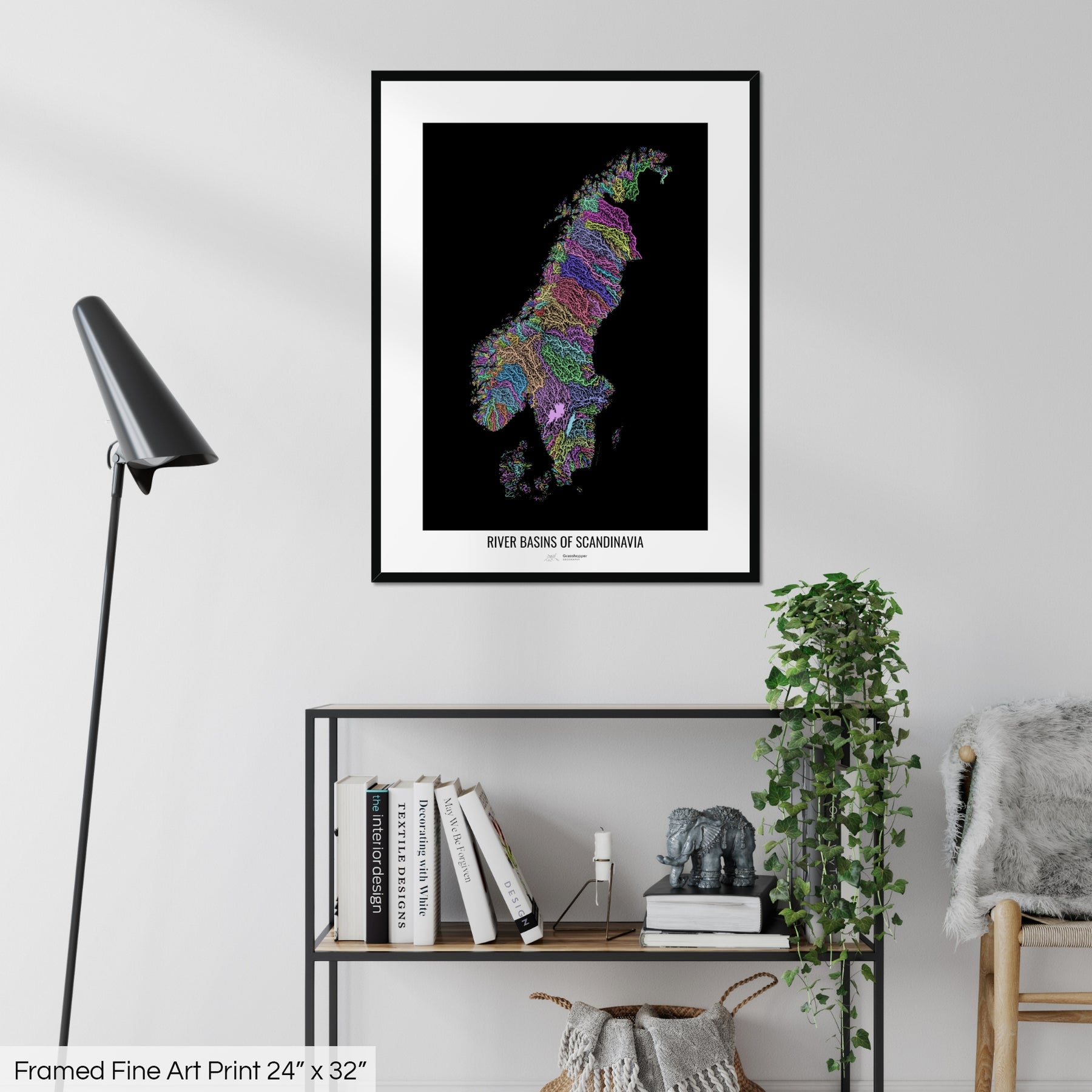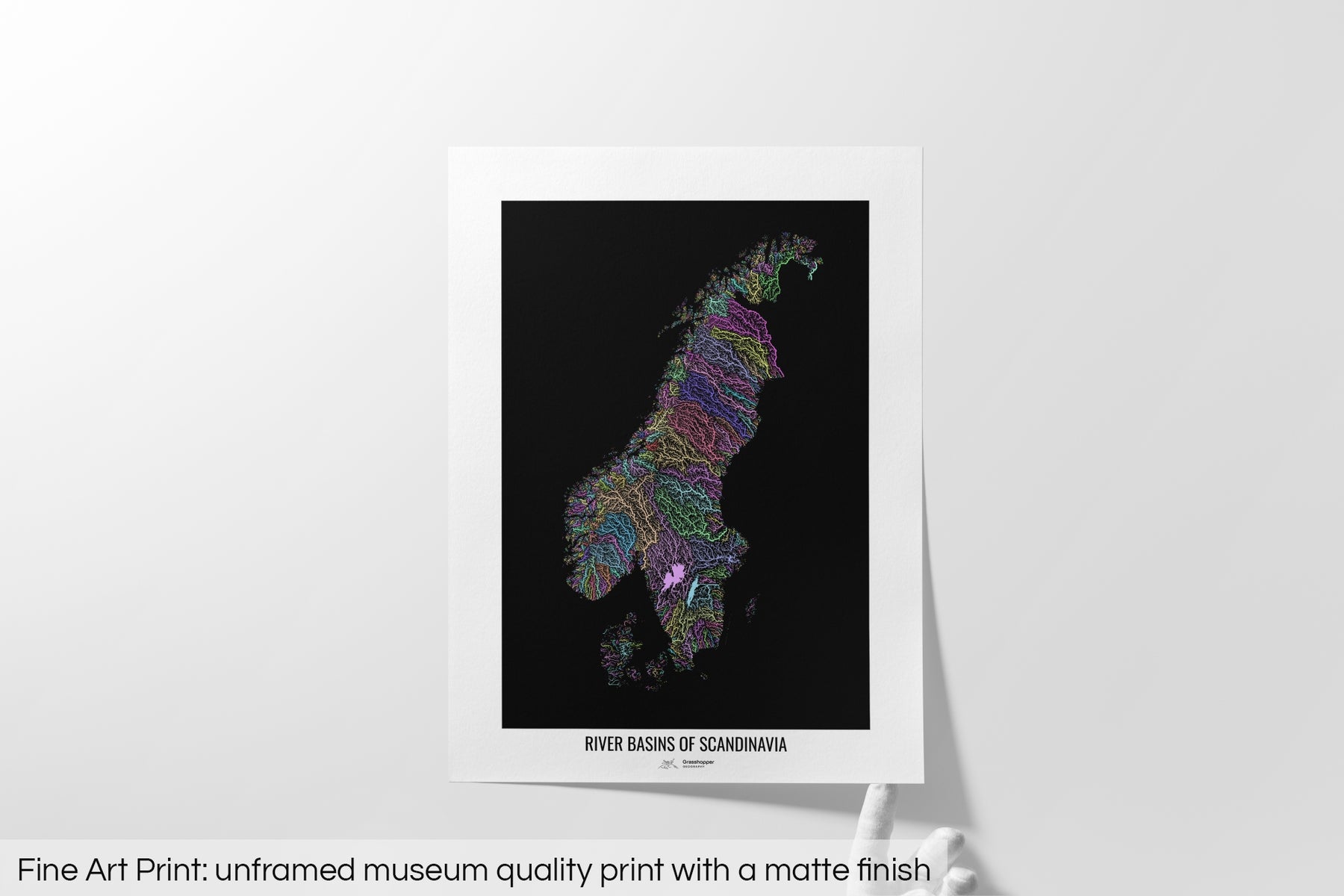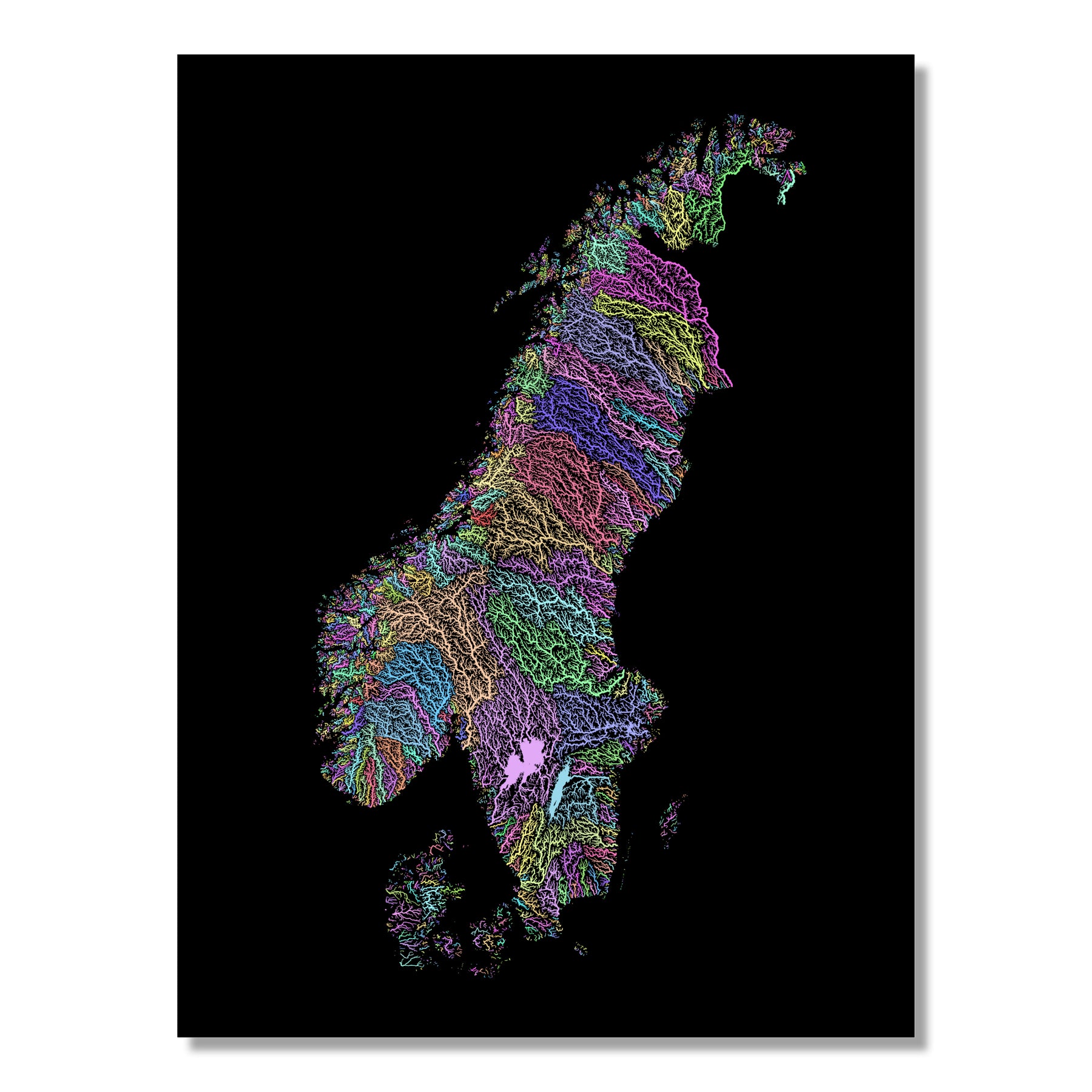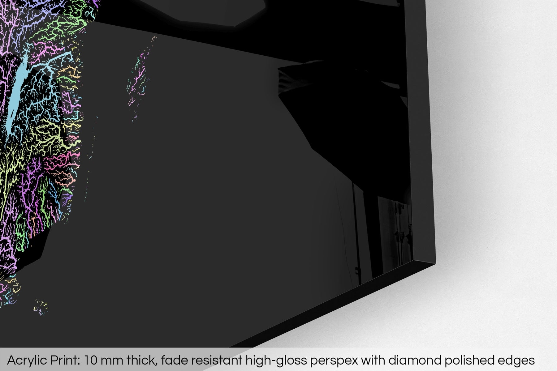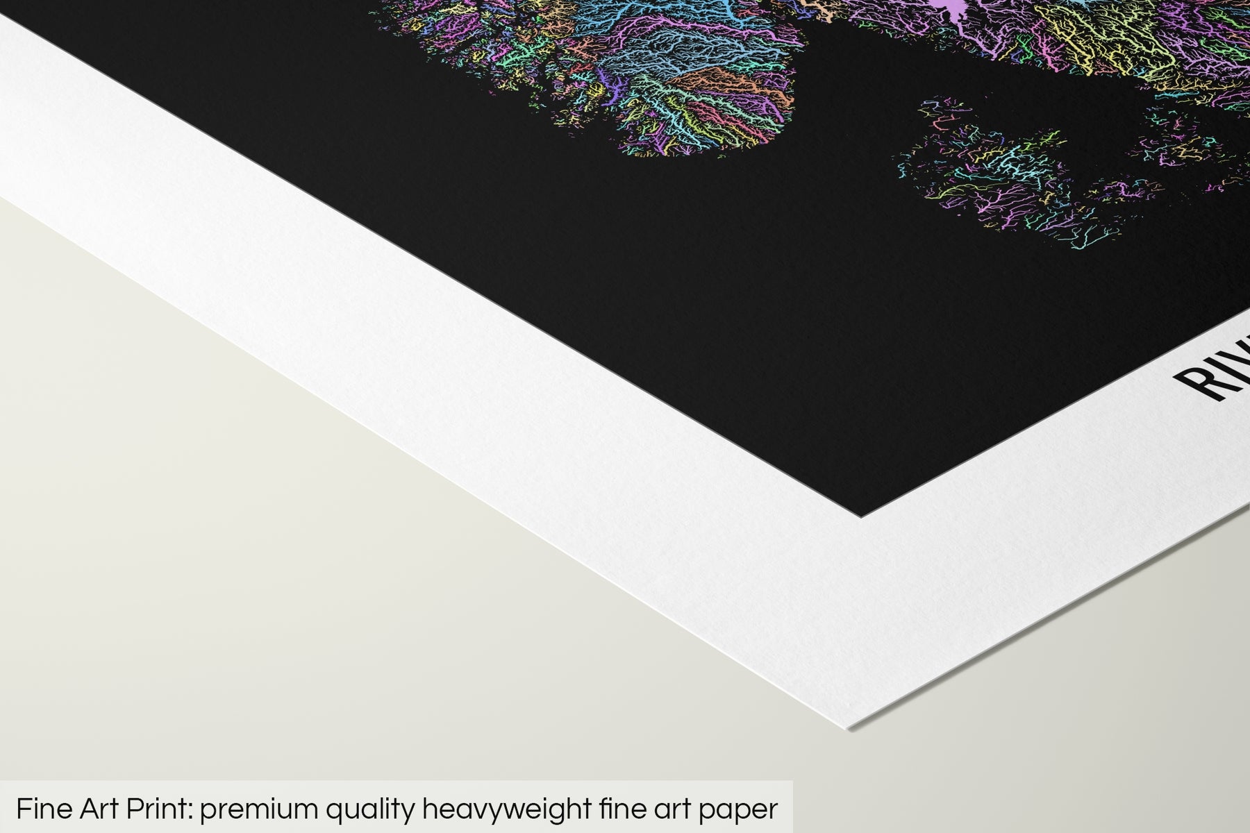 High resolution river basin map, showing each catchment area in a different colour. Thanks to its soft pastel tones the map fits well into most interiors.