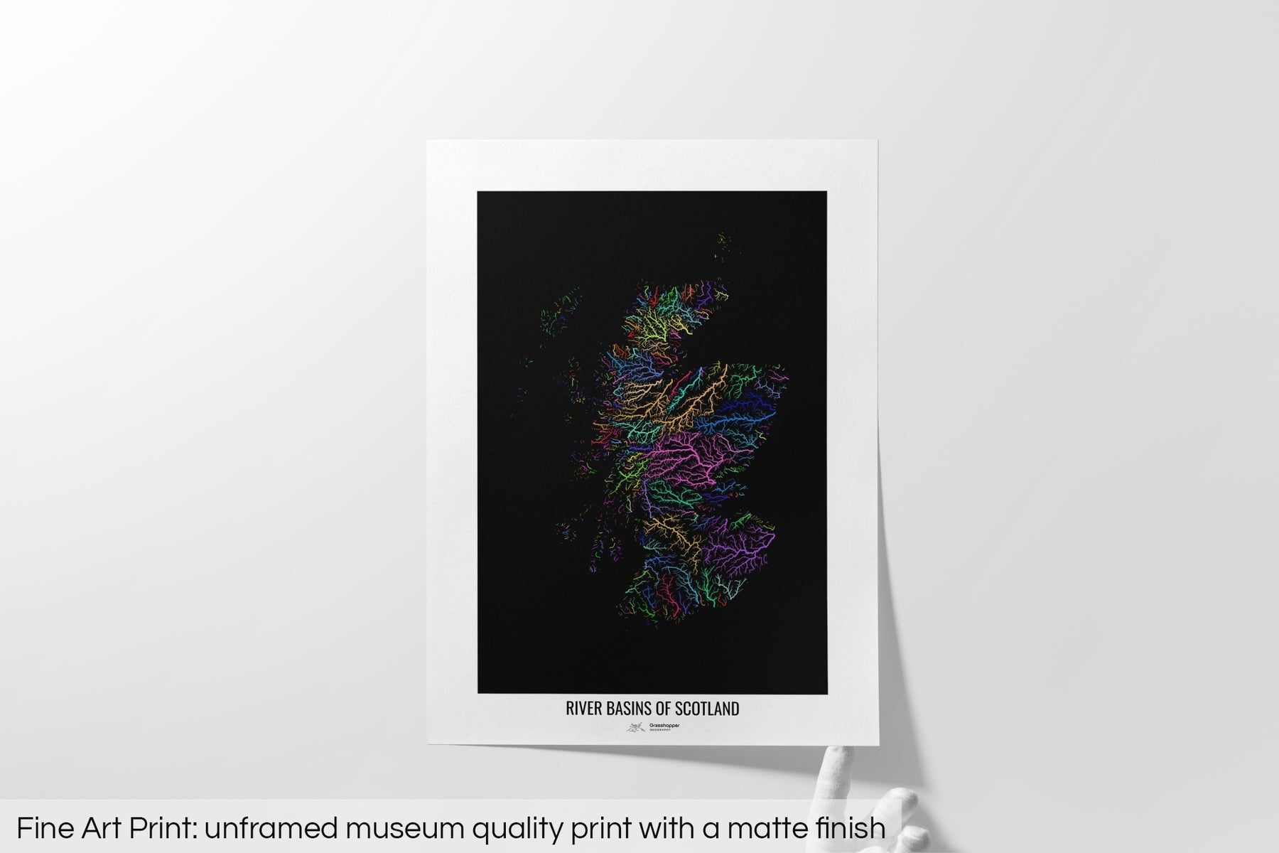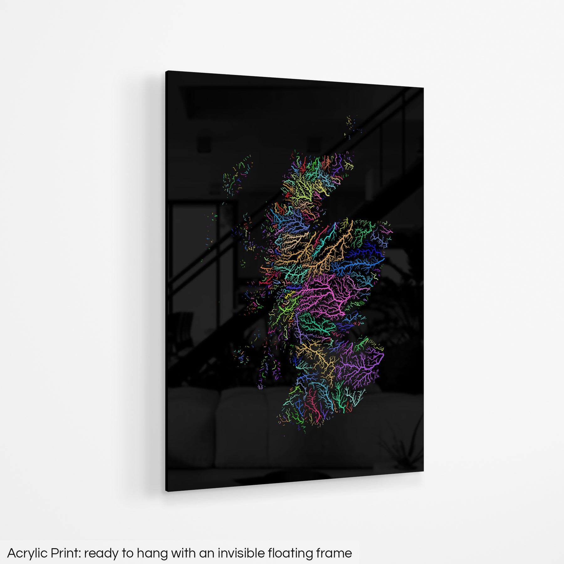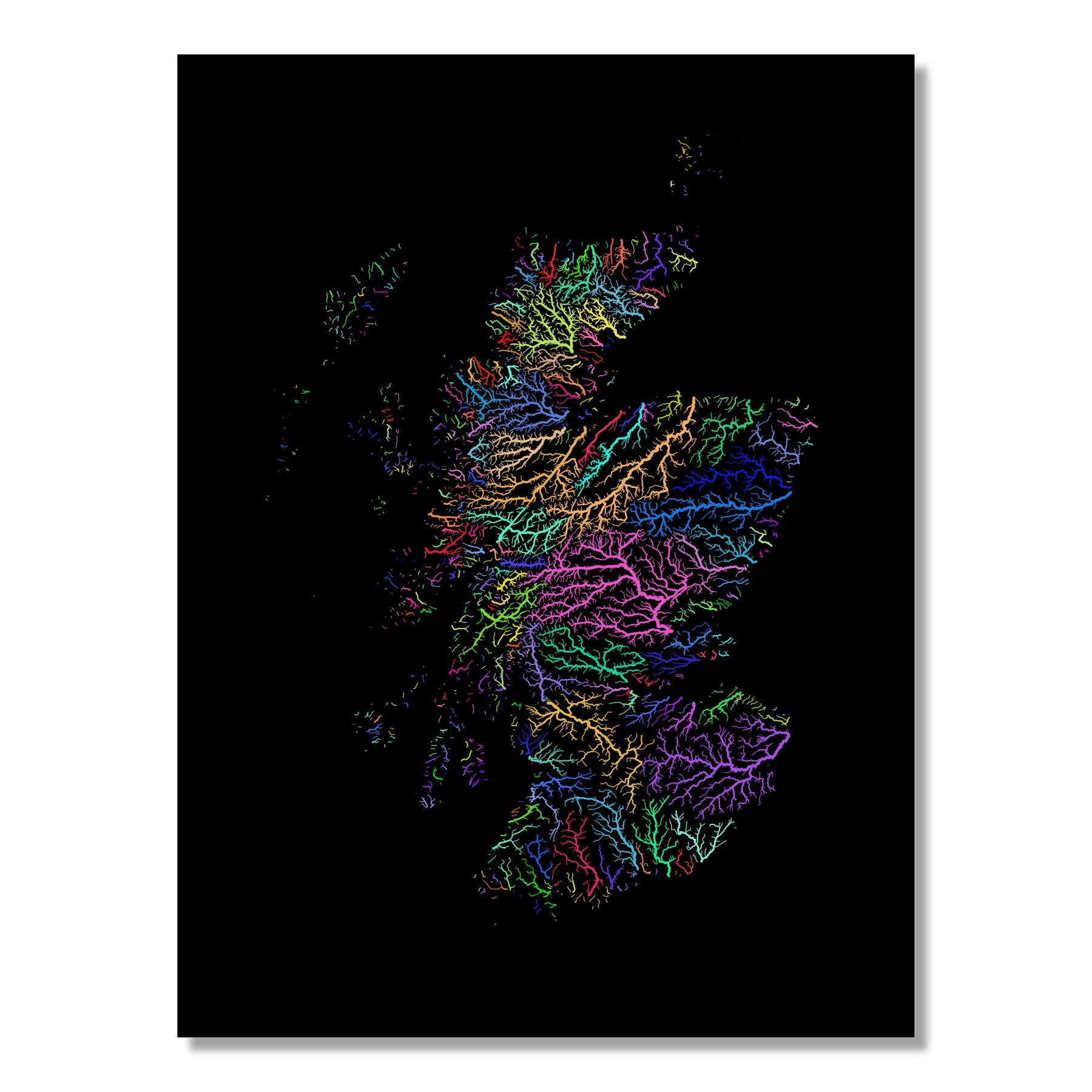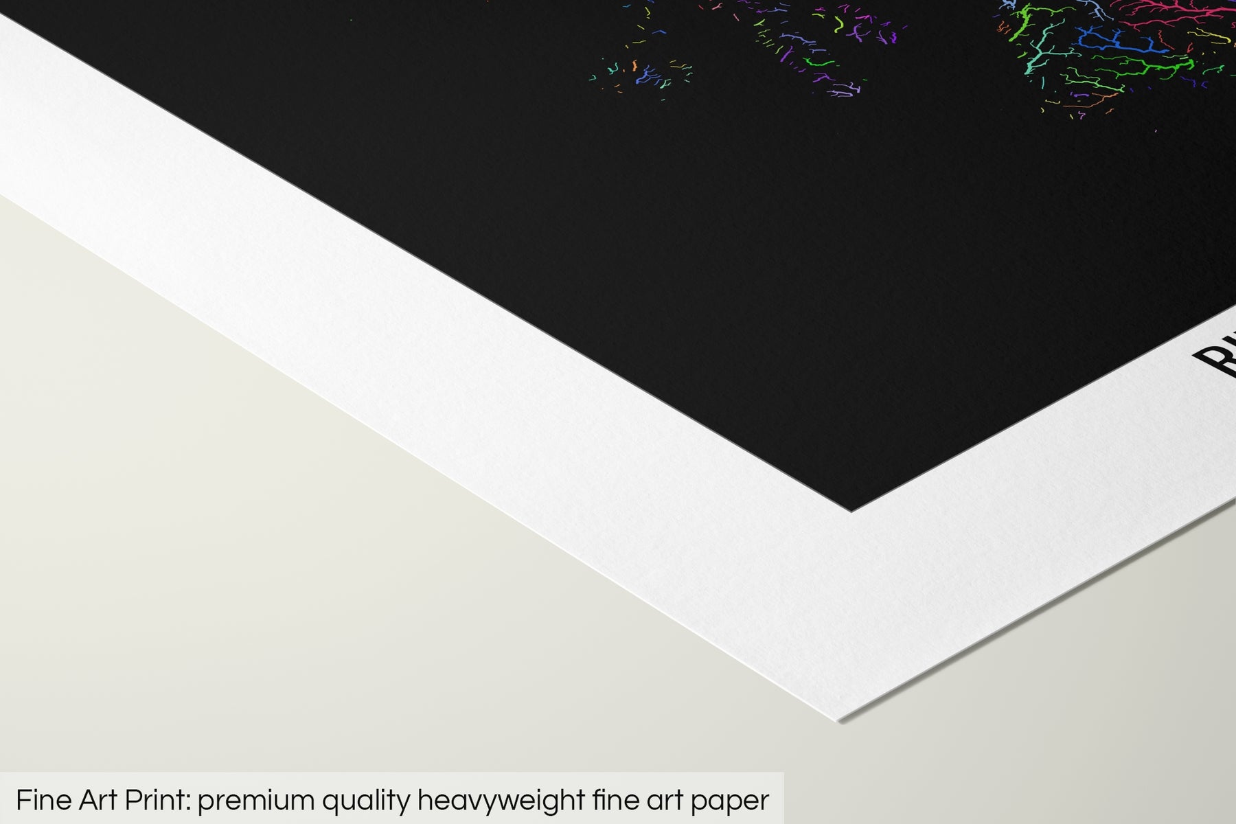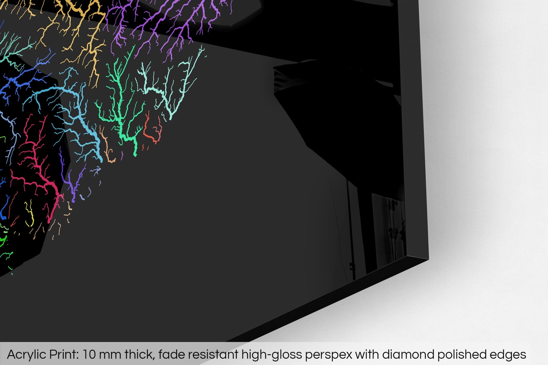 This high-resolution river basin map shows each catchment area in a different colour. Its vibrant colour scheme makes this map a lively addition to any space.