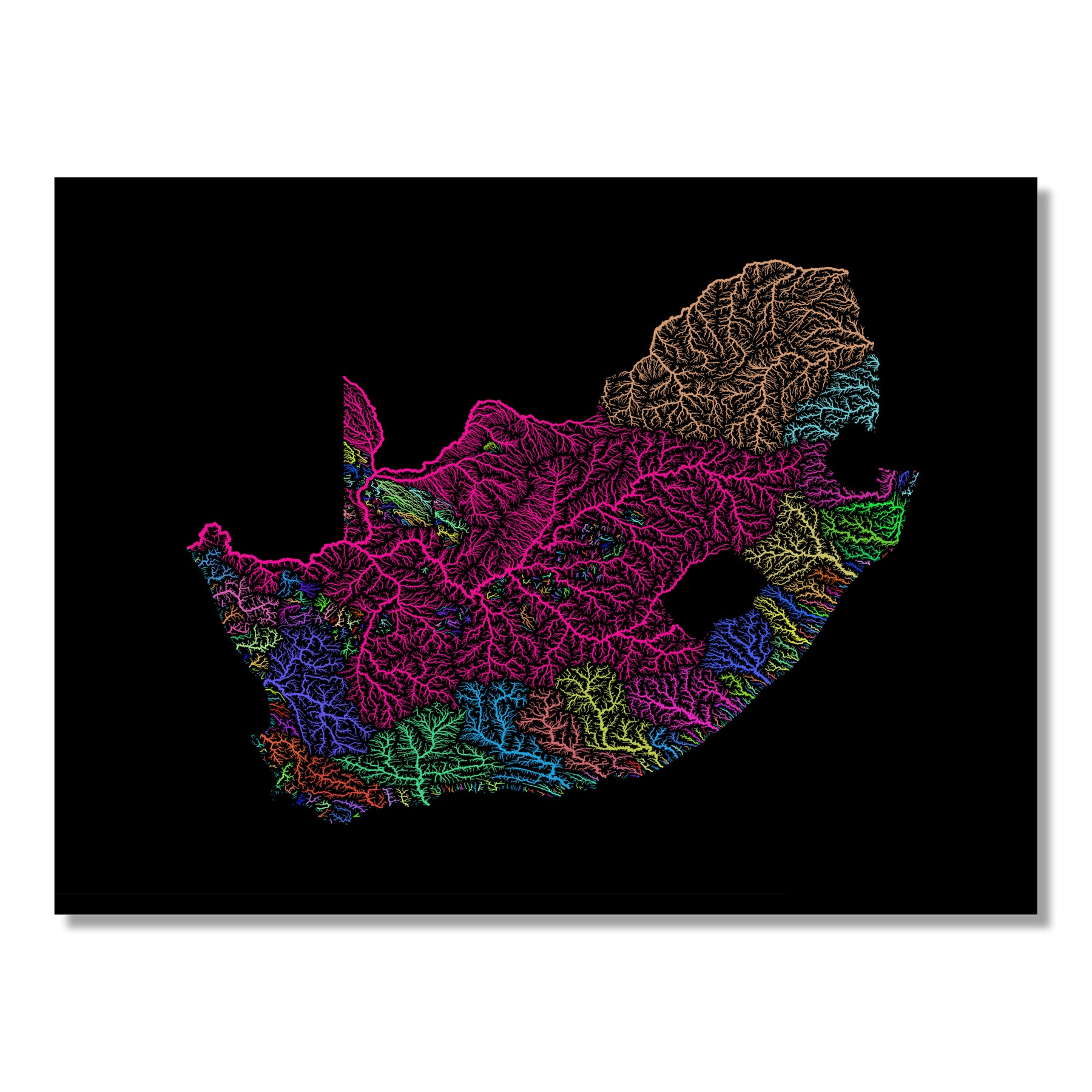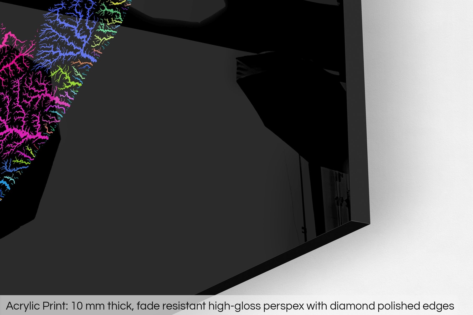 This high-resolution river basin map shows each catchment area in a different colour. Its vibrant colour scheme makes this map a lively addition to any space.