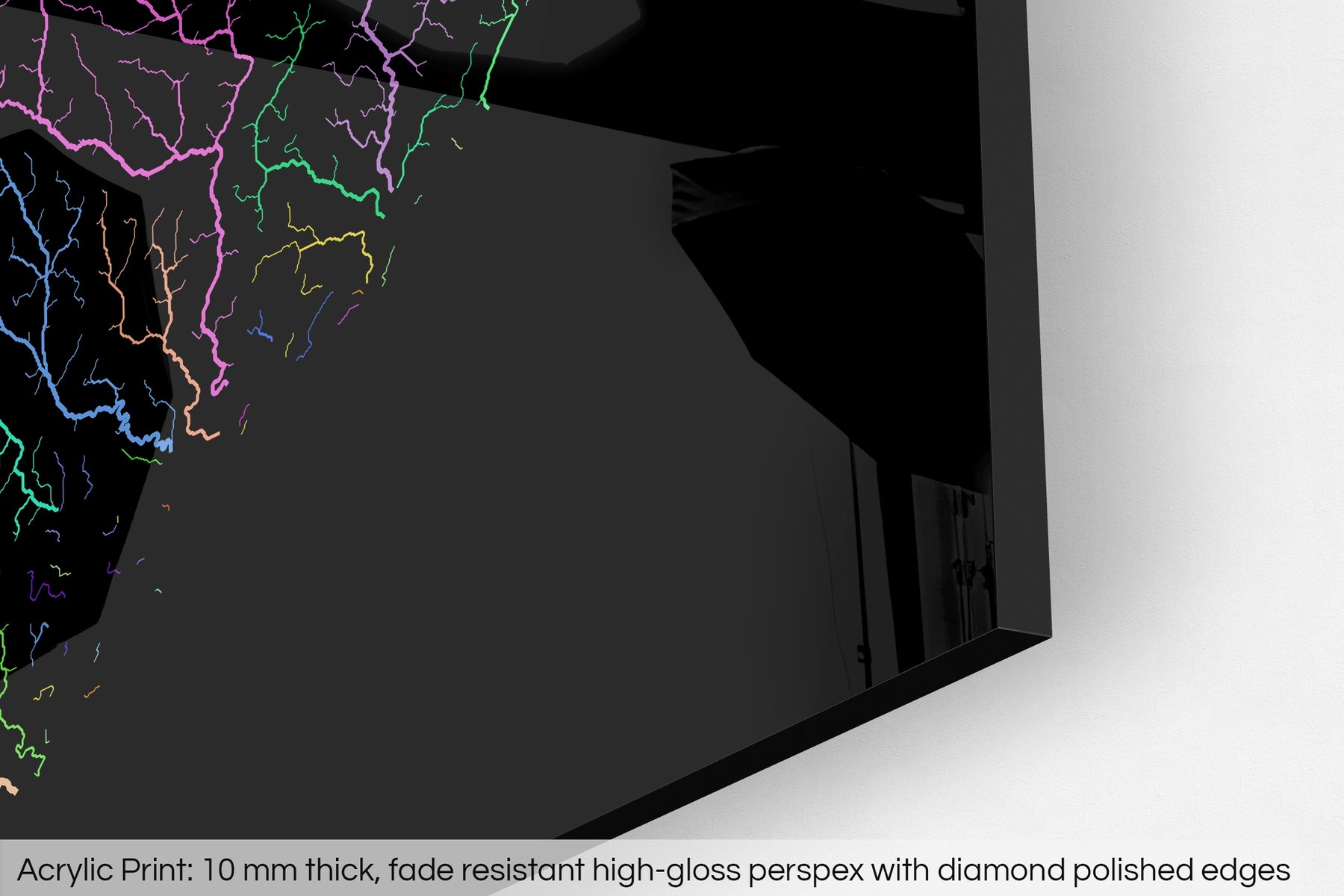 A fine art Giclée print is hand mounted onto 10mm thick high-gloss acrylic perspex that will protect your map from harmful UV light, keeping colours fresh and vivid for years to come.