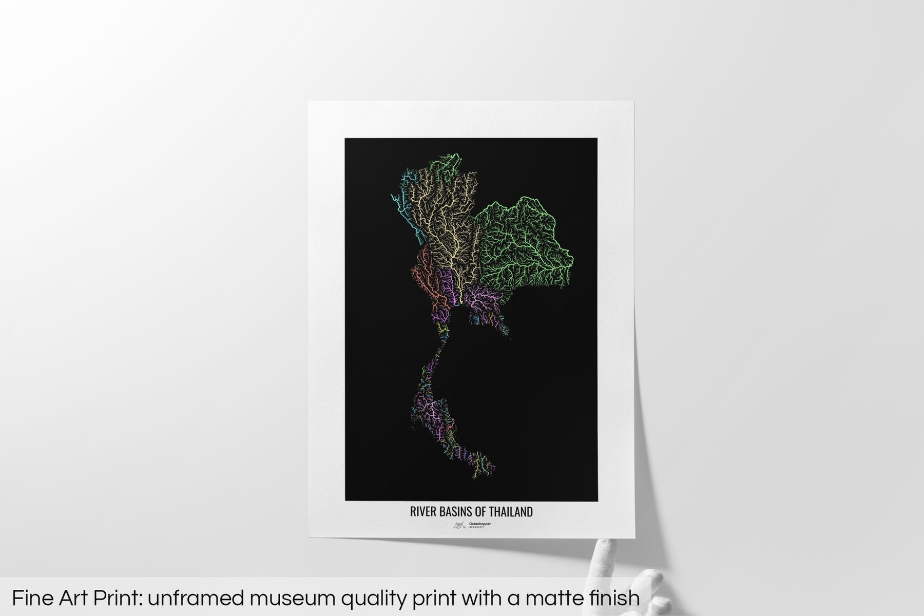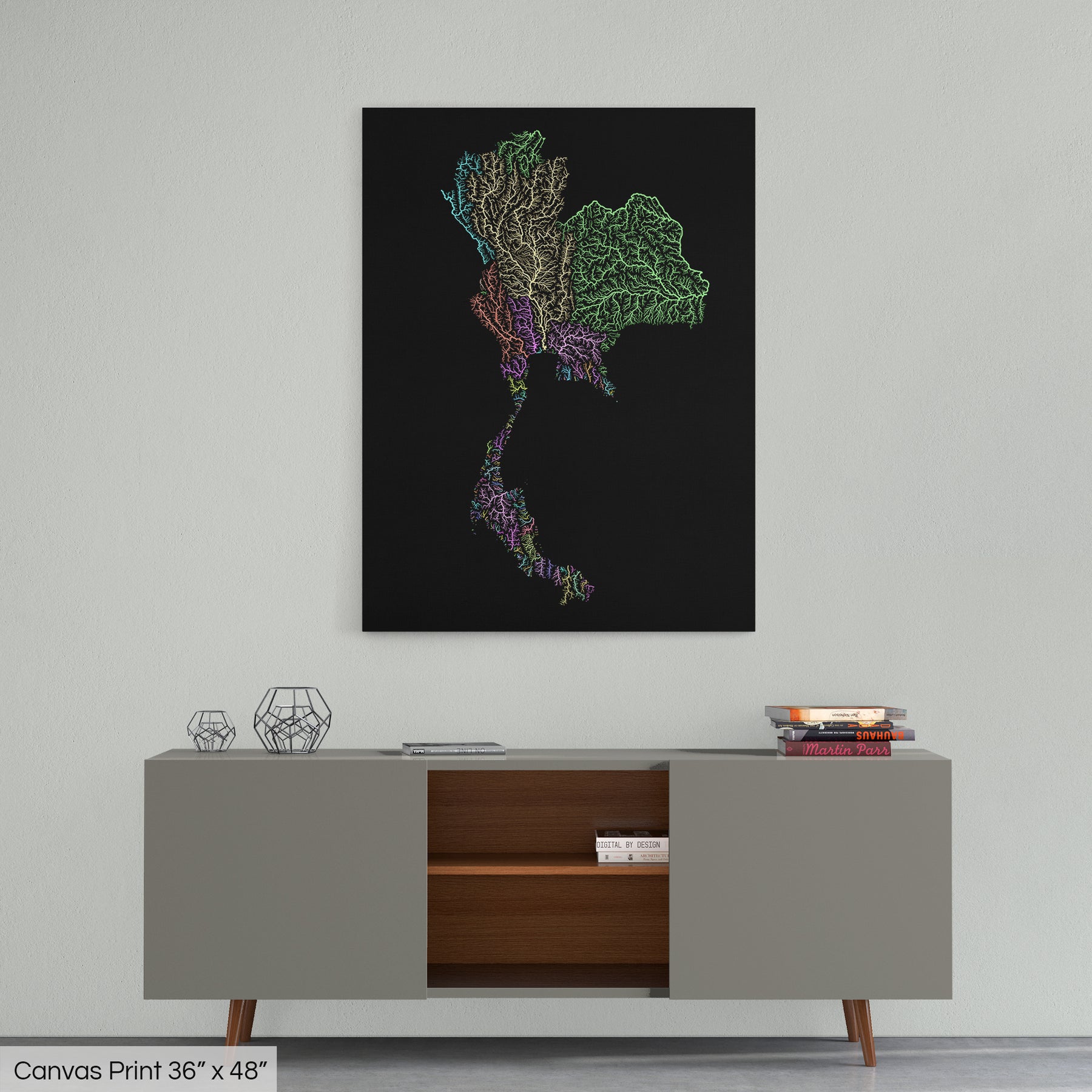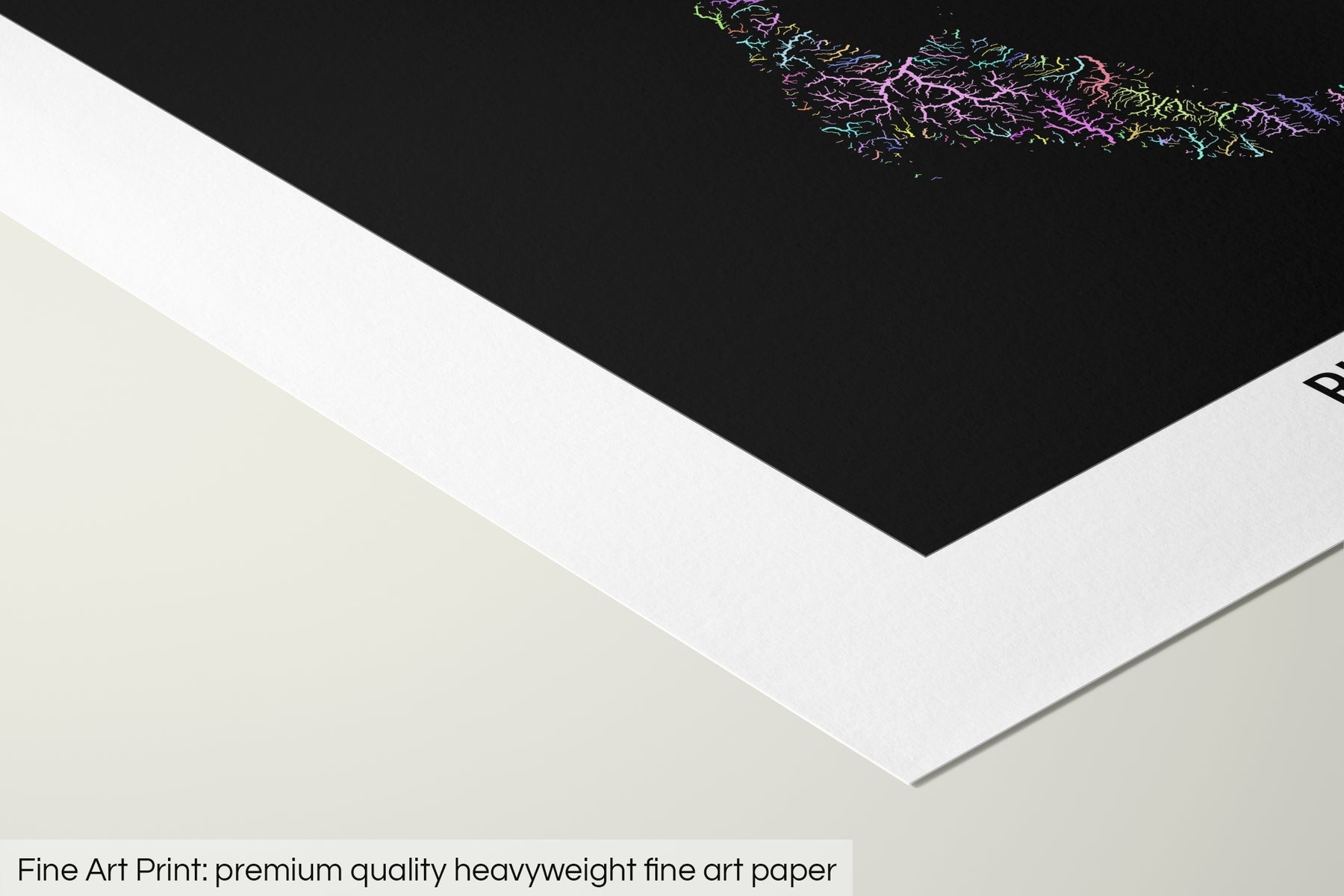 High resolution river basin map, showing each catchment area in a different colour. Thanks to its soft pastel tones the map fits well into most interiors.