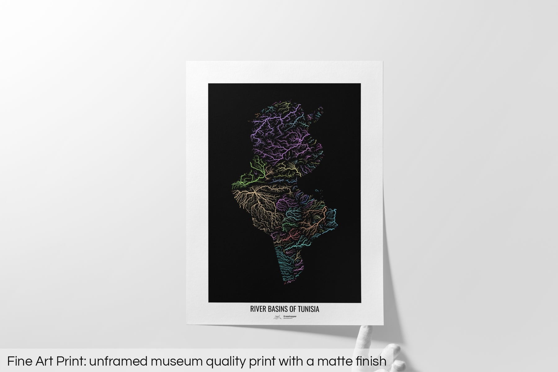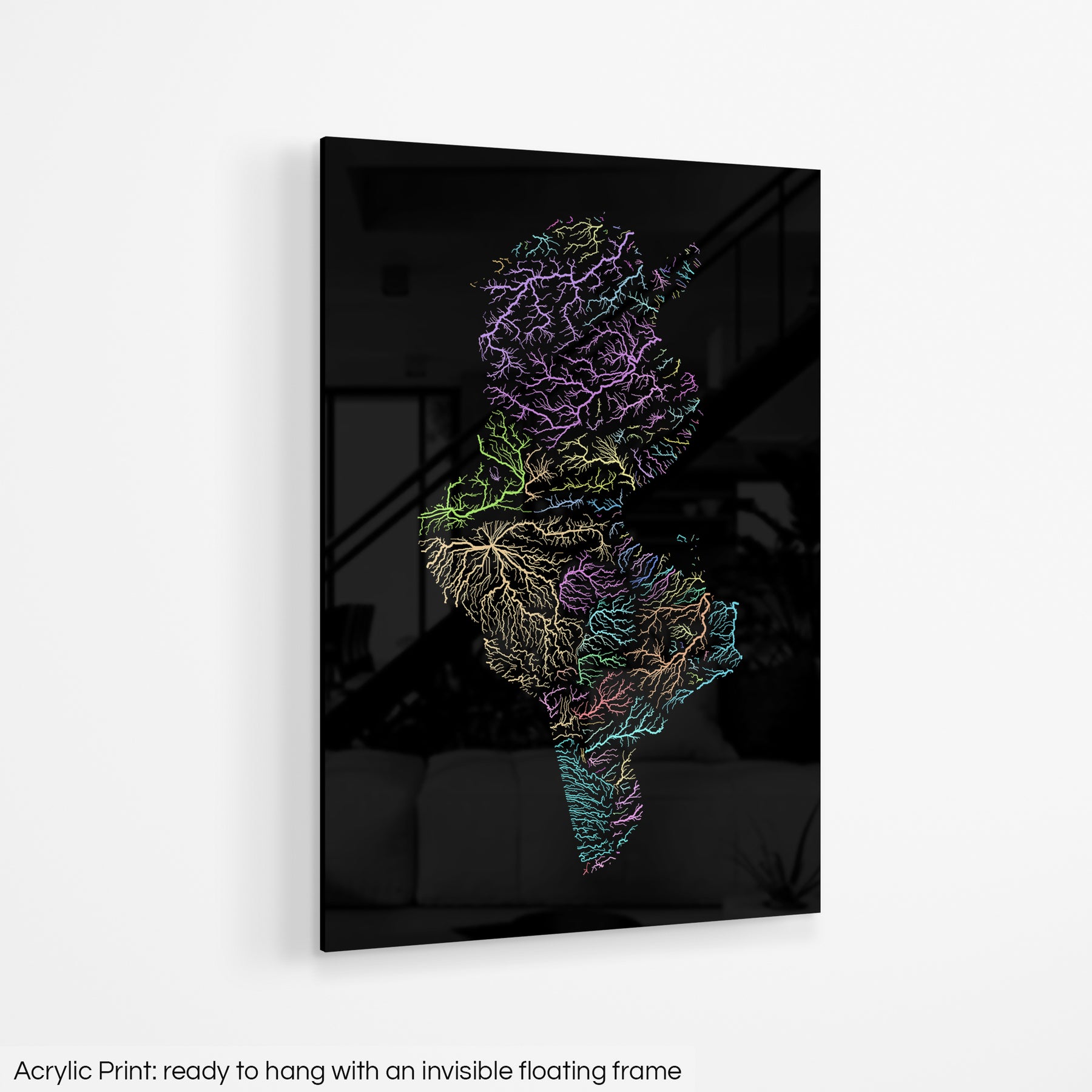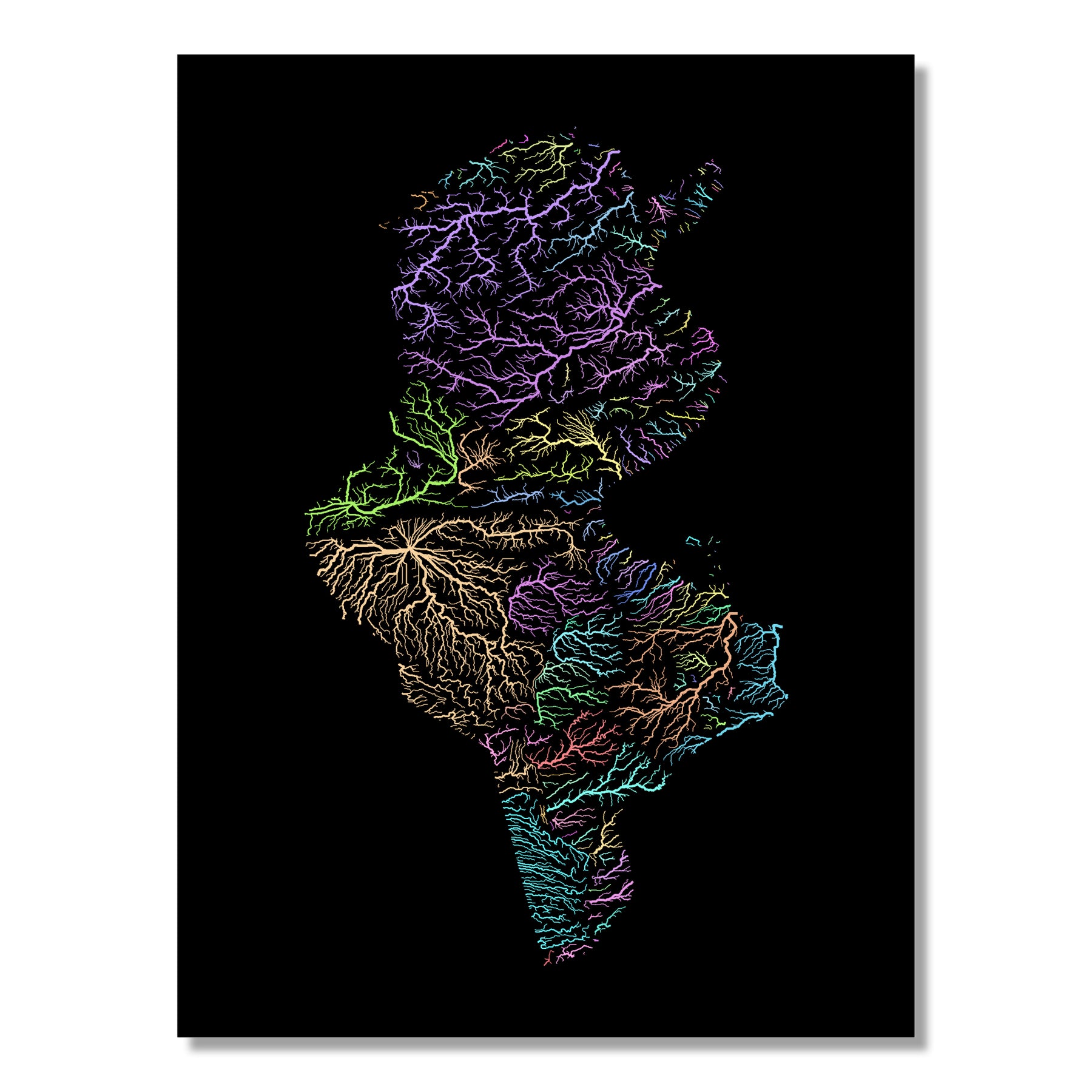 High resolution river basin map, showing each catchment area in a different colour. Thanks to its soft pastel tones the map fits well into most interiors.