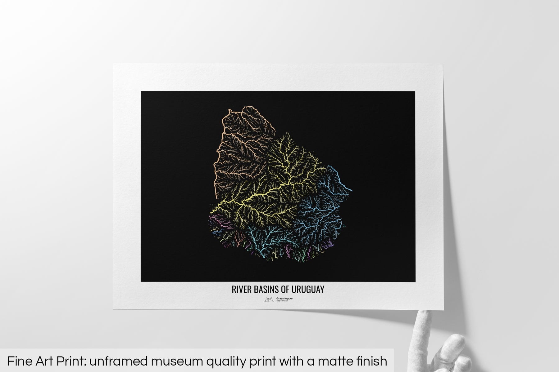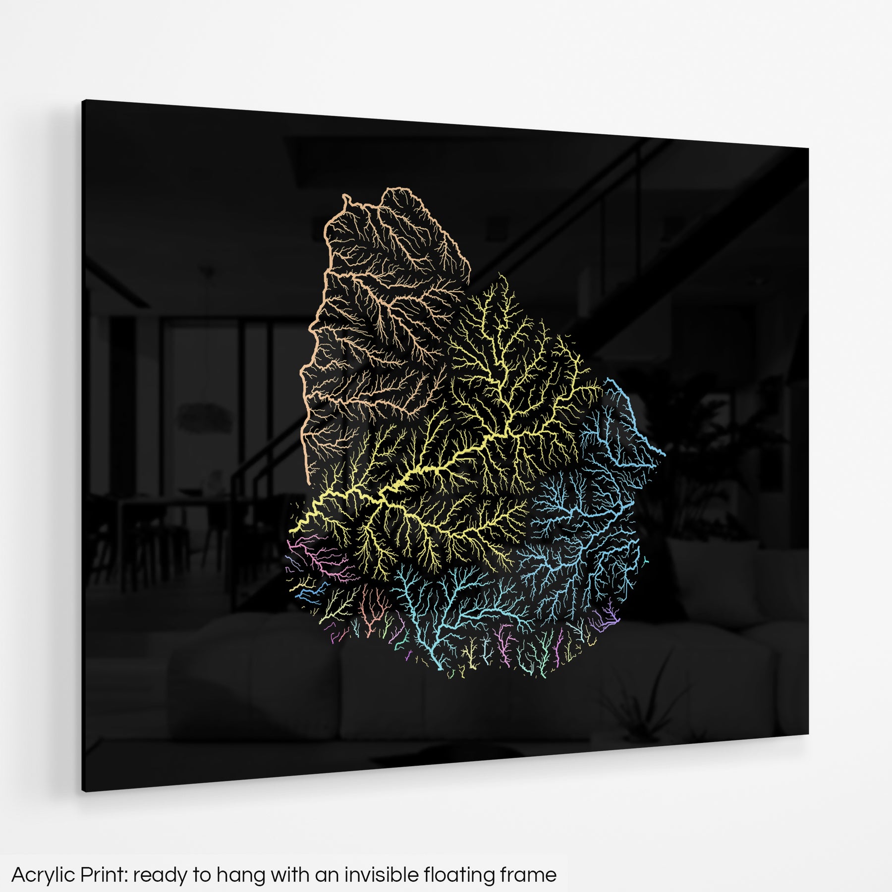 High resolution river basin map, showing each catchment area in a different colour. Thanks to its soft pastel tones the map fits well into most interiors.