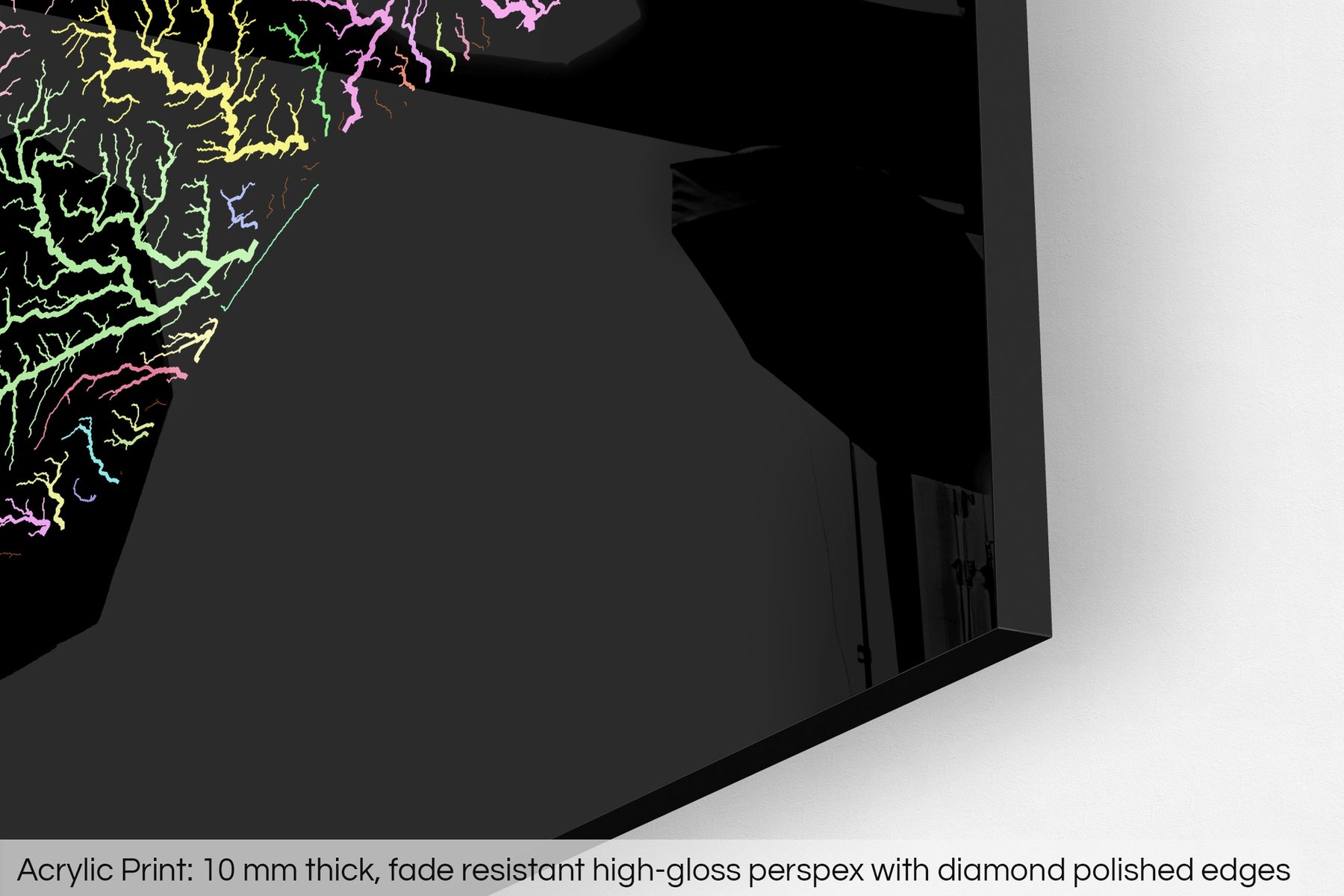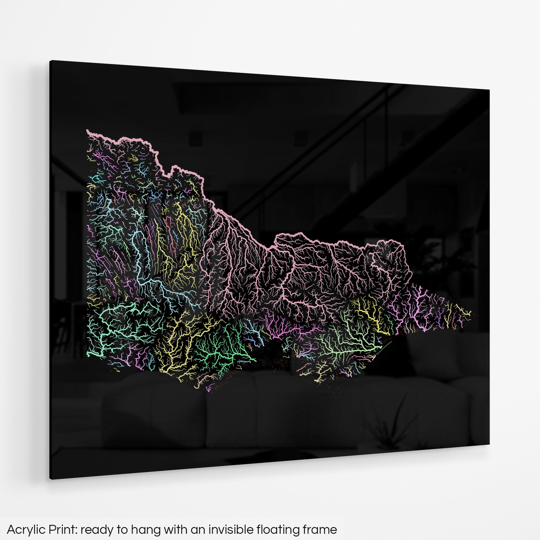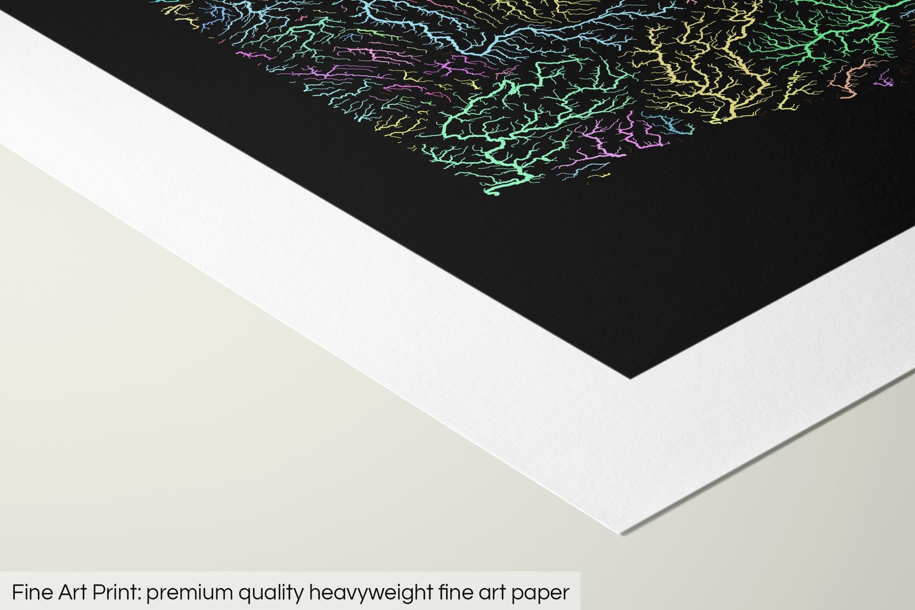 High resolution river basin map, showing each catchment area in a different colour. Thanks to its soft pastel tones the map fits well into most interiors.