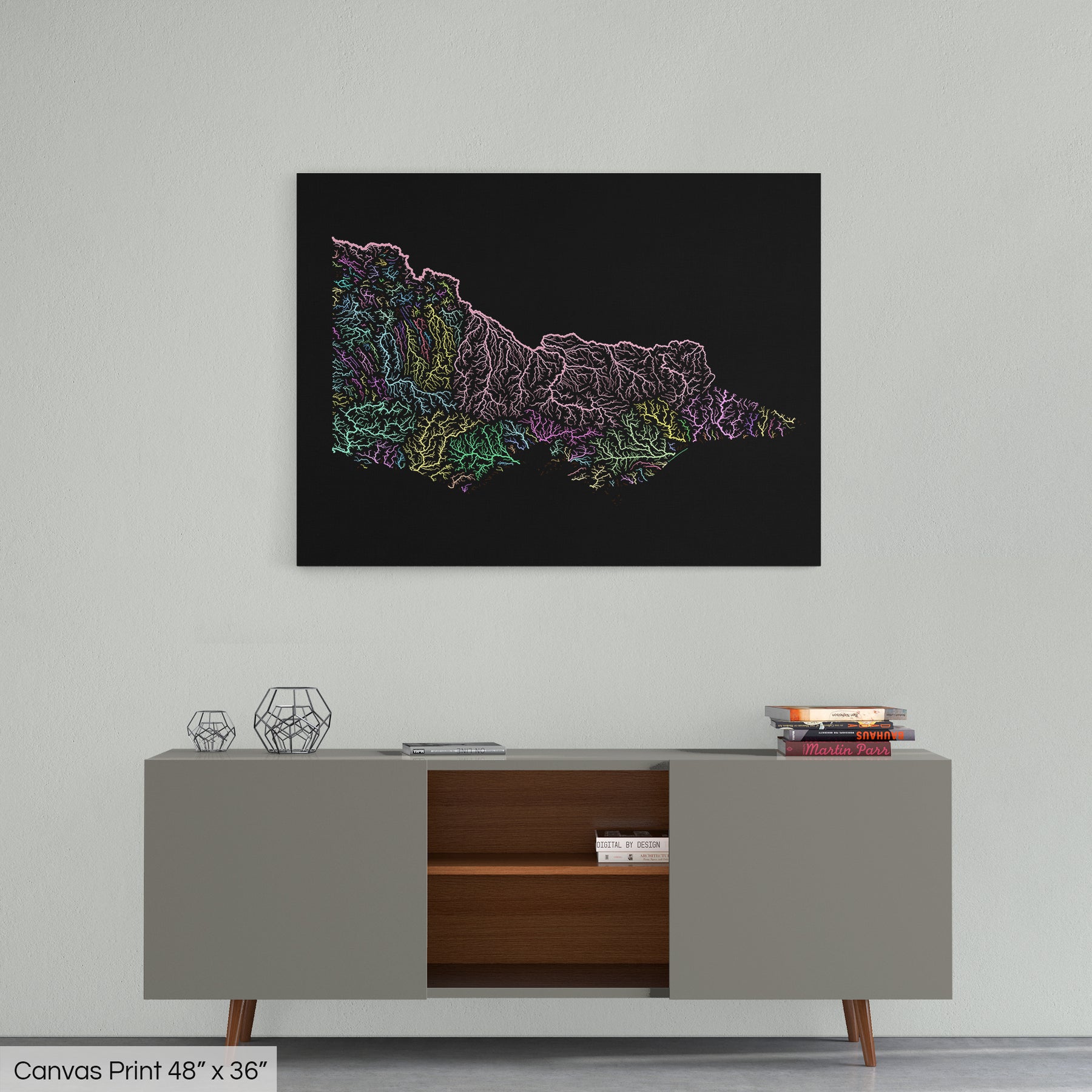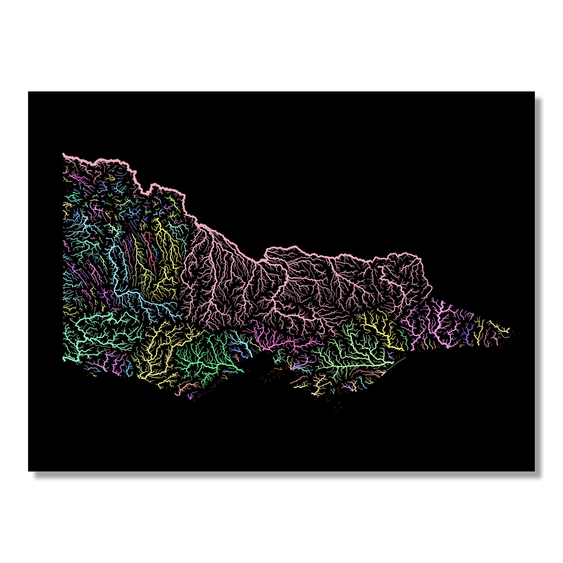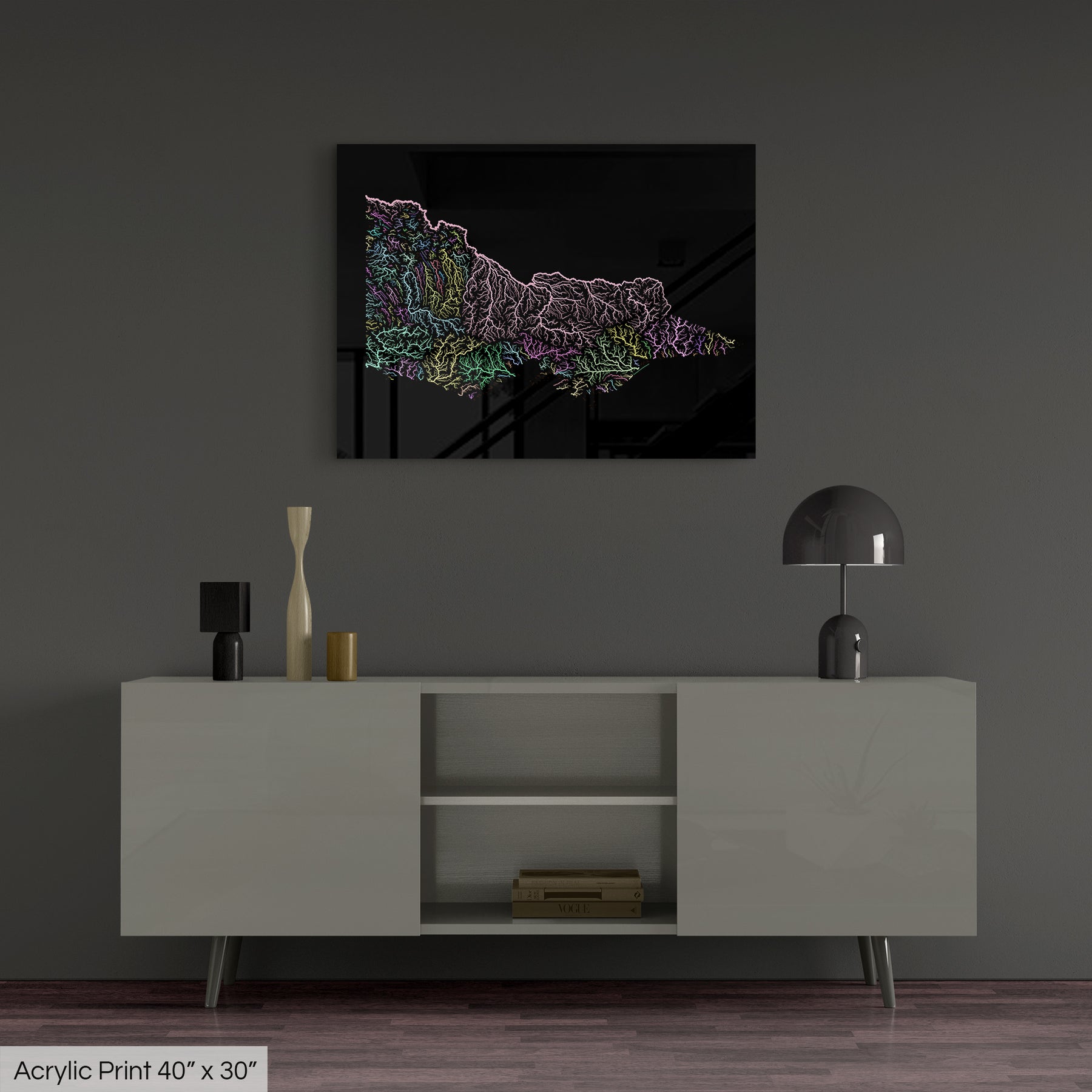 High resolution river basin map, showing each catchment area in a different colour. Thanks to its soft pastel tones the map fits well into most interiors.