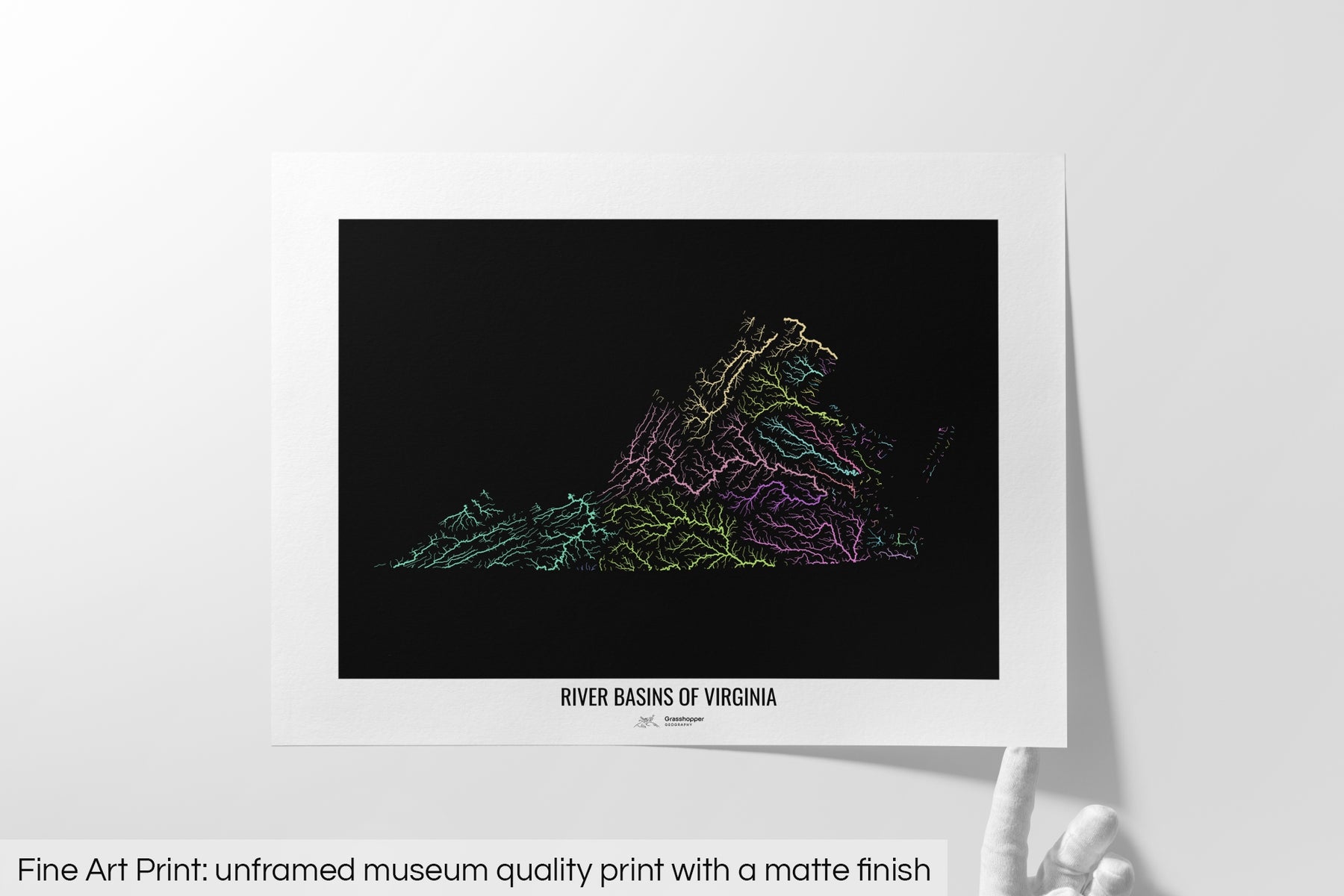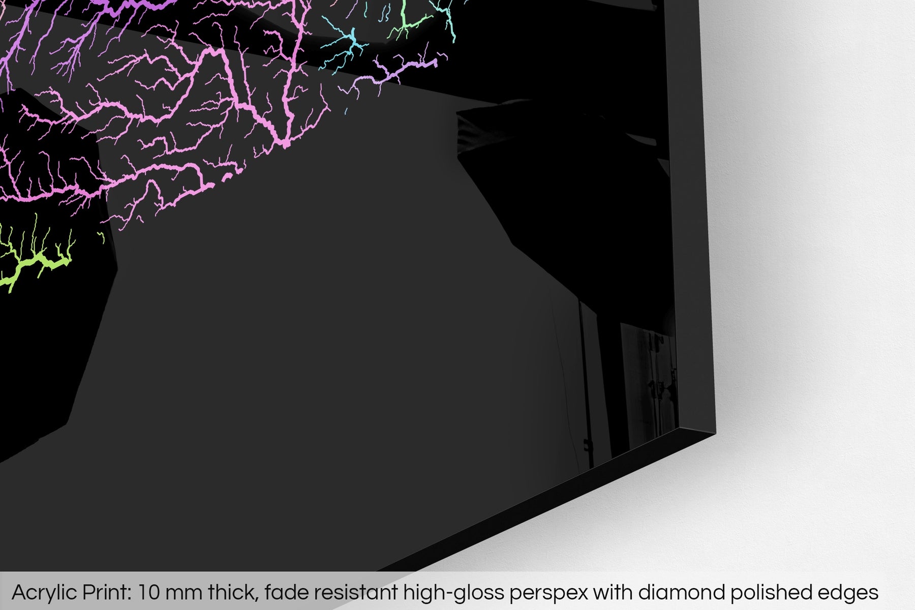 High resolution river basin map, showing each catchment area in a different colour. Thanks to its soft pastel tones the map fits well into most interiors.