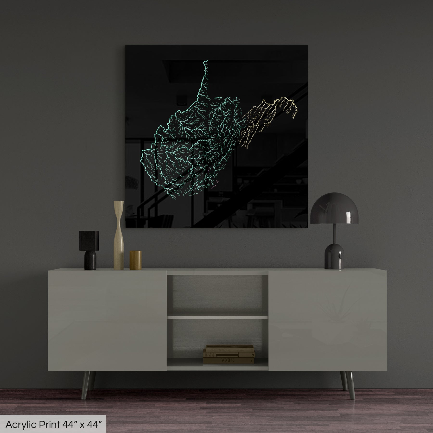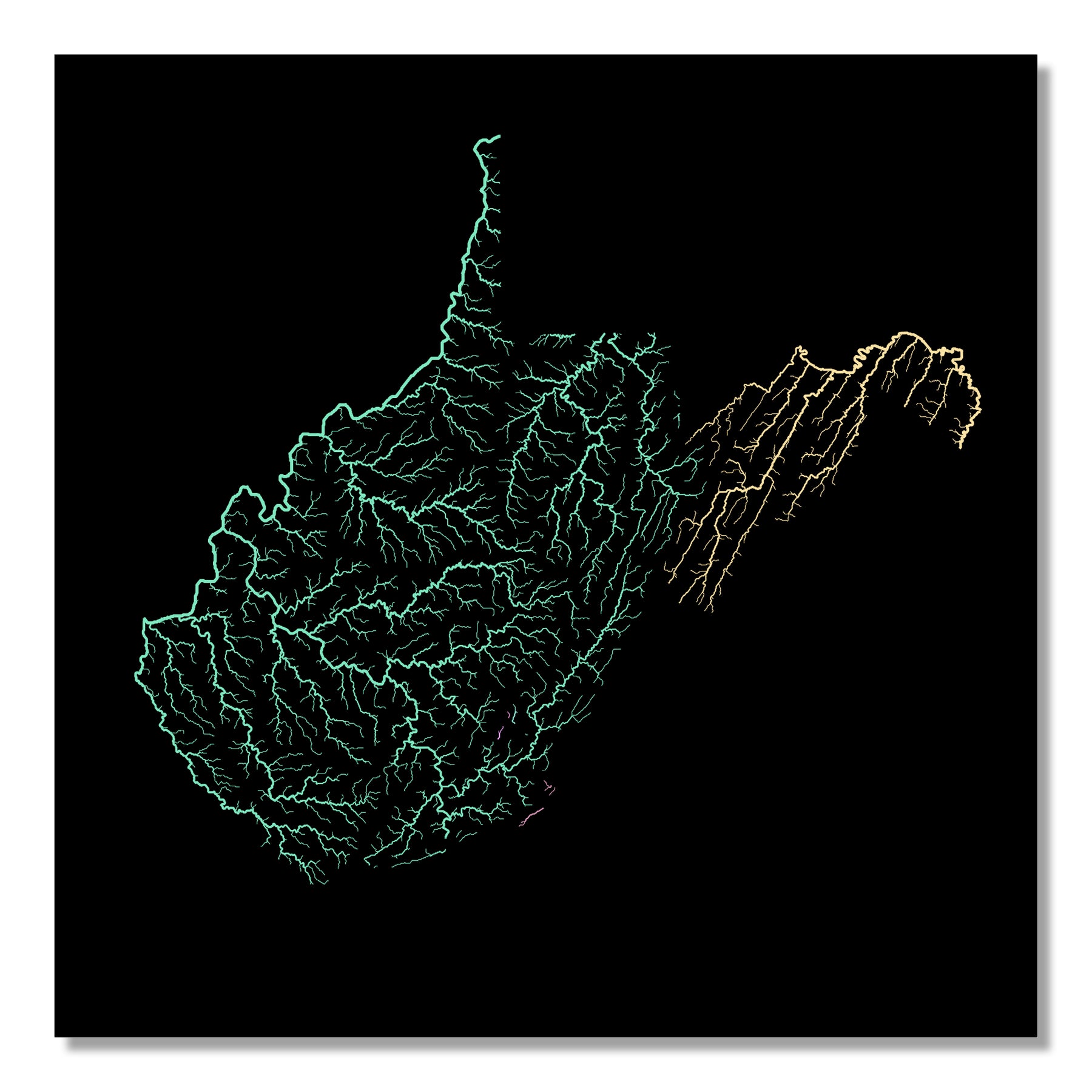 This high-resolution river basin map shows each catchment area in a different colour. Its vibrant colour scheme makes this map a lively addition to any space.