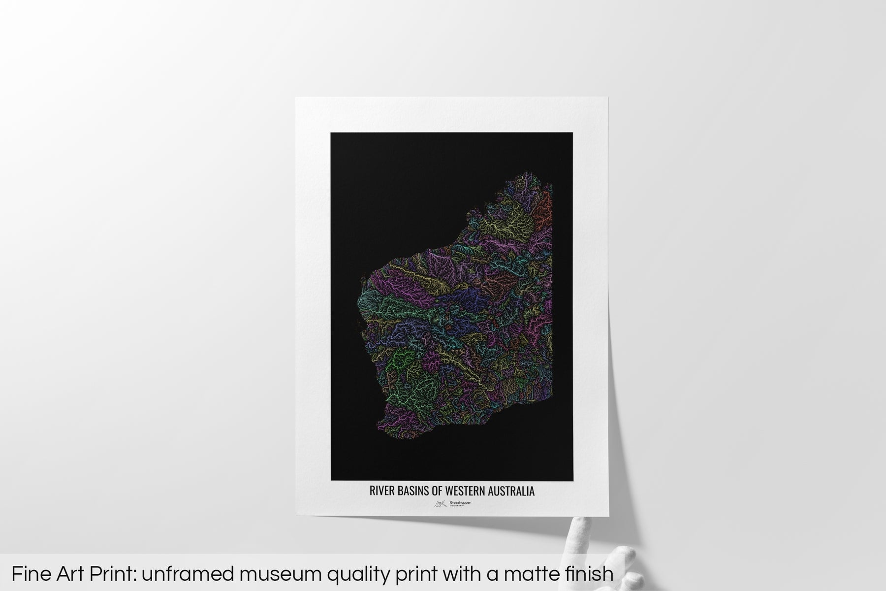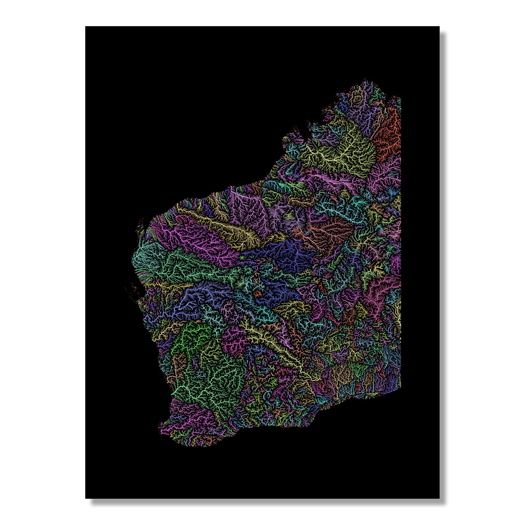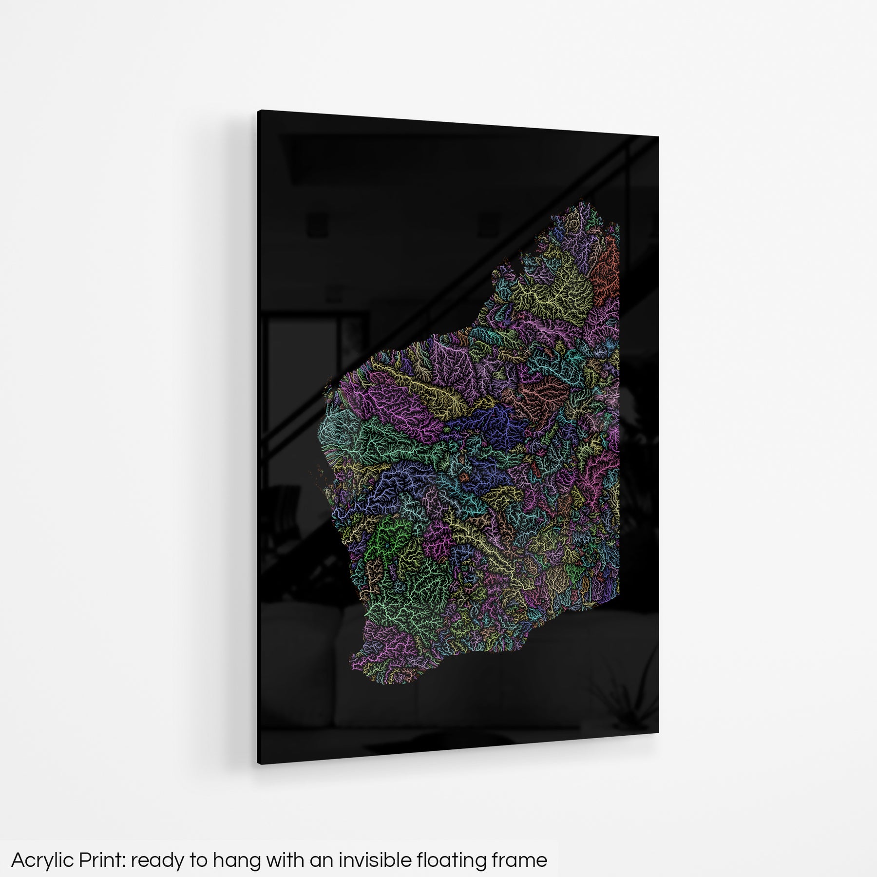 High resolution river basin map, showing each catchment area in a different colour. Thanks to its soft pastel tones the map fits well into most interiors.
