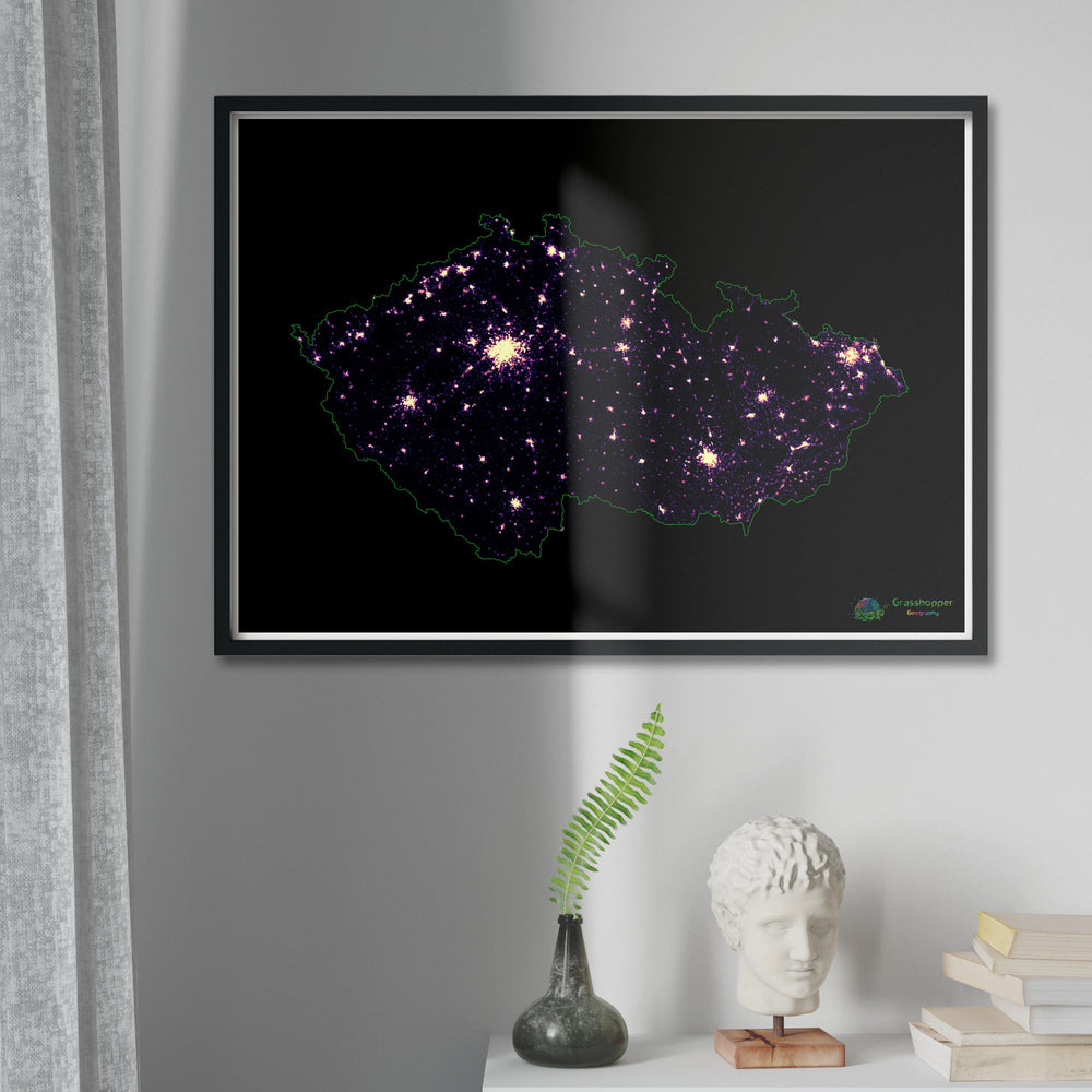 Carte thermique de la densité de population de la République tchèque Fine Art Print. Carte de densité de population haute résolution basée sur des ensembles de données mondiales détaillées, conçues pour ressembler à des constellations d'étoiles et des nébuleuses. Les couleurs les plus sombres représentent des zones à très faible densité, les jaunes représentent des centres urbains denses et les violets entre les deux.