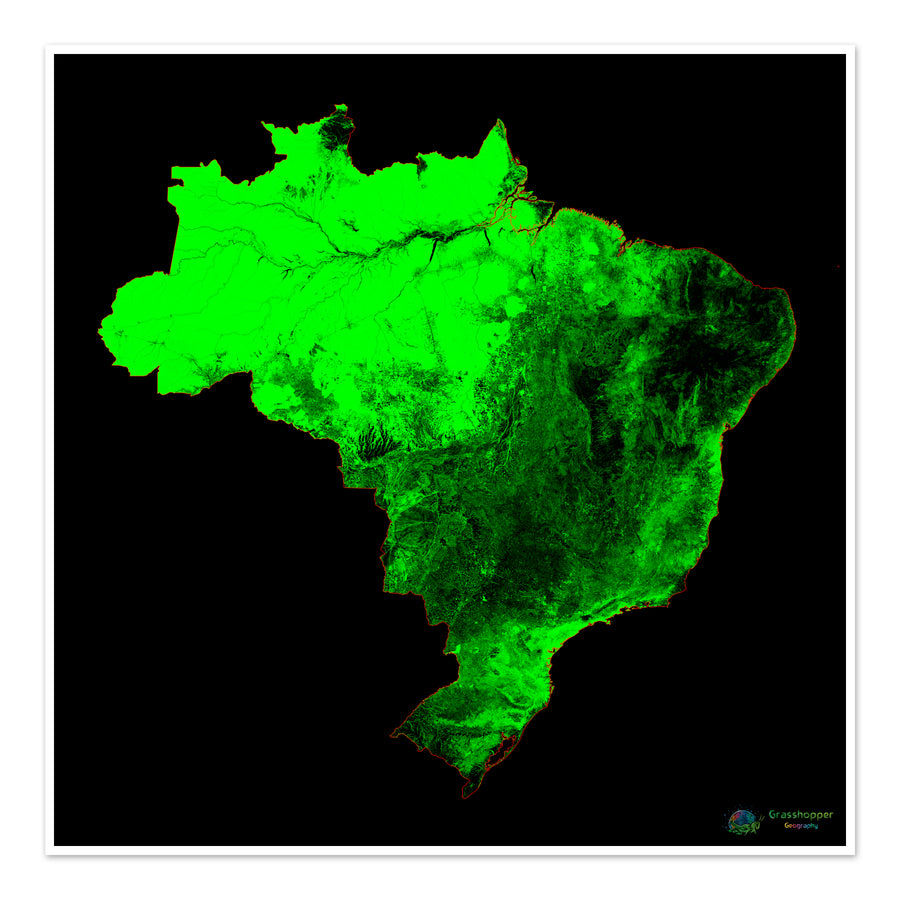 Carte de la couverture forestière du Brésil Fine Art Print. Carte du couvert arboré à haute résolution basée sur l'analyse de données satellitaires, avec des capteurs spécifiques conçus pour détecter et reconnaître le reflet de la végétation.