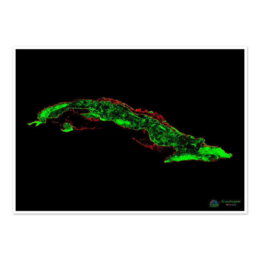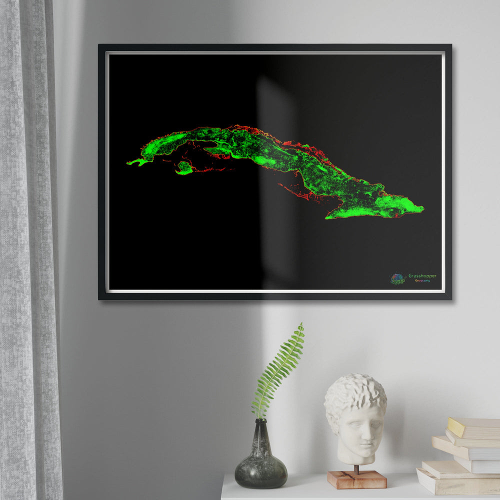 Carte de la couverture forestière de Cuba Fine Art Print. Carte du couvert arboré à haute résolution basée sur l'analyse de données satellitaires, avec des capteurs spécifiques conçus pour détecter et reconnaître le reflet de la végétation.