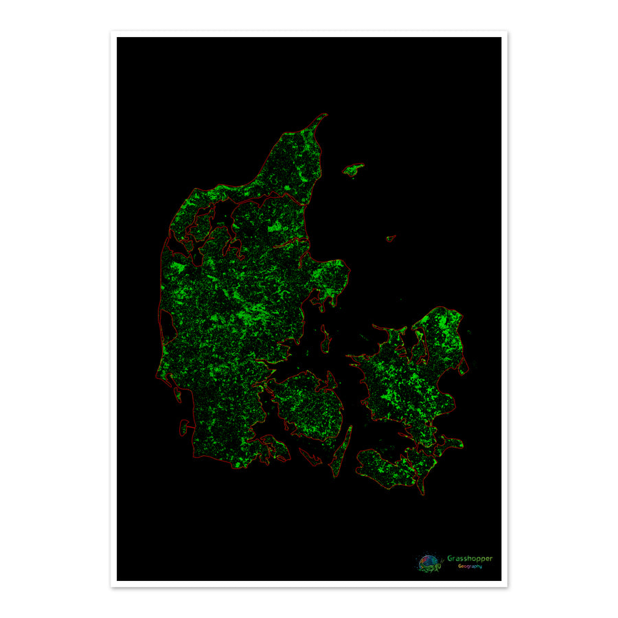 Carte de la couverture forestière du Danemark Fine Art Print. Carte du couvert arboré à haute résolution basée sur l'analyse de données satellitaires, avec des capteurs spécifiques conçus pour détecter et reconnaître le reflet de la végétation.