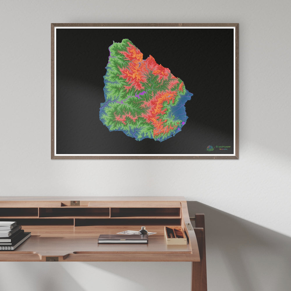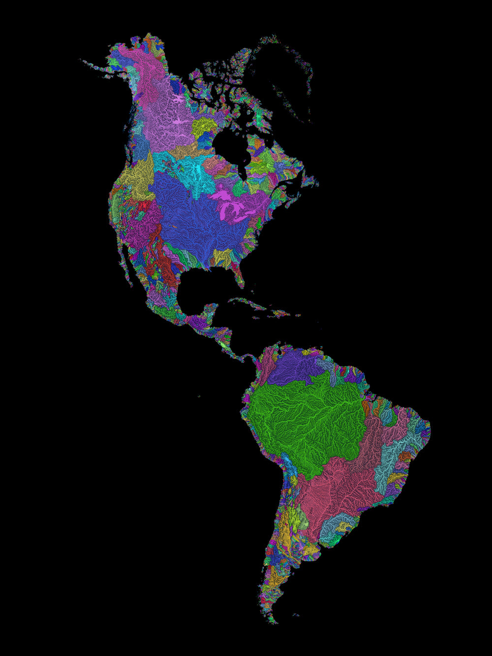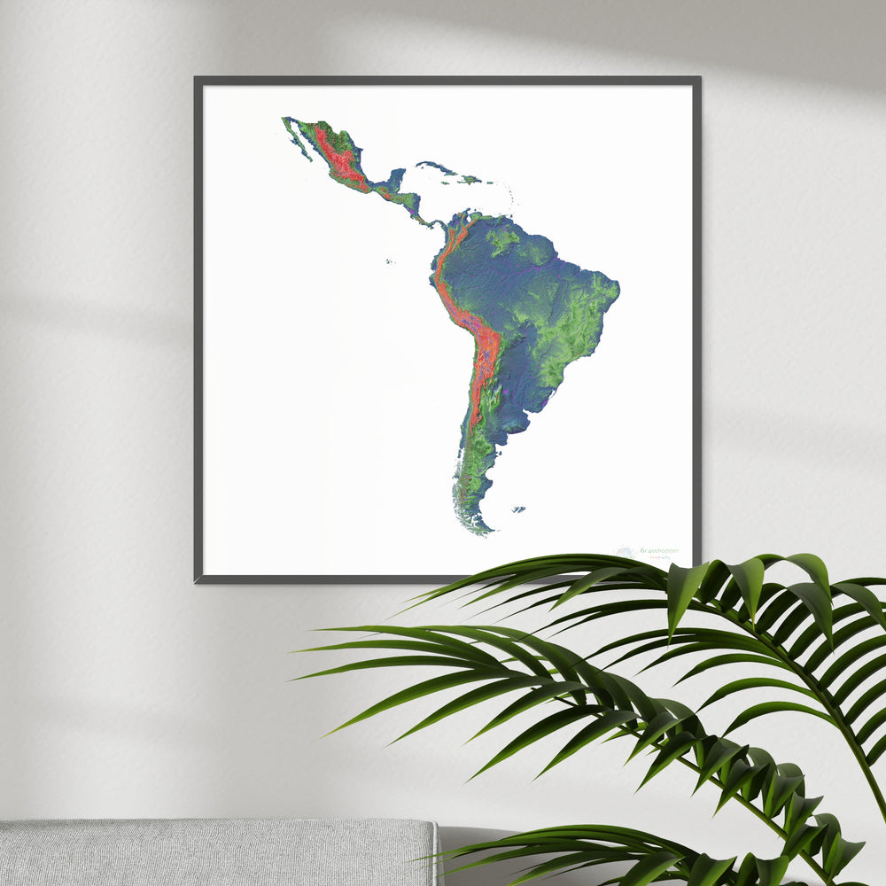 Carte d'élévation de l'Amérique du Sud avec fond blanc Fine Art Print. Carte d'élévation haute résolution dans une palette de couleurs unique, basée sur des modèles d'élévation numériques générés à partir de données satellite.
