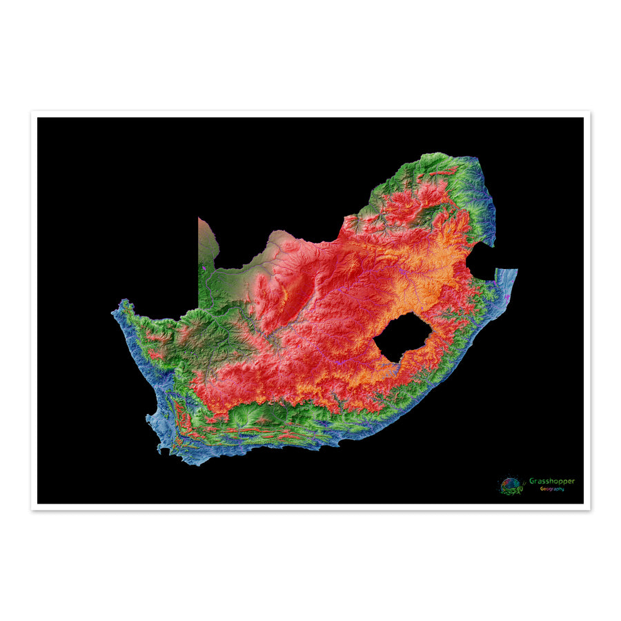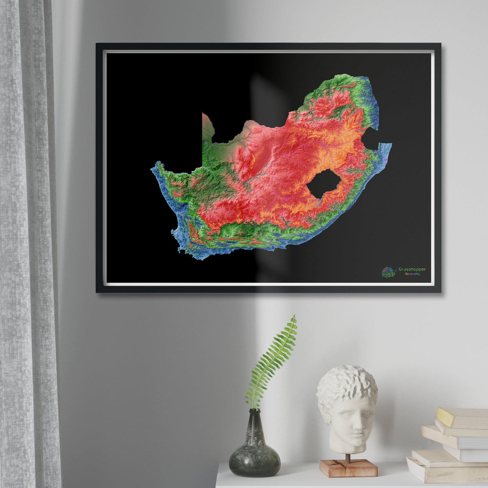 काले रंग की पृष्ठभूमि के साथ दक्षिण अफ़्रीका का ऊंचाई मानचित्र फाइन आर्ट प्रिंट। उपग्रह डेटा से उत्पन्न डिजिटल ऊंचाई मॉडल के आधार पर, एक अद्वितीय रंग योजना में उच्च रिज़ॉल्यूशन ऊंचाई मानचित्र।