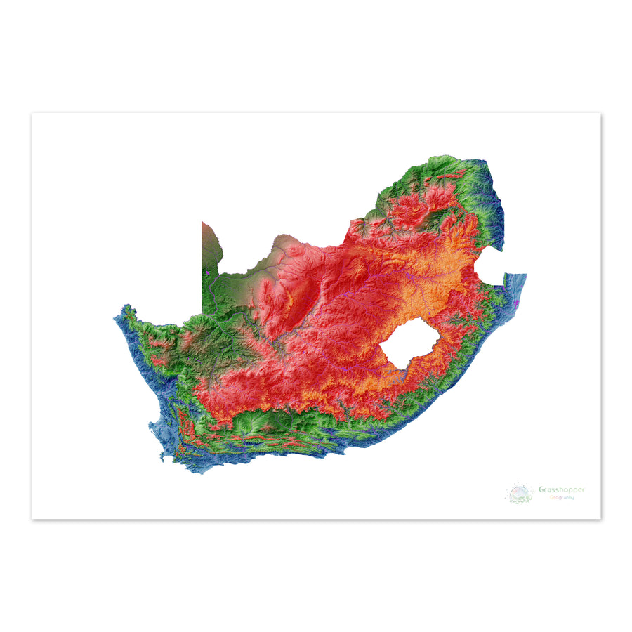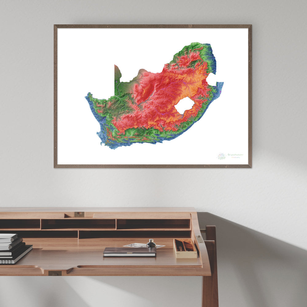 सफेद पृष्ठभूमि के साथ दक्षिण अफ्रीका का ऊंचाई मानचित्र फाइन आर्ट प्रिंट। उपग्रह डेटा से उत्पन्न डिजिटल ऊंचाई मॉडल के आधार पर, एक अद्वितीय रंग योजना में उच्च संकल्प ऊंचाई मानचित्र।