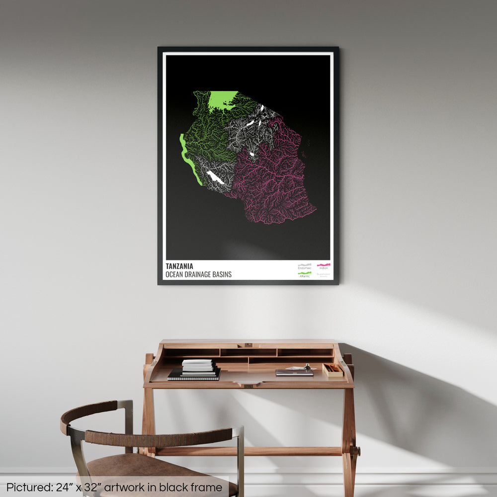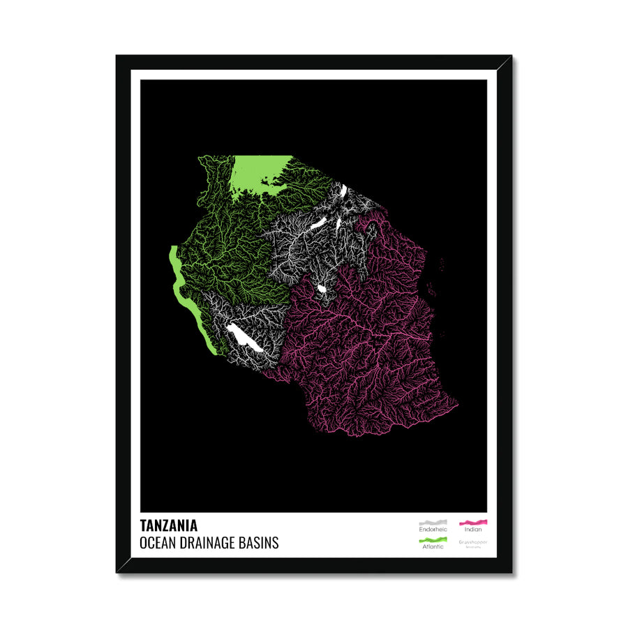 तंजानिया - महासागर जल निकासी बेसिन मानचित्र, लेजेंड v1 के साथ काला - फ़्रेमयुक्त प्रिंट