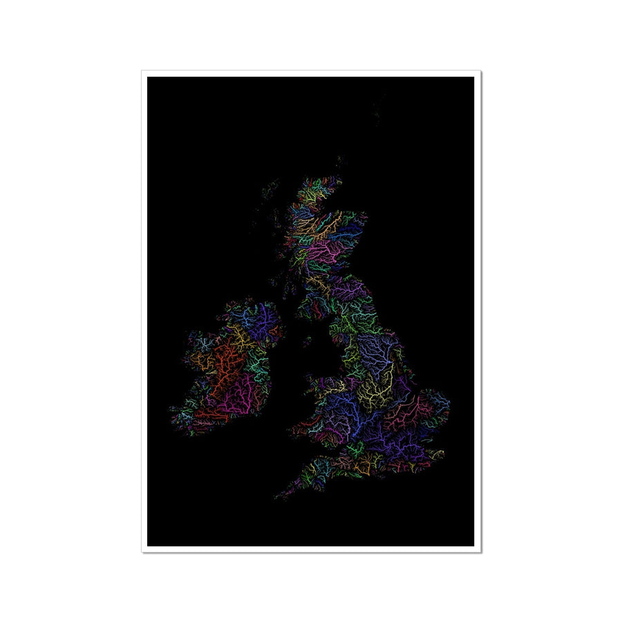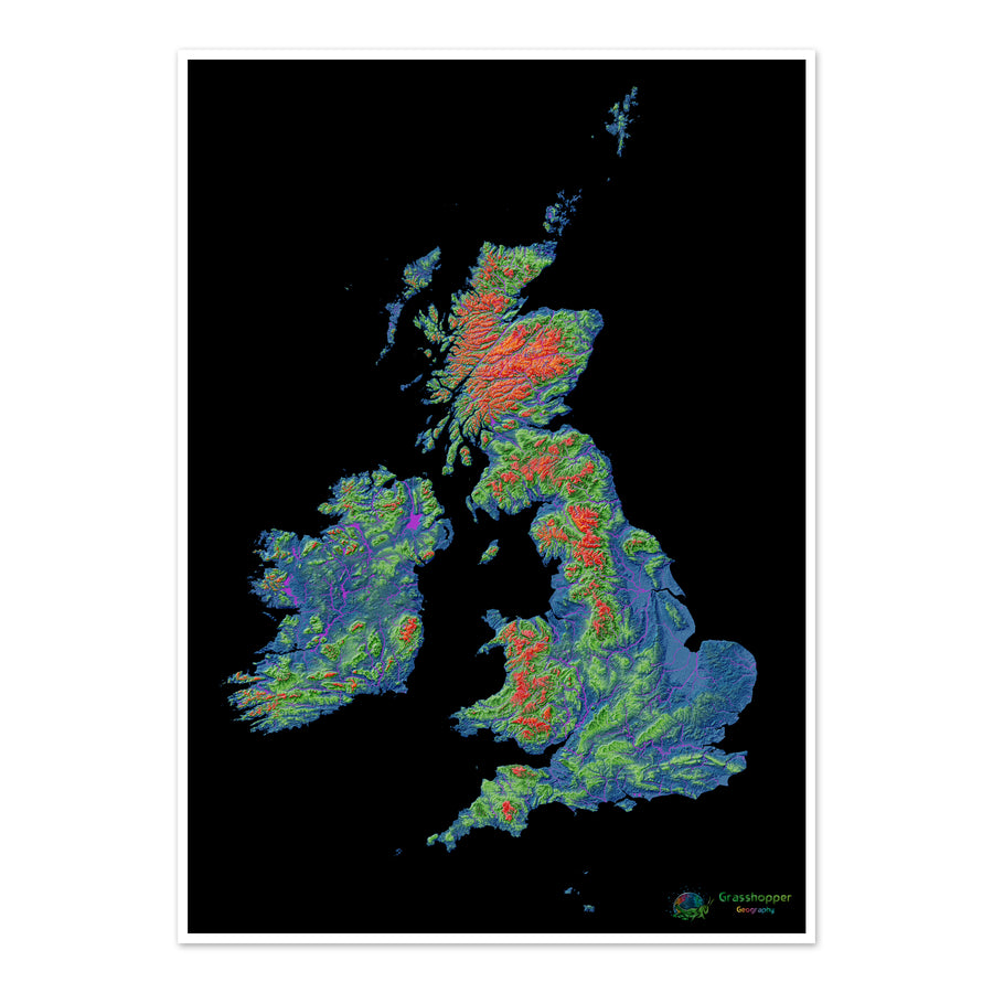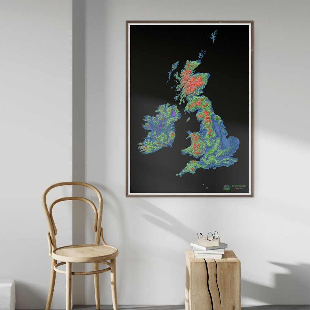 ब्रिटिश द्वीपों का काली पृष्ठभूमि वाला ऊंचाई मानचित्र फाइन आर्ट प्रिंट। उपग्रह डेटा से उत्पन्न डिजिटल ऊंचाई मॉडल के आधार पर, एक अद्वितीय रंग योजना में उच्च रिज़ॉल्यूशन ऊंचाई मानचित्र।