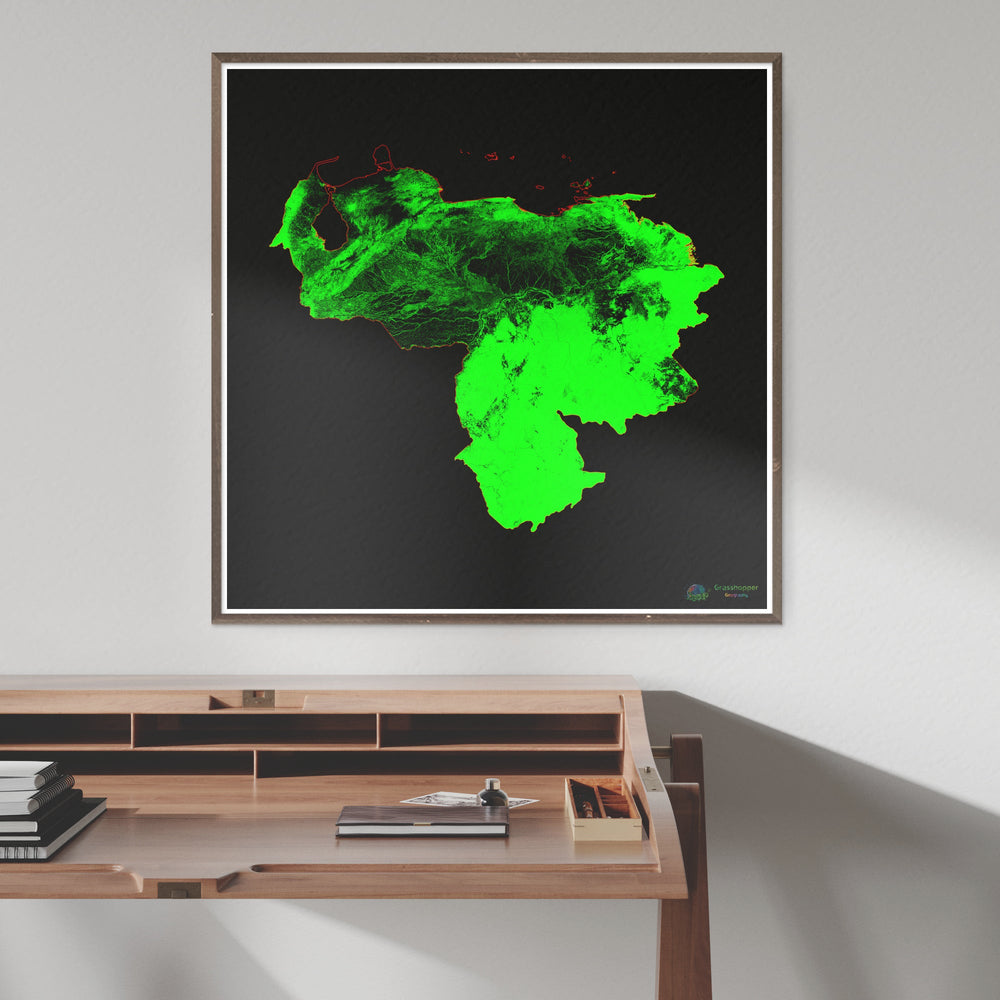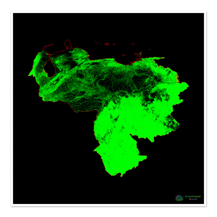 वेनेजुएला के वन आवरण मानचित्र फाइन आर्ट प्रिंट। उपग्रह डेटा के विश्लेषण पर आधारित उच्च रिज़ॉल्यूशन वाला वृक्ष आवरण मानचित्र, जिसमें वनस्पति से प्रतिबिंब का पता लगाने और पहचानने के लिए विशिष्ट सेंसर बनाए गए हैं।