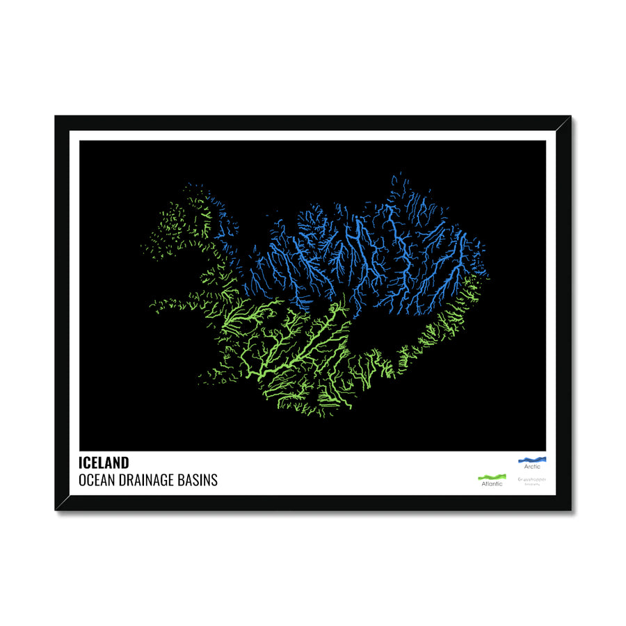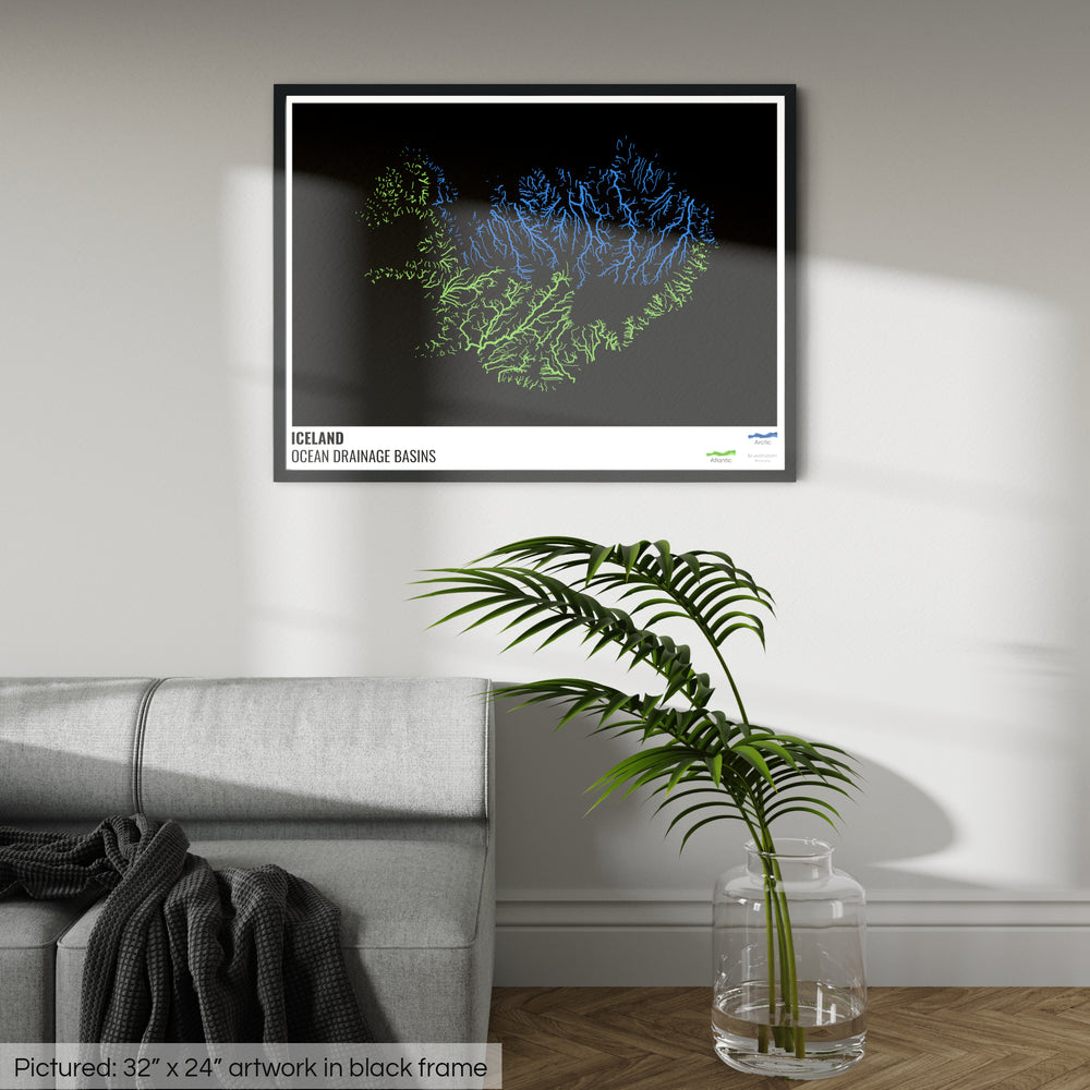 आइसलैंड - महासागर जल निकासी बेसिन मानचित्र, लेजेंड v1 के साथ काला - फ़्रेमयुक्त प्रिंट