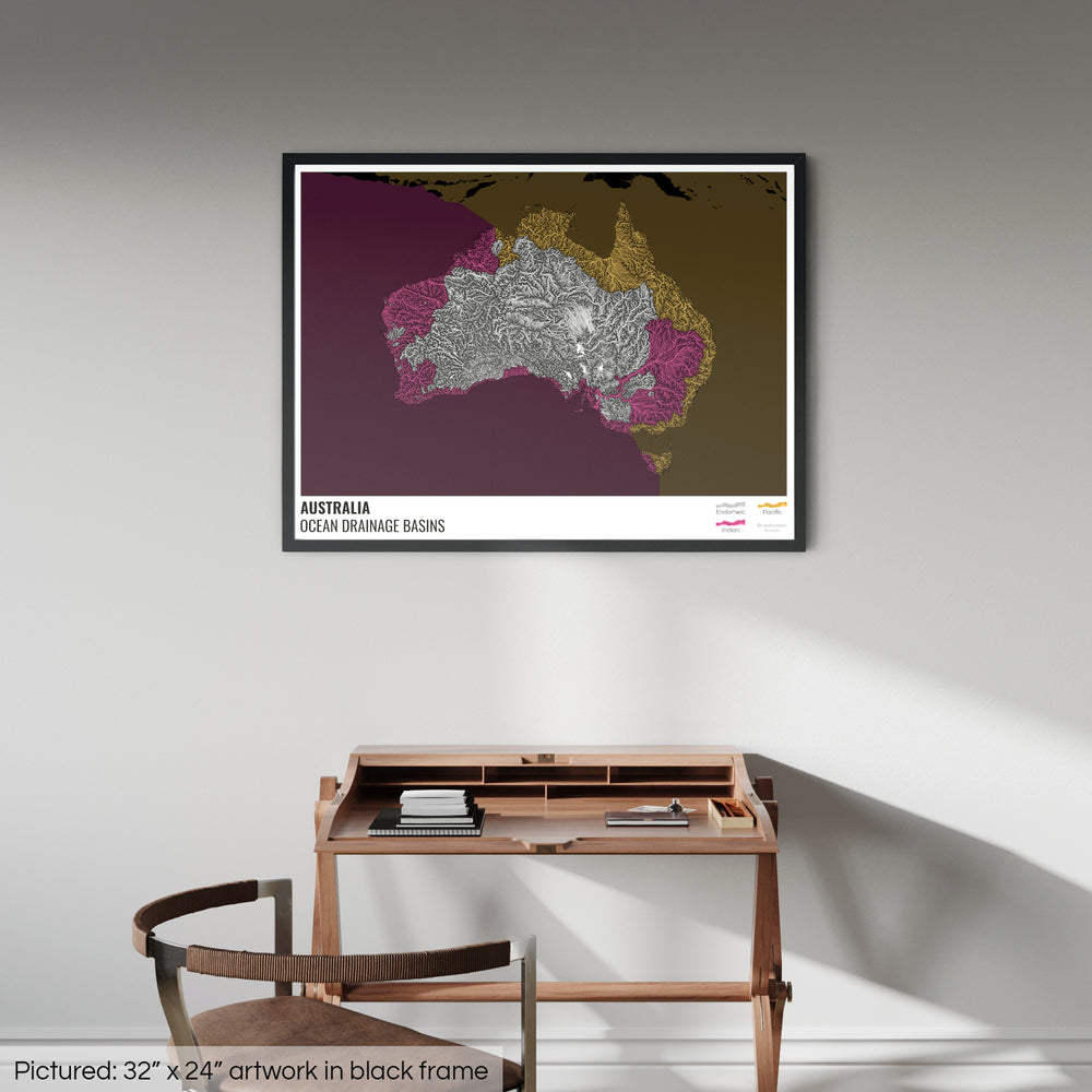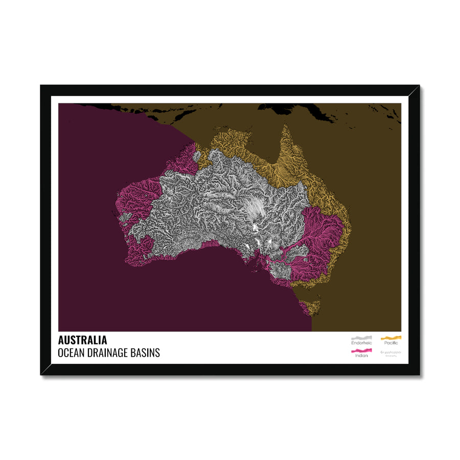 ऑस्ट्रेलिया - महासागर जल निकासी बेसिन मानचित्र, लेजेंड v2 के साथ काला - फ़्रेमयुक्त प्रिंट