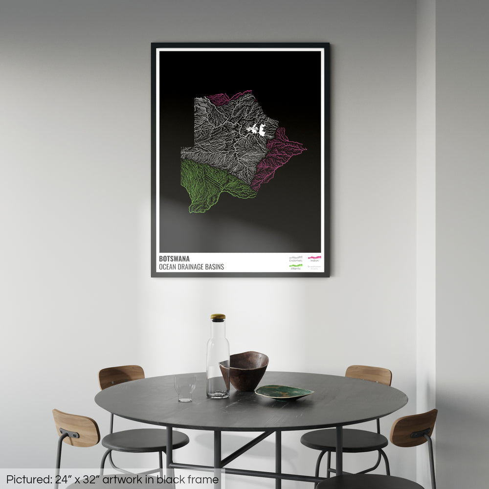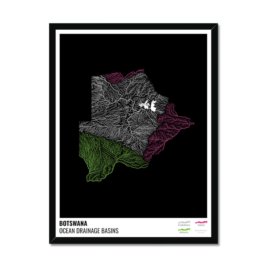 बोत्सवाना - महासागर जल निकासी बेसिन मानचित्र, लेजेंड v1 के साथ काला - फ़्रेमयुक्त प्रिंट