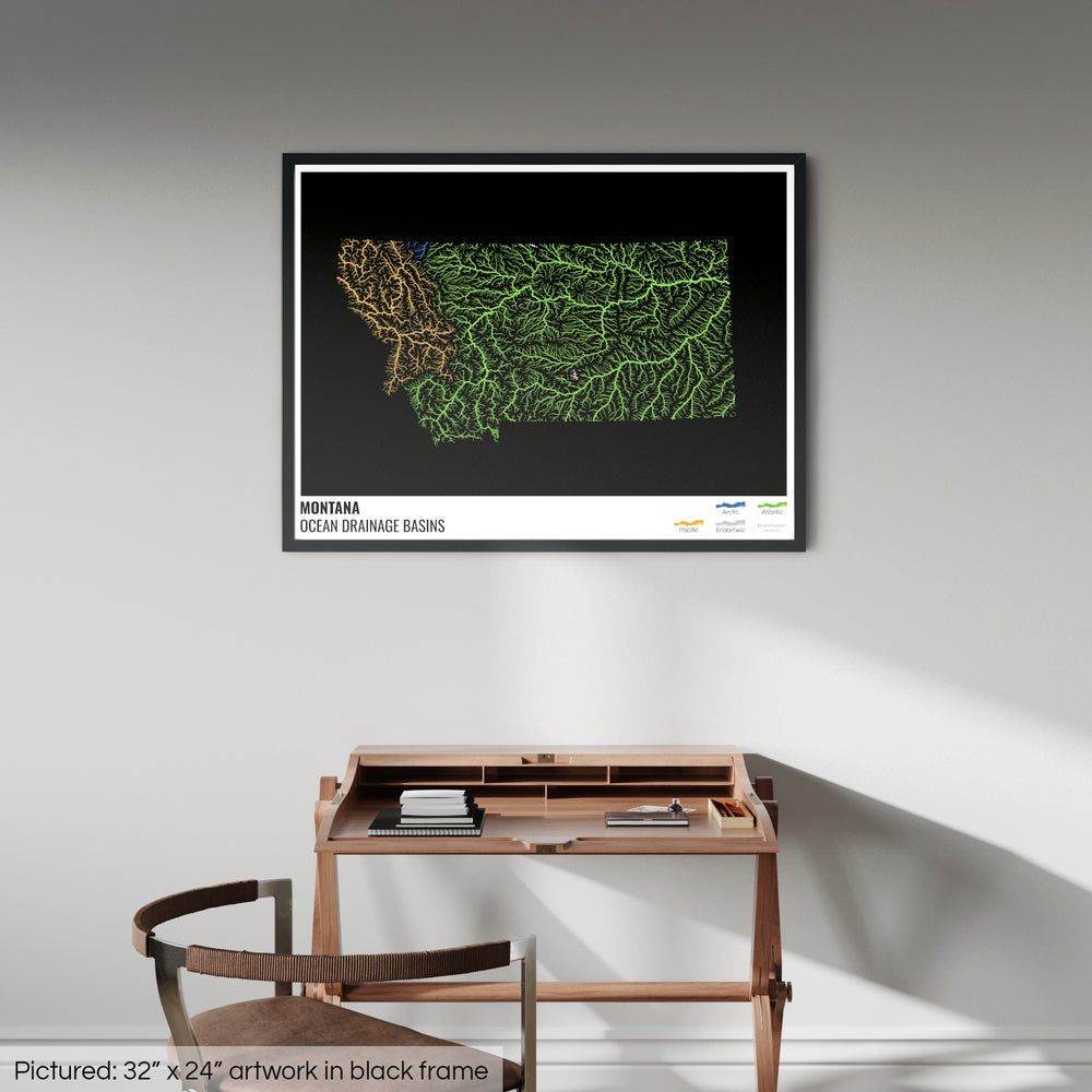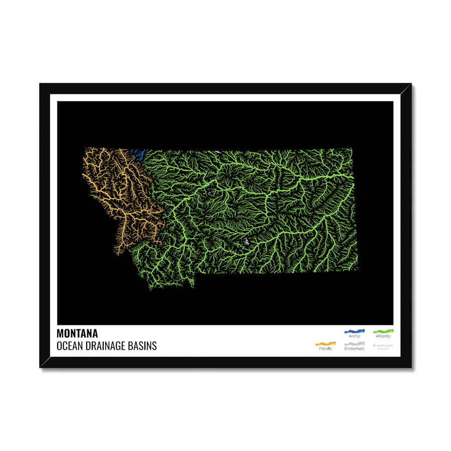 मोंटाना - महासागर जल निकासी बेसिन मानचित्र, लेजेंड v1 के साथ काला - फ़्रेमयुक्त प्रिंट