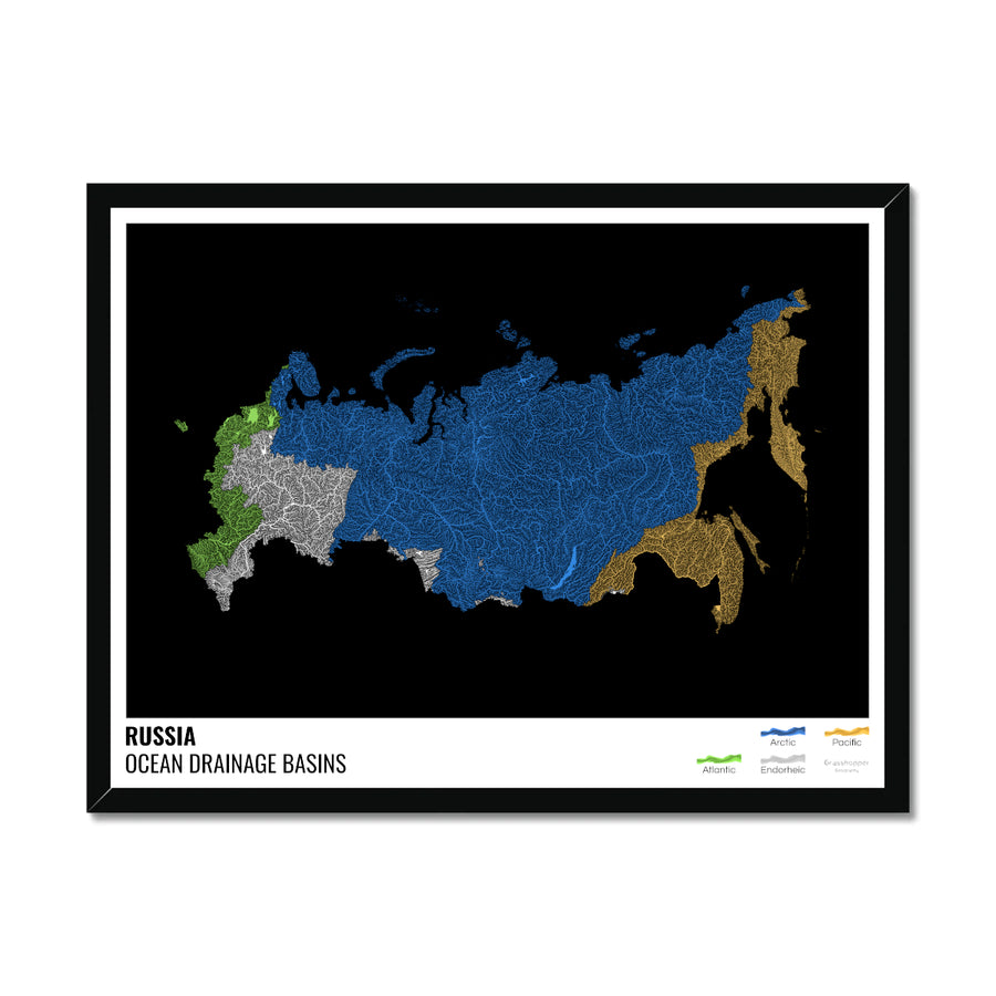 रूस - महासागर जल निकासी बेसिन मानचित्र, लेजेंड v1 के साथ काला - फ़्रेमयुक्त प्रिंट