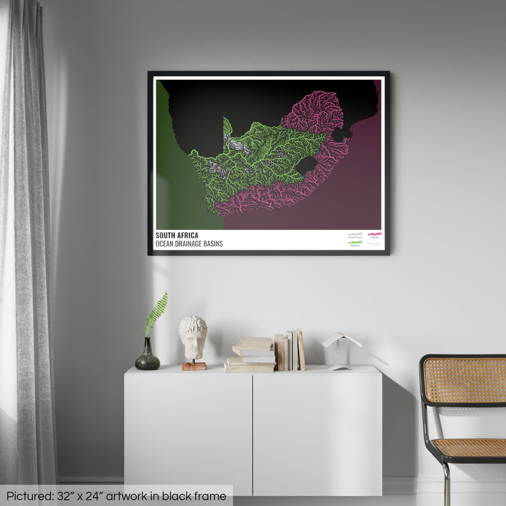 दक्षिण अफ़्रीका - महासागर जल निकासी बेसिन मानचित्र, लेजेंड v2 के साथ काला - फ़्रेमयुक्त प्रिंट