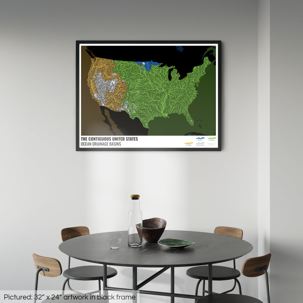 संयुक्त राज्य अमेरिका - महासागर जल निकासी बेसिन मानचित्र, लेजेंड v2 के साथ काला - फ़्रेमयुक्त प्रिंट