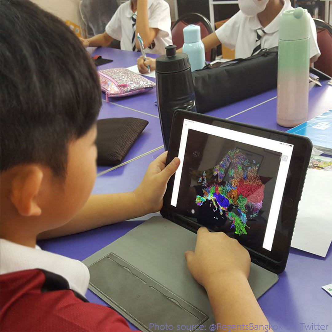 हमारे मानचित्र 2019 में बैंकॉक के एक स्कूल में 5वीं कक्षा के छात्रों को नदी घाटियों को समझने में मदद कर रहे हैं।