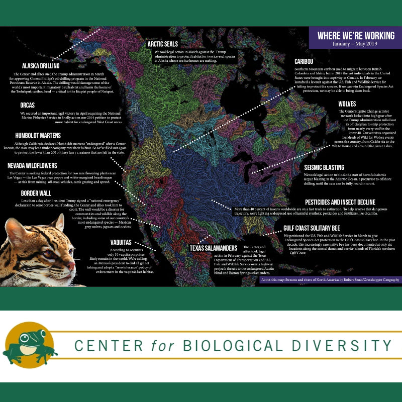 जैविक विविधता केंद्र विज्ञान, कानून और रचनात्मक मीडिया के माध्यम से वन्यजीवों और जंगली स्थानों के भविष्य को सुरक्षित करने के लिए काम करता है। उन्होंने अपने न्यूज़लेटर में एक सुंदर इन्फोग्राफ़िक के लिए हमारे उत्तरी अमेरिका नदी बेसिन मानचित्र का उपयोग किया।