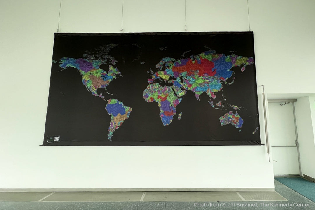प्रदर्शन पर: विश्व का नदी बेसिन मानचित्र (कपड़ा, लगभग 6 मीटर x 4 मीटर)